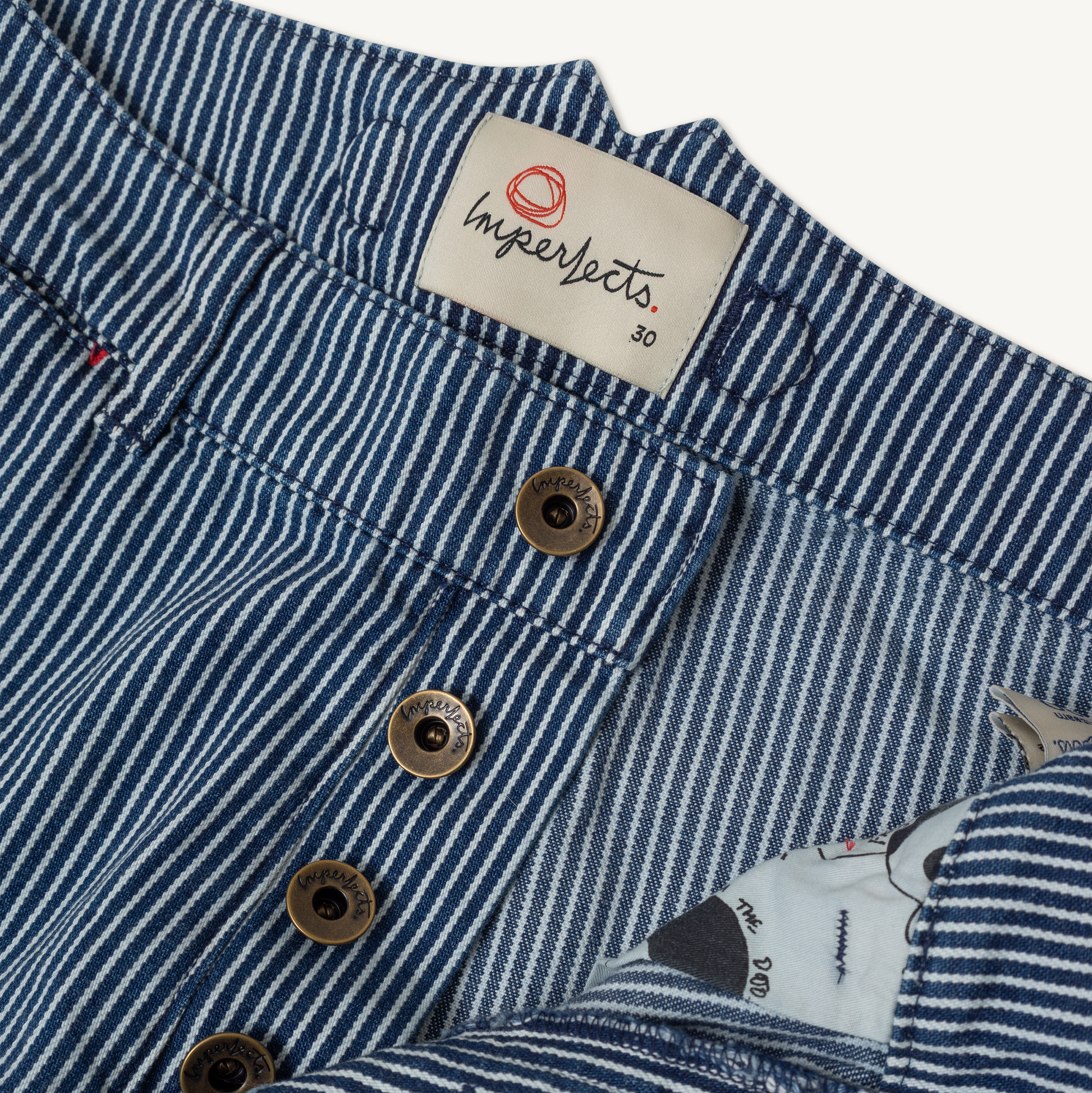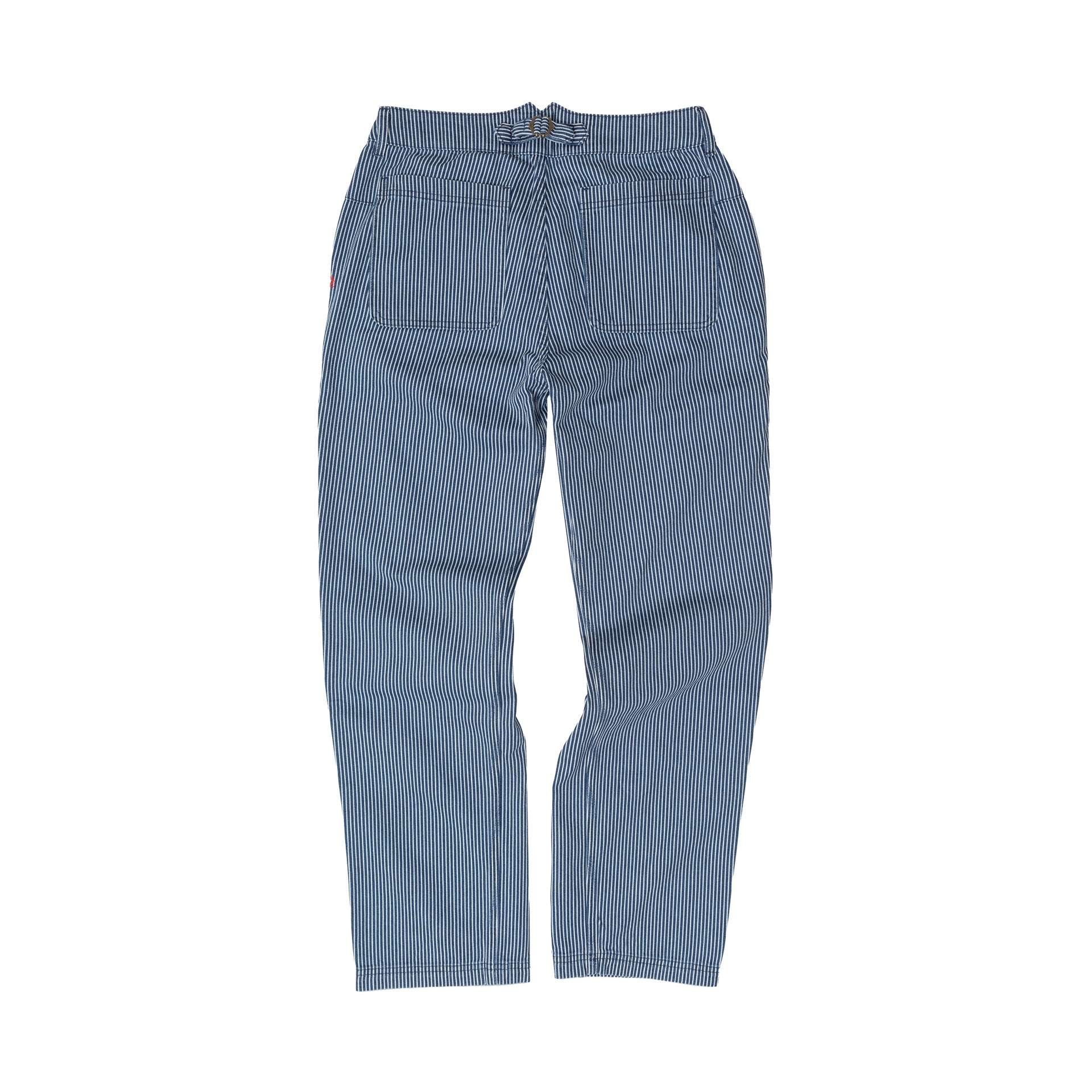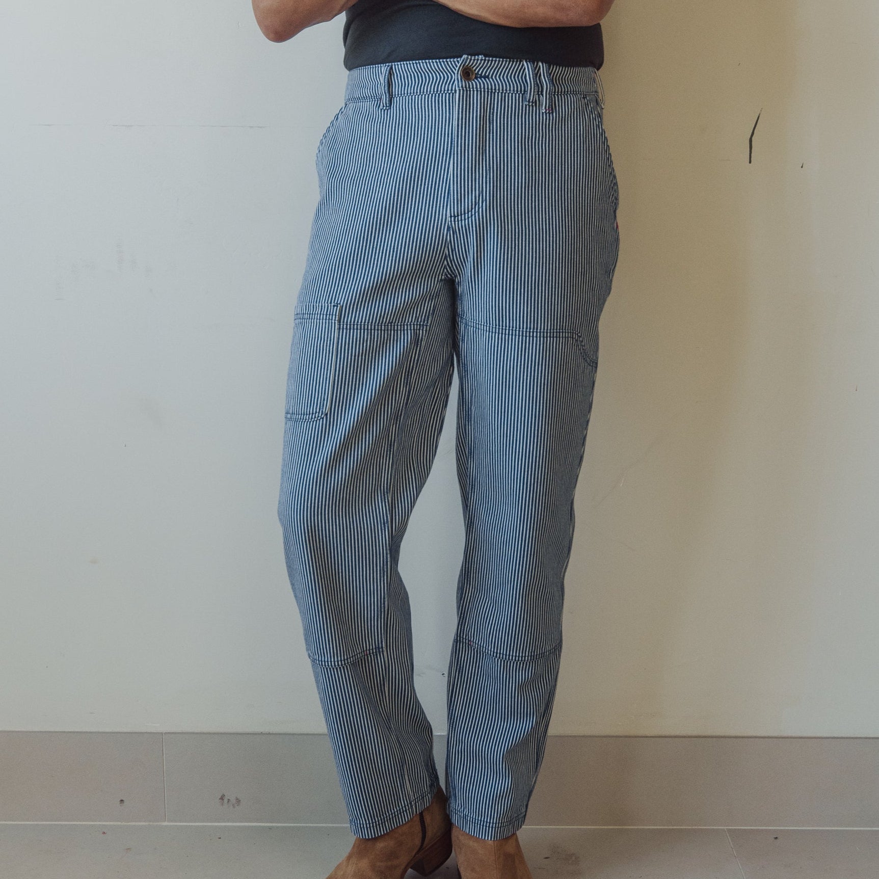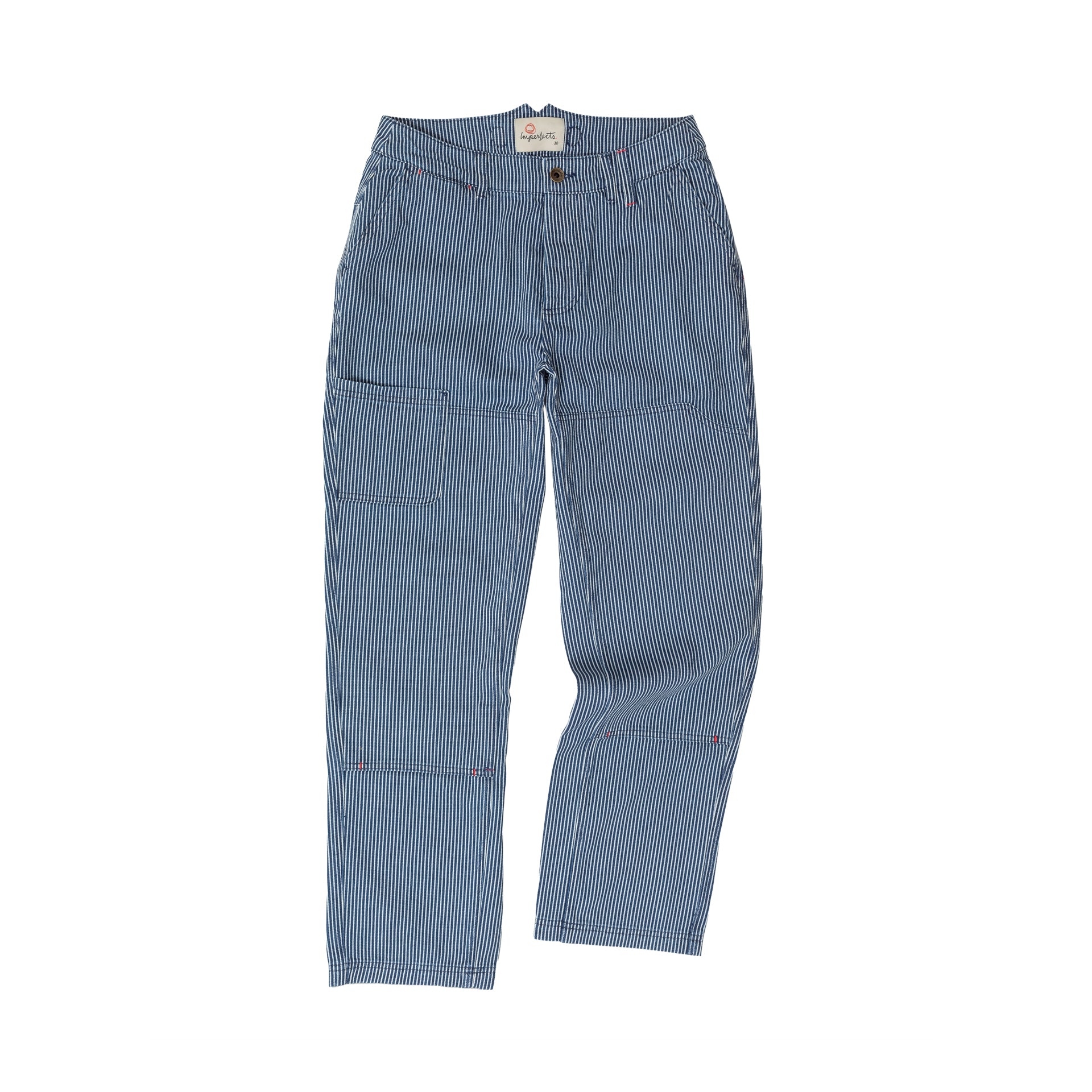 Classic indigo hickory stripes meet reinforced knees and everyday utility.