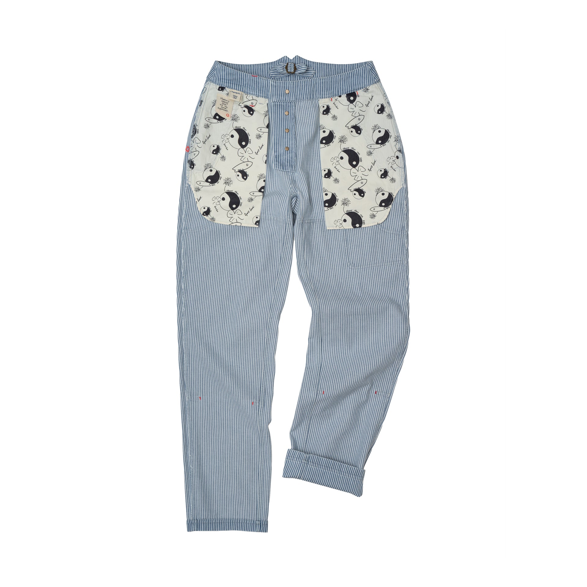The Courier Pant in Indigo Hickory Stripe takes classic workwear DNA and spins it with a vintage nod and smart utility that feels intentional every time you wear them. Built from a 9.6 oz indigo hickory stripe jacquard woven cotton, they carry an effortless, lived-in vibe straight out of the box while staying rugged enough for daily use. A swallowtail waistband and French brass buckle let you fine tune the fit without a belt, while triple-needle felled seams, reinforced knee panels, and a full gusset mean movement and durability are built in, not bolted on. Signature utility details like a thigh phone pocket, hidden coin stash, and dual belt/ key loops, keep gear exactly where you want it. These pants aren’t just choresome; they’re a stylish workhorse with character and purpose.