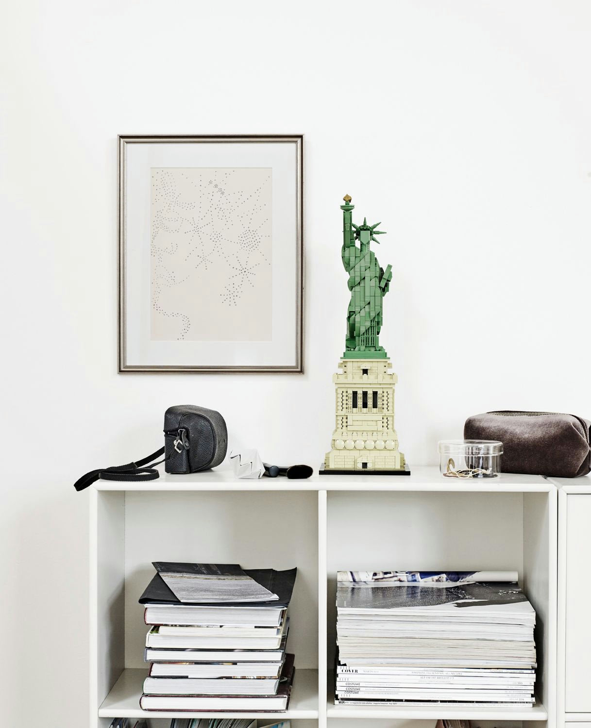A gift from the people of France to the people of the United States, the Statue of Liberty was designed by Frédéric Bartholdi, built by Gustave Eiffel, and has stood as a symbol of America, 305 feet above New York harbor, since its dedication in 1886. Containing over 1,685 LEGO pieces, this State of Liberty building set lets you recreate this iconic monument for display in your own home. The intricate LEGO Architecture set includes details like the a pedestal with shield, brick, and column details, a flowing robe, 7-ray crown, broken shackles, tablet, and upraised torch. Finished with a decorative nameplate, it stands over 17" high, 5" wide, and 5" deep when completed.