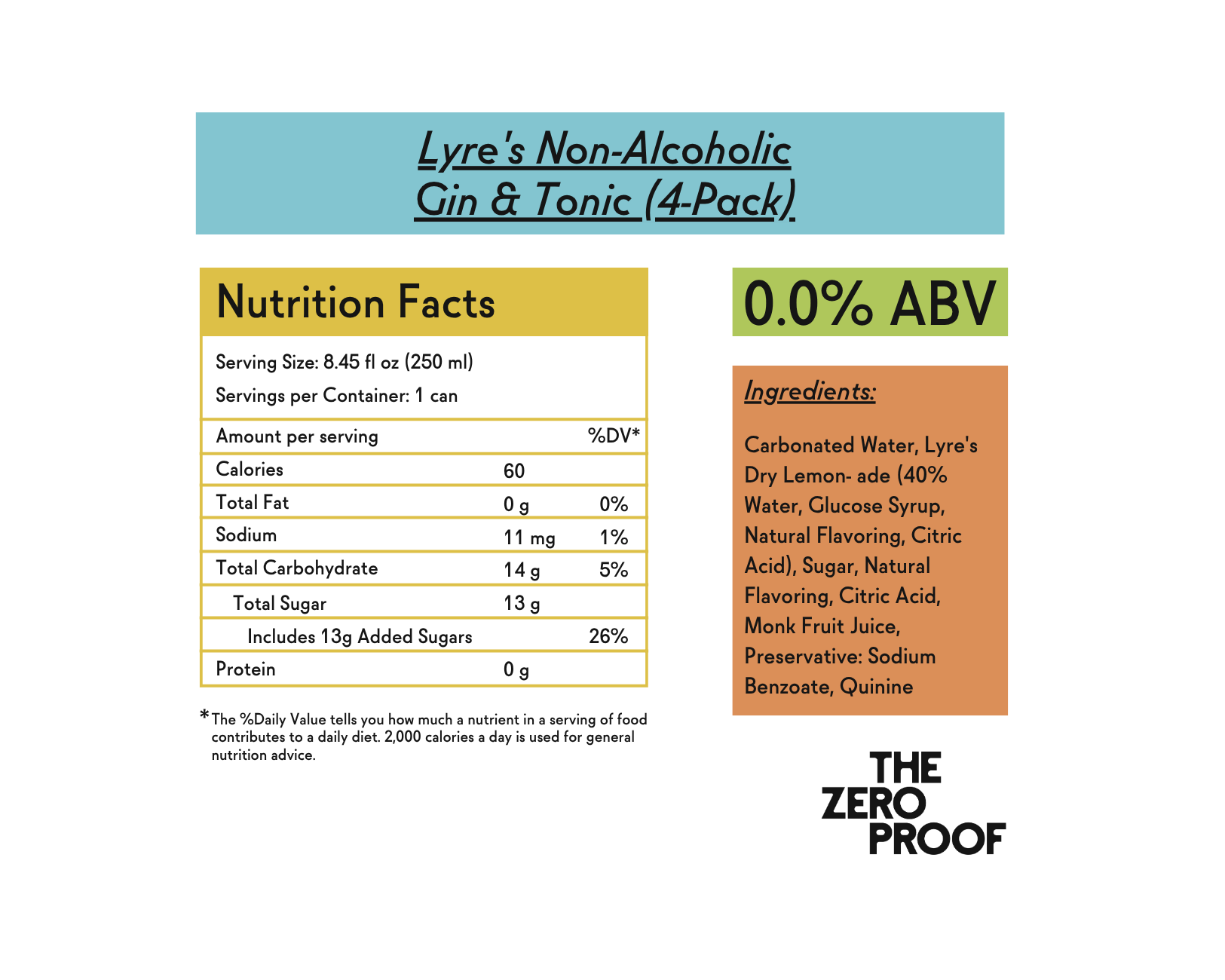A sophisticated spin on the classic G&T, this non-alcoholic version from Lyre's delivers crisp refreshment without compromise. Notes of orange blossom, citrus, jasmine, and pepper lead into a balanced mix of juniper and bright citrus, finishing dry and clean. Sip it from the can or pour it over ice with a garnish for a refreshing, guilt-free beverage.