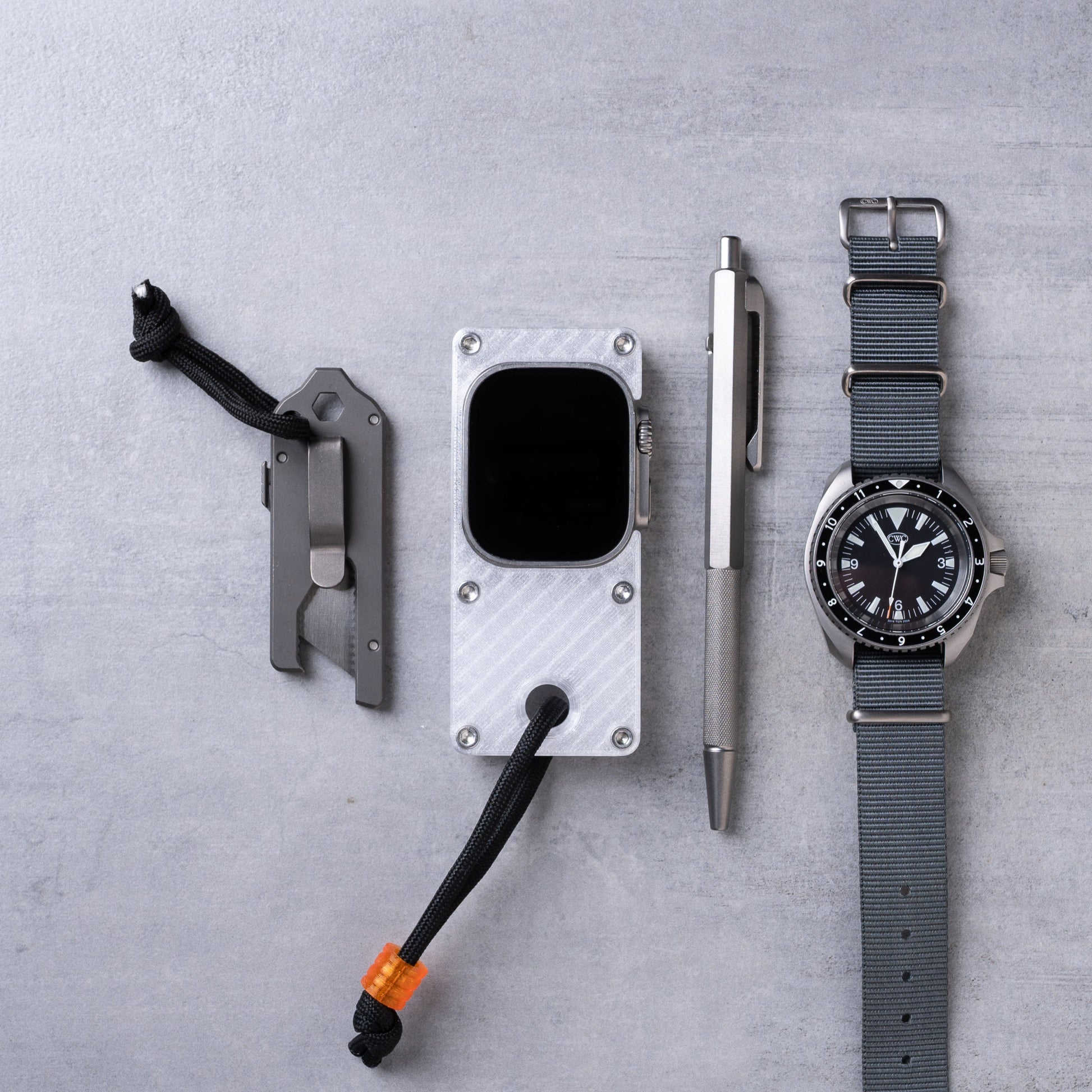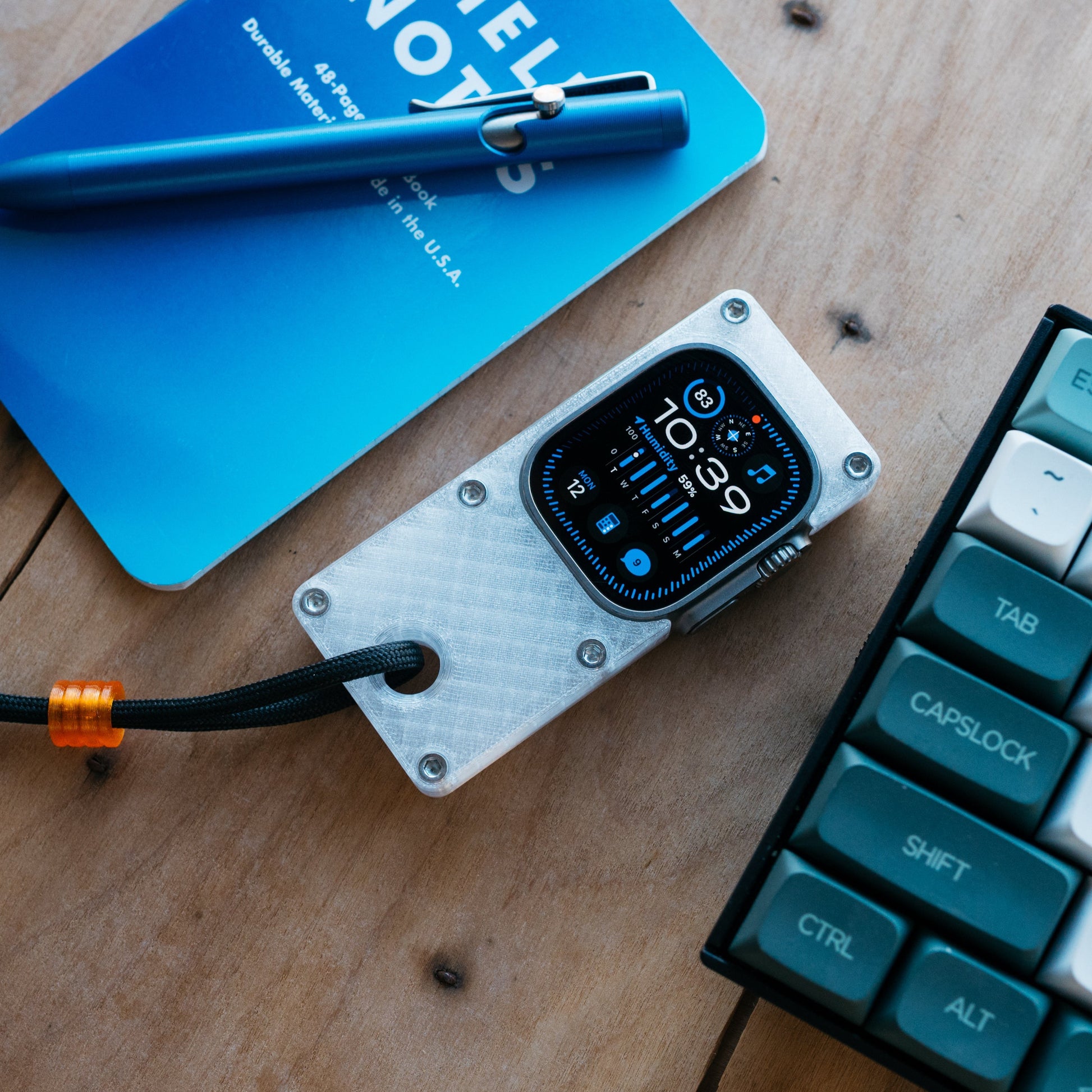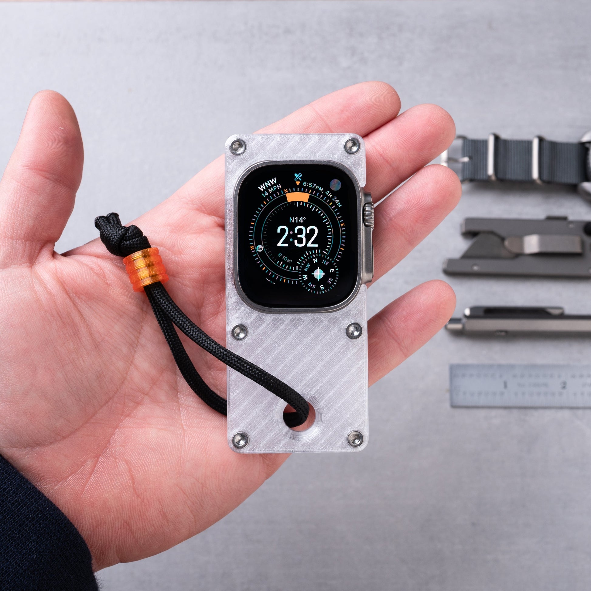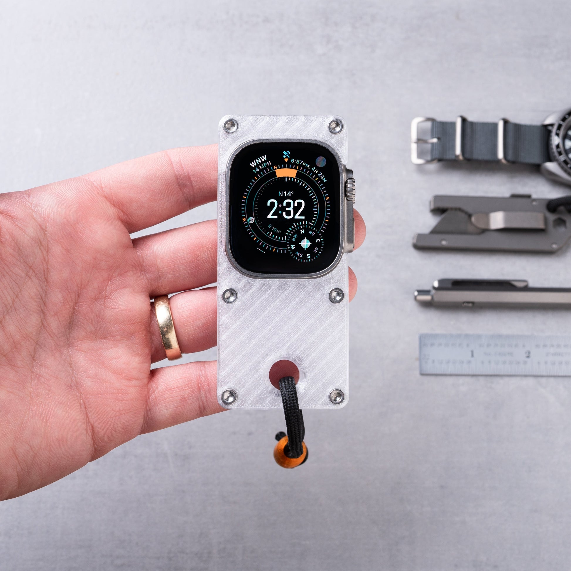 maybe sometimes a phone is too much and you just need to get by with the essentials. this case makes your Apple Watch Ultra more comfortable to hold in hand and use like a small smart device, while freeing up your wrist for you know, a real watch.