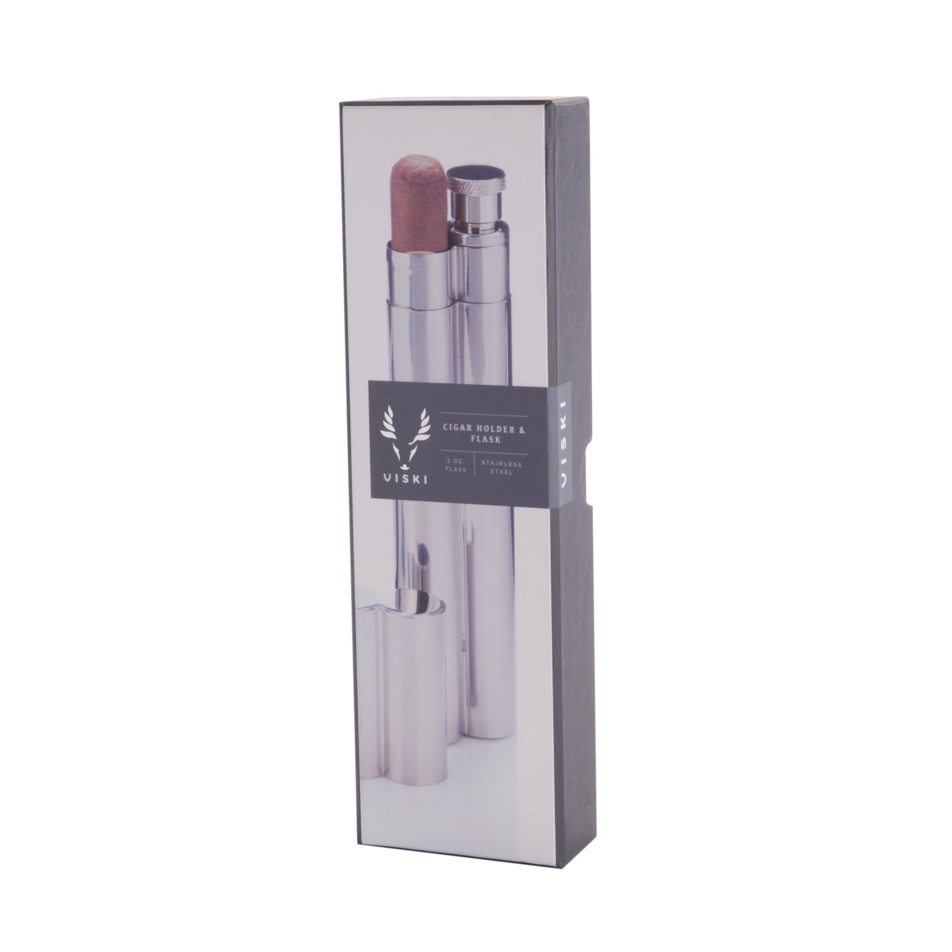 This stainless steel cigar holder and flask pairs a 52-gauge cigar with two ounces of whiskey for classic indulgence on the go.