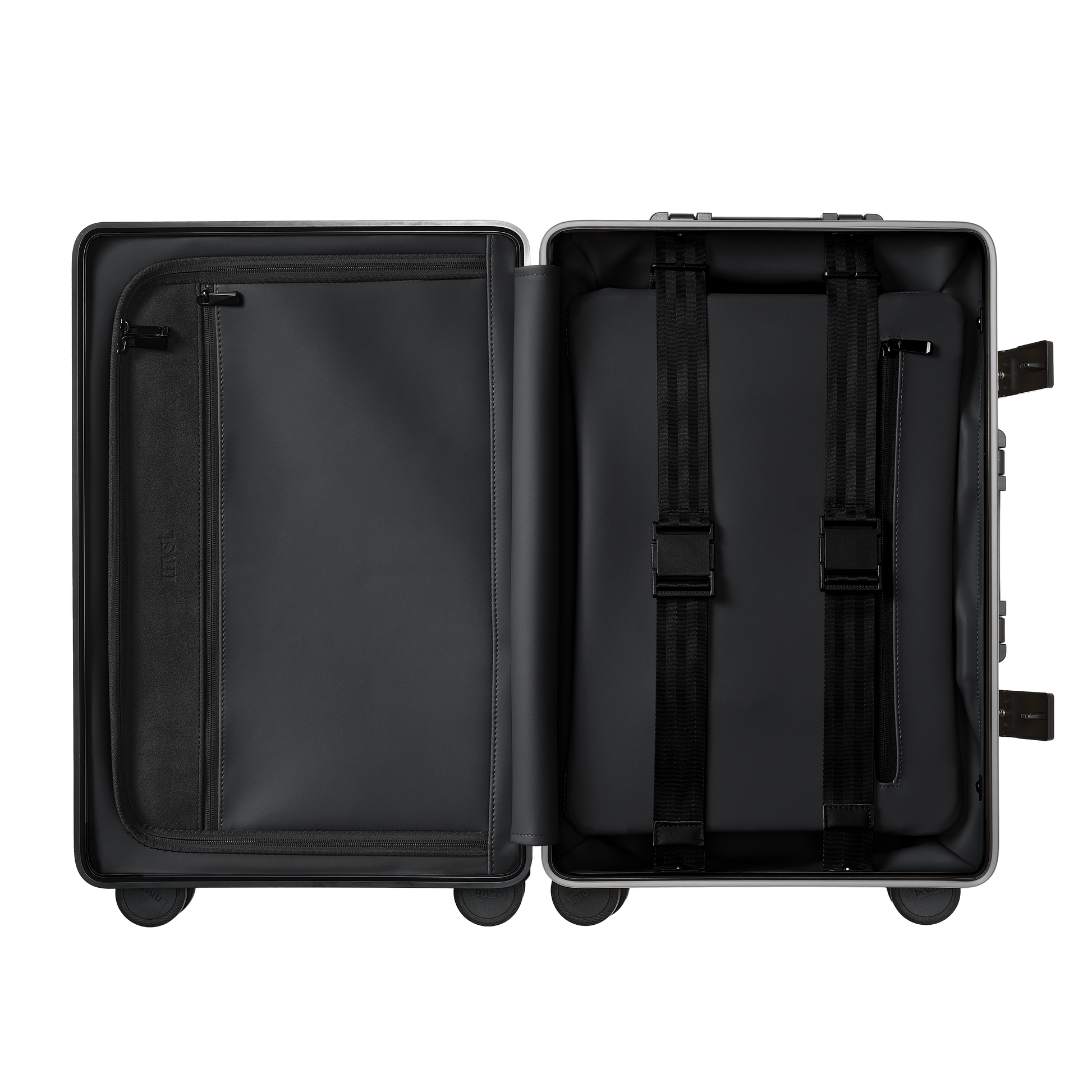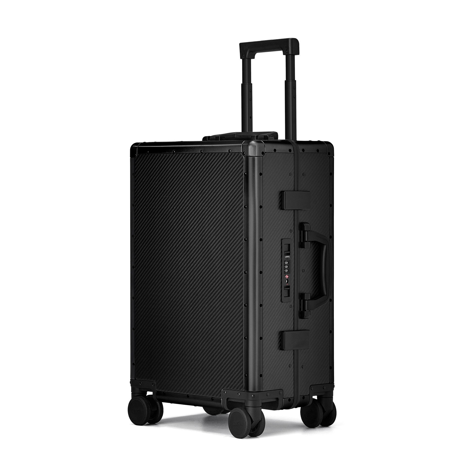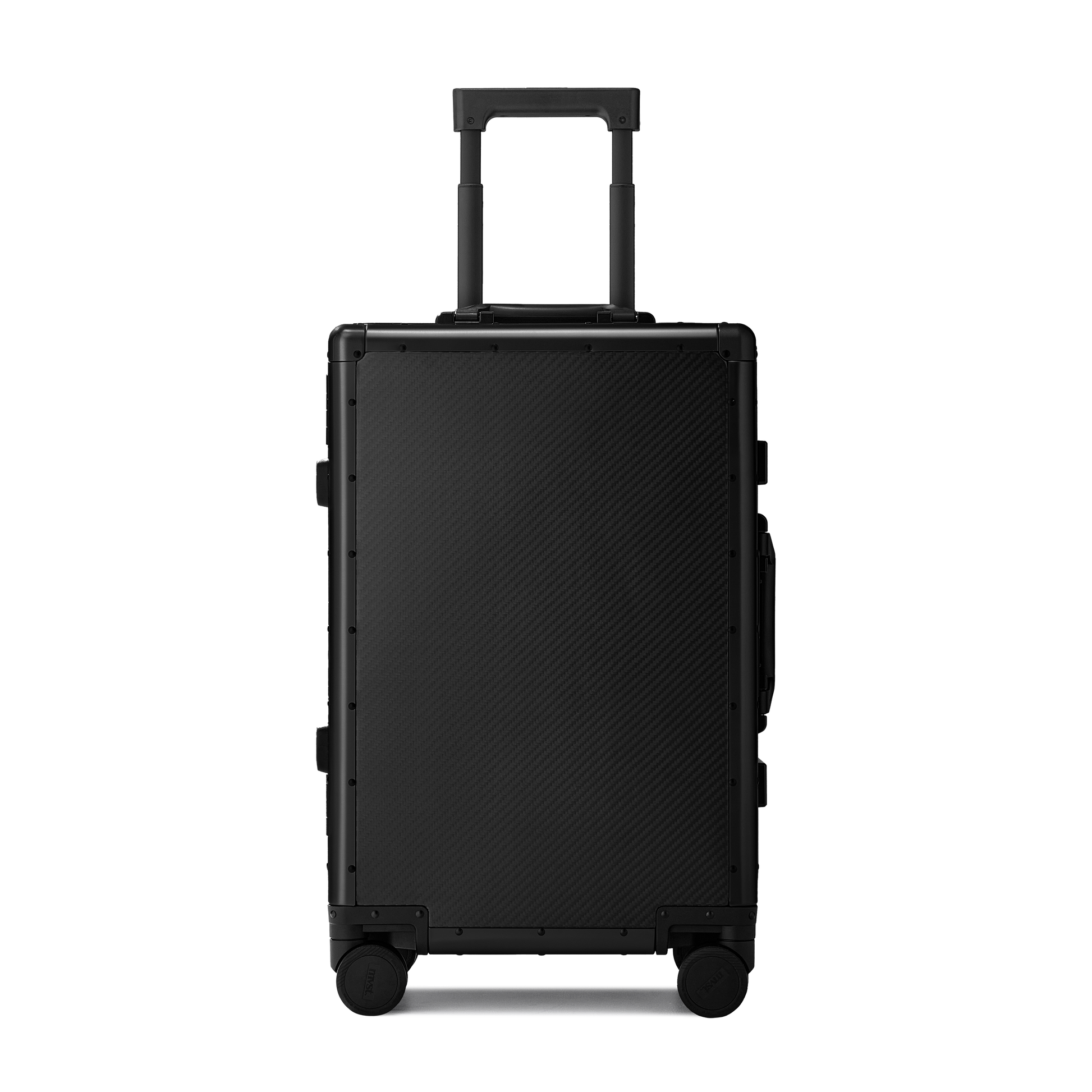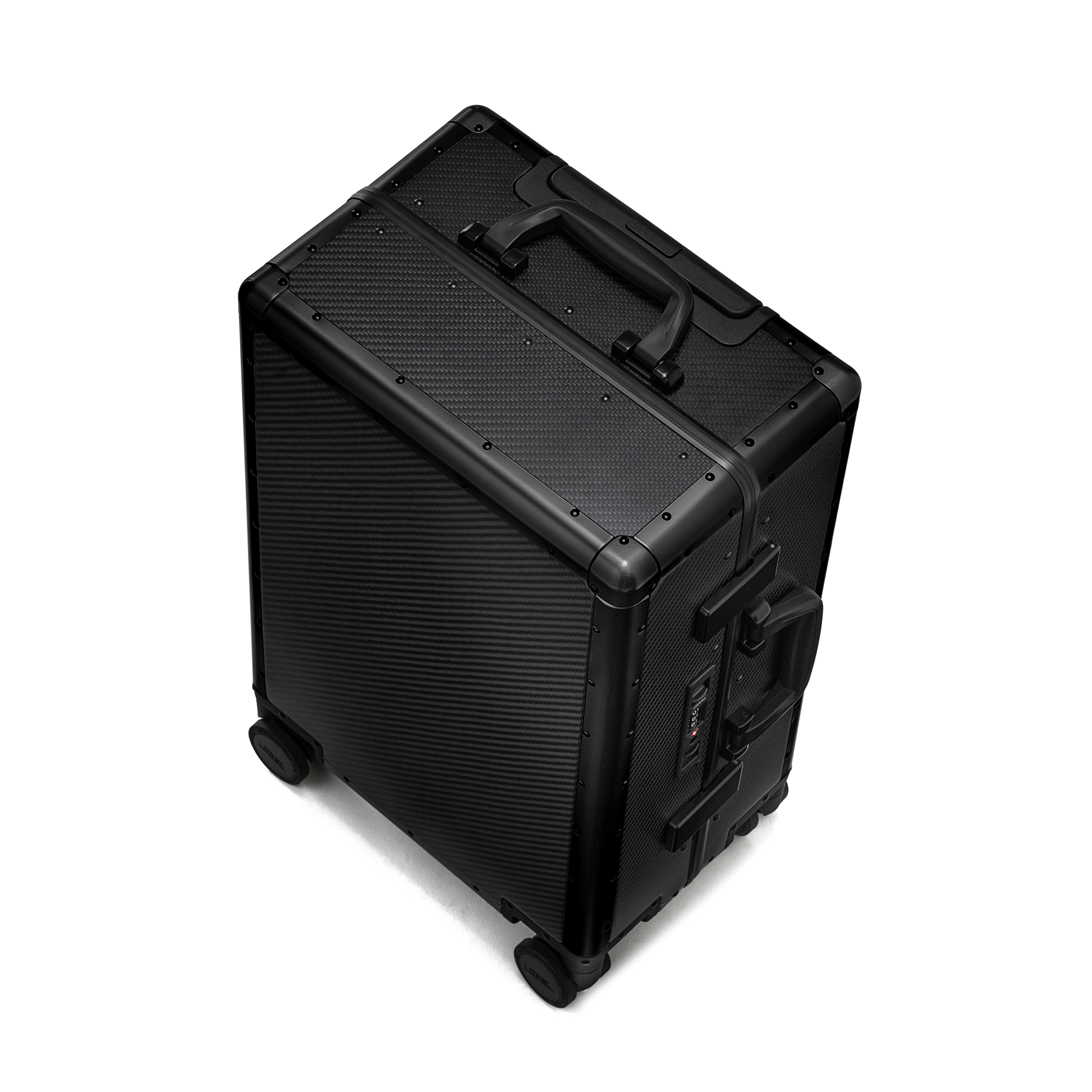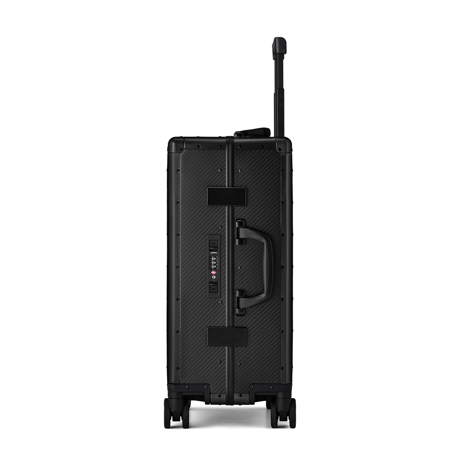 Military-grade carbon fiber forms the shell, delivering serious impact resistance without excess weight. A frame built from 6-series anodized aluminum adds structural strength while keeping the build light enough for constant travel. Squared corners increase packing capacity and give the silhouette a sharper, more modern edge. Silent tri-bearing wheels roll smoothly through terminals and city streets with minimal noise. A telescopic aluminum handle provides a stable, comfortable grip in motion, while a TSA-approved combination lock keeps contents secure in transit. Inside, an Alter-Nappa leather lining organizes and protects gear with a clean, structured layout built for life on the move.
