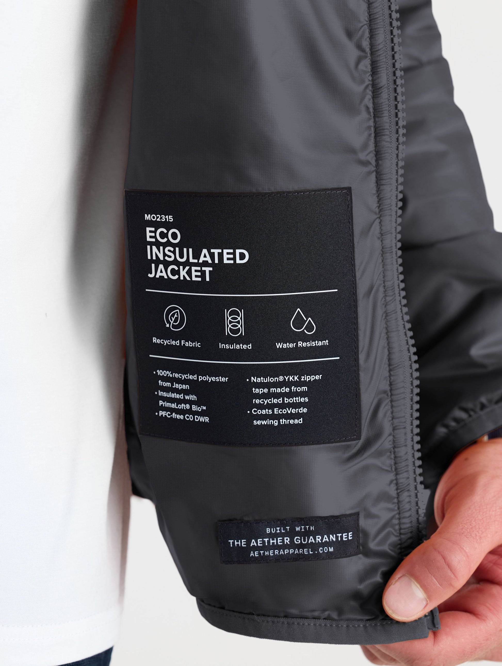 The Eco Insulated Jacket in Onyx Black brings refined sustainability to everyday performance. Its 100% recycled Japanese micro-ripstop shell is finished with a PFC-free DWR and filled with 60 g of PrimaLoft Bio insulation for lightweight, low-profile warmth. Recycled zippers, Coats Ecoverde stitching, and thoughtful detailing showcase AETHER’s commitment to responsible design. The streamlined silhouette keeps things sharp yet understated, ready for city streets or weekend escapes. In Onyx Black, it delivers quiet confidence—technical, timeless, and built to last.