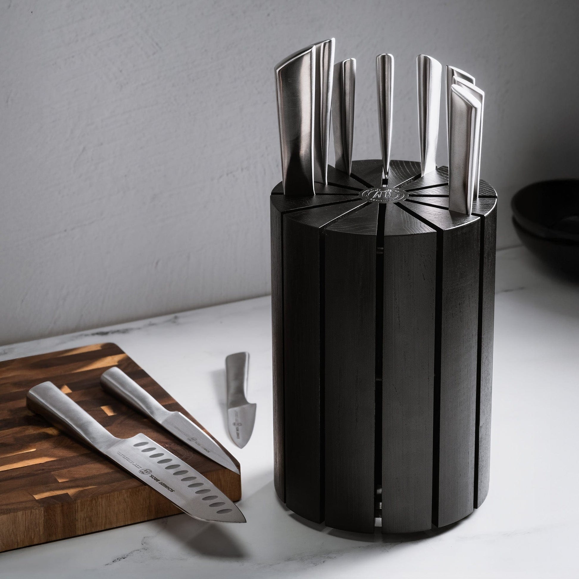This stunning set doesn’t just store your knives; it elevates them. With a harmonious fusion of forged steel knives and a sleek black ash wood block, the Giotto strikes the perfect balance between elegance and durability. Each knife features an elegant stainless-steel handle, meticulously crafted for optimal grip, balance, and an effortless cutting experience. The signature Schmidt Brothers Curve connects the handle and blade to enhance control and precision, making every cut seamless and controlled.