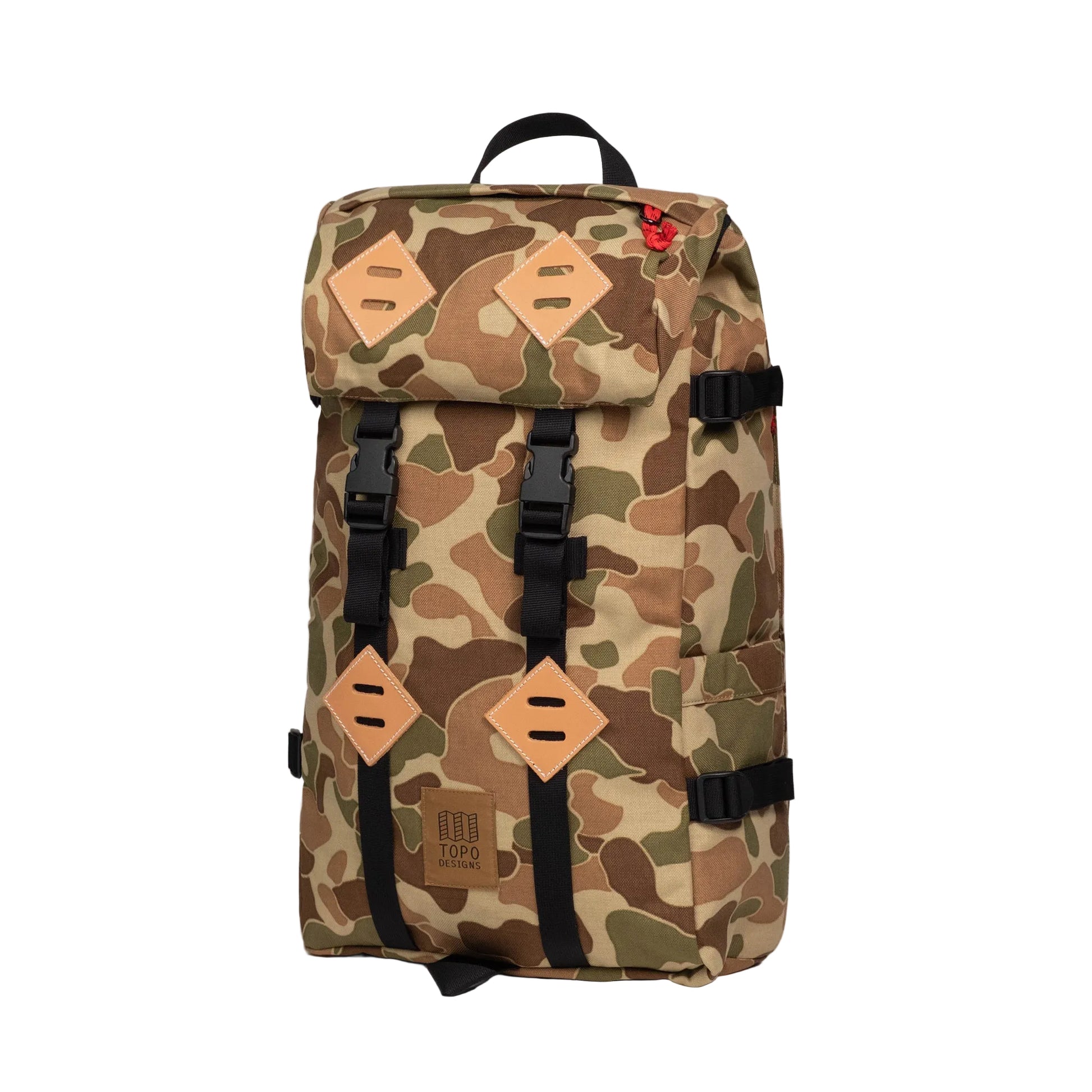 Topo blends classic style with rugged duck camo nylon for versatile on-the-go carry.