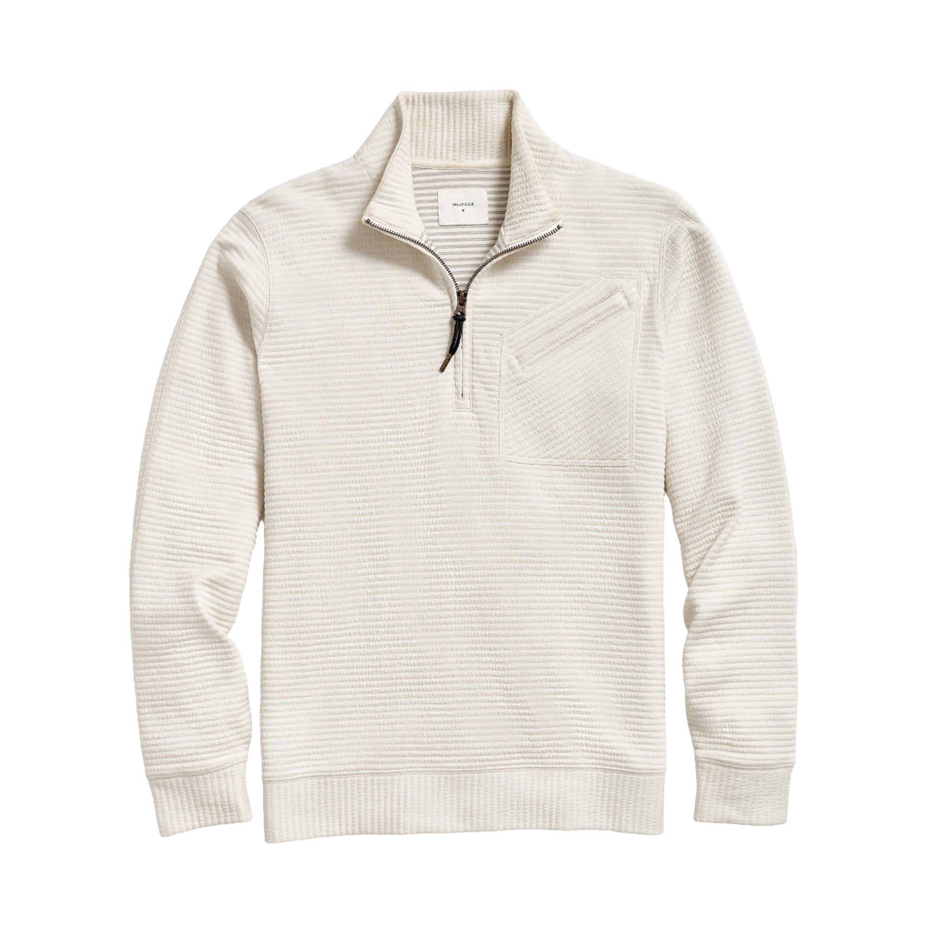 The Quilted Half Zip redefines lightweight layering with purposeful design and quiet refinement. Crafted from a soft cotton blend in Peru, it features a tonal quilted stripe that adds subtle texture and depth. An asymmetrical chest pocket introduces a functional detail, while vintage-inspired elbow patches and twill tape reinforcement highlight its craftsmanship. Finished with Billy Reid's signature ribbon trim along the zipper and cord puller, it's a versatile piece designed to transition effortlessly through the seasons.