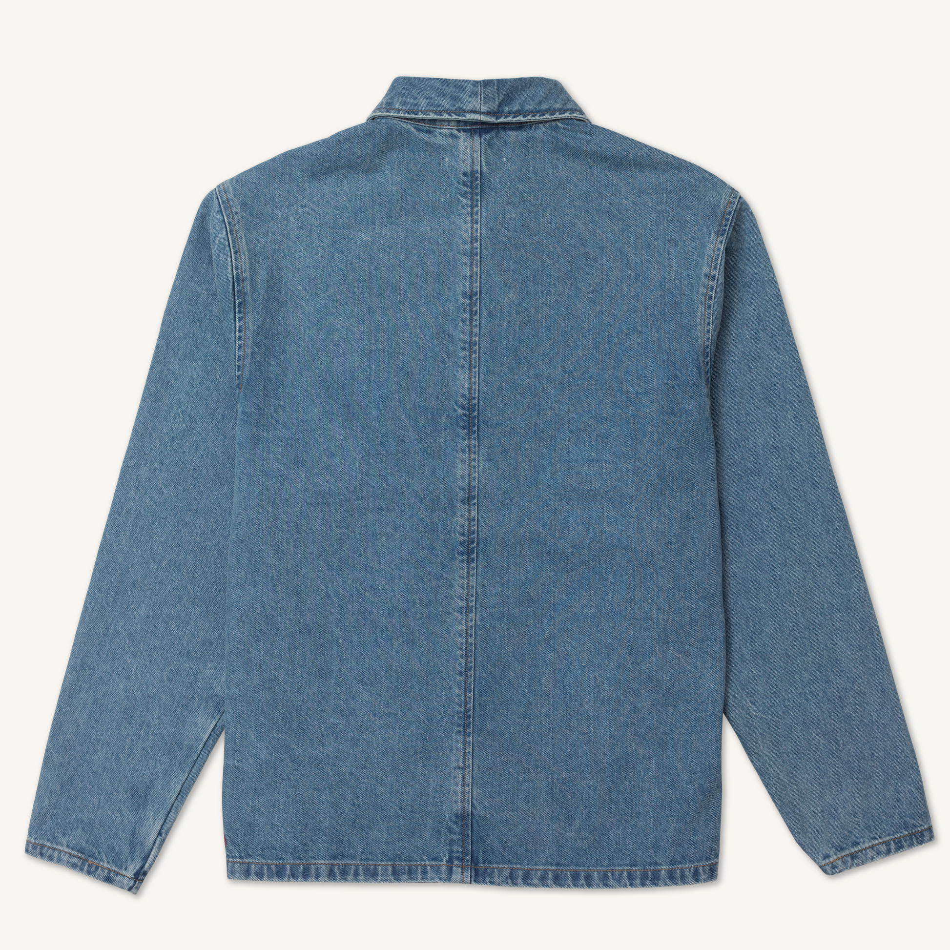 Built from 12.5oz indigo denim and finished with a brass tack placket, this returning classic blends workwear utility with everyday comfort. A drop-in pocket with coin slot, internal patch pocket, and faced side slits keep it functional and easy to move in, while the embroidered scribble adds a mark of authenticity. Stonewashed for a lived-in feel, it’s available in Stonewashed Indigo and Black Indigo.