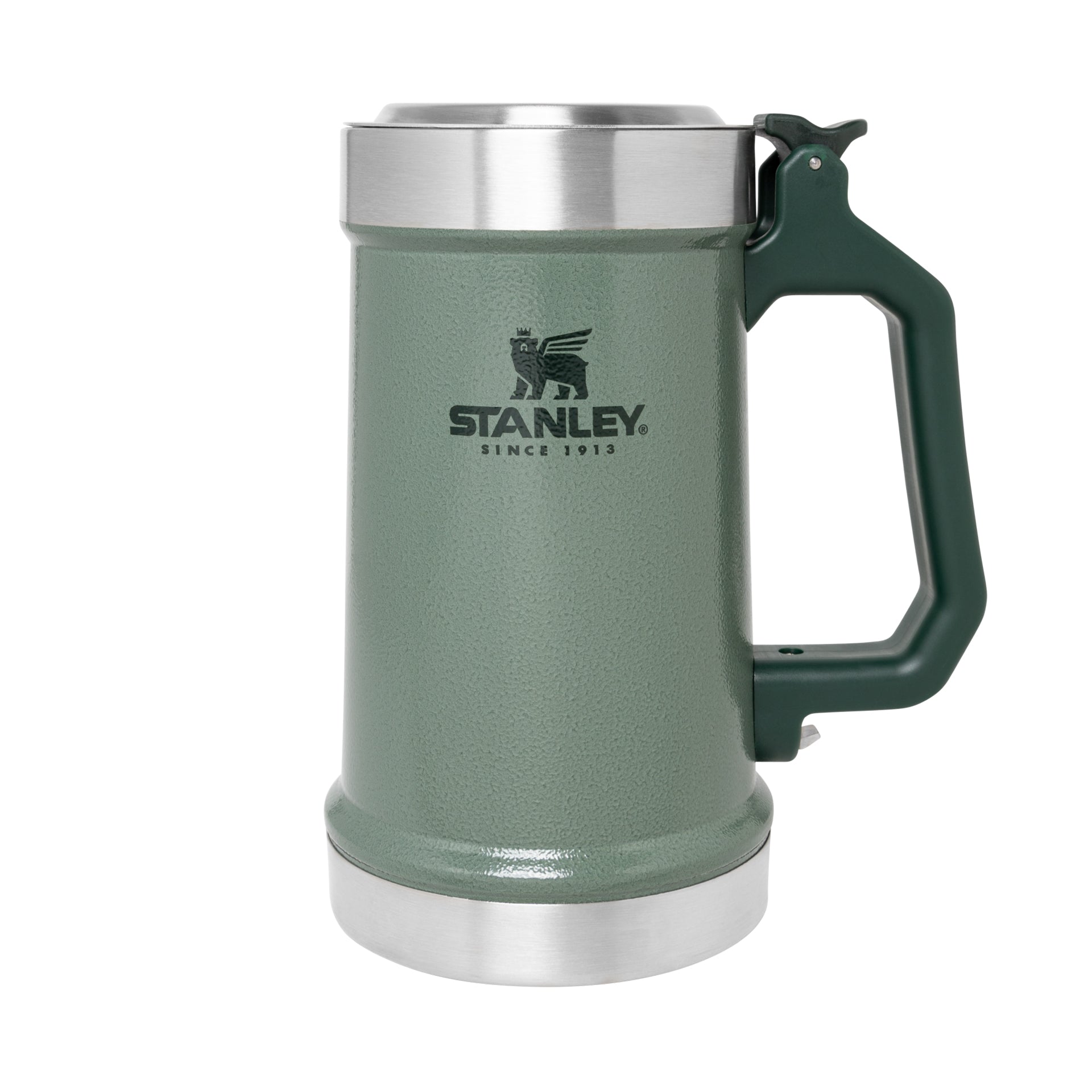 Stanley's Classic Bottle Opener Beer Stein is a rugged, insulated stein that combines classic design with modern functionality. Crafted from durable 18/8 stainless steel, it features double-wall vacuum insulation to keep your beverage cold for up to 8 hours. The integrated bottle opener ensures you're always prepared to crack open a cold one, while the flip-up stainless steel lid helps maintain carbonation and keeps debris out. With a heavy-duty handle for a comfortable grip, this stein is dishwasher safe and built to withstand the rigors of outdoor adventures. Whether you're camping, tailgating, or enjoying a backyard barbecue, this stein combines functionality with a classic design.