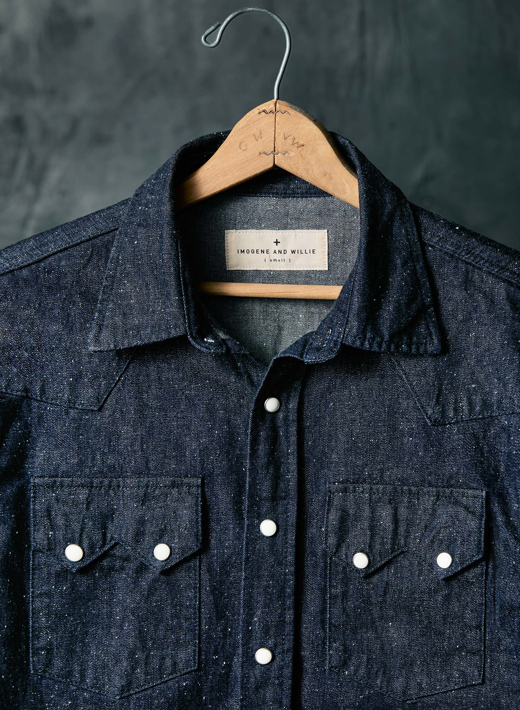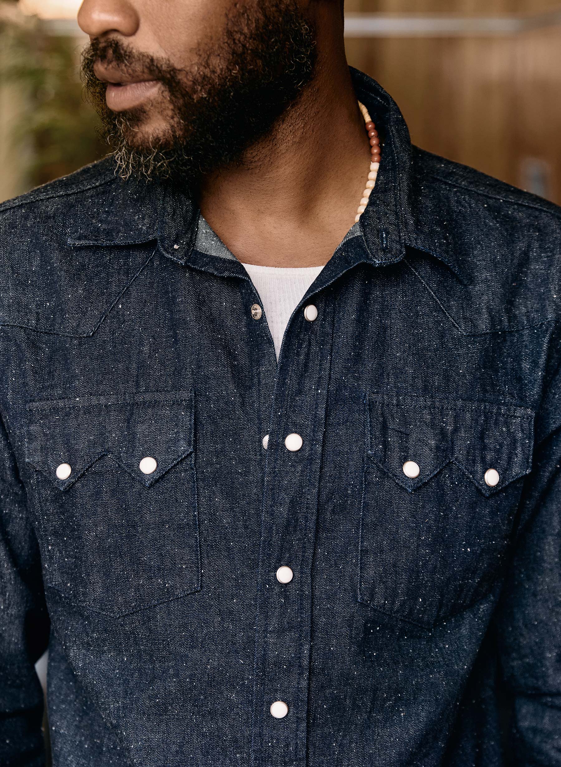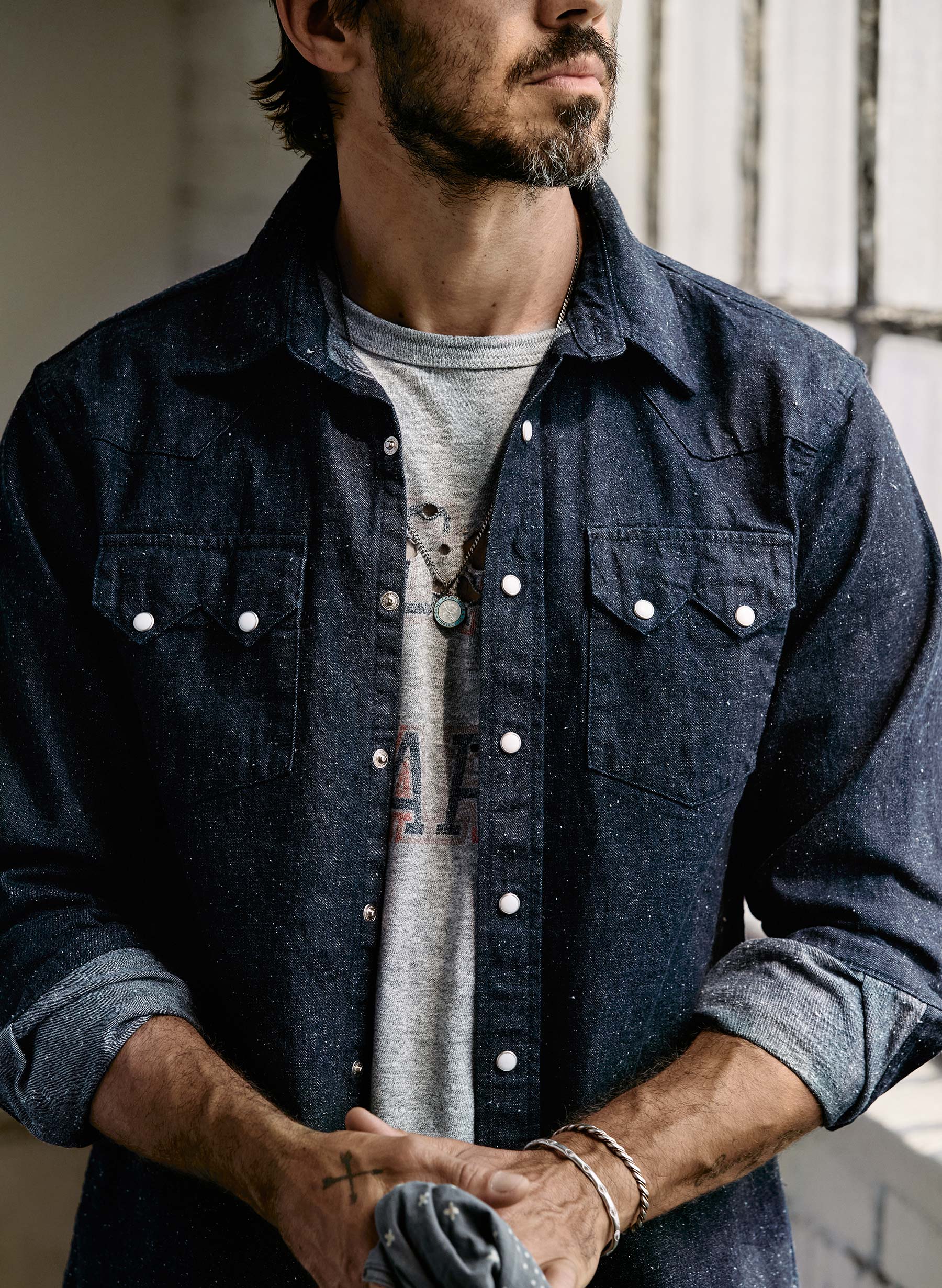 The Sawtooth Pearl Snap is a modern homage to the classic western shirt, reimagined with meticulous attention to detail. Cut from 10 oz Japanese denim and rinsed for immediate comfort, it strikes a balance between rugged utility and refined craftsmanship. Signature sawtooth pocket flaps, a tailored silhouette, and custom pearl snaps nod to cowboy heritage without feeling like a costume. Woven and sewn in the USA, it's built to last and to get better with every wear. Whether layered over a tee or worn solo, it’s the kind of piece that earns a permanent spot in your rotation.