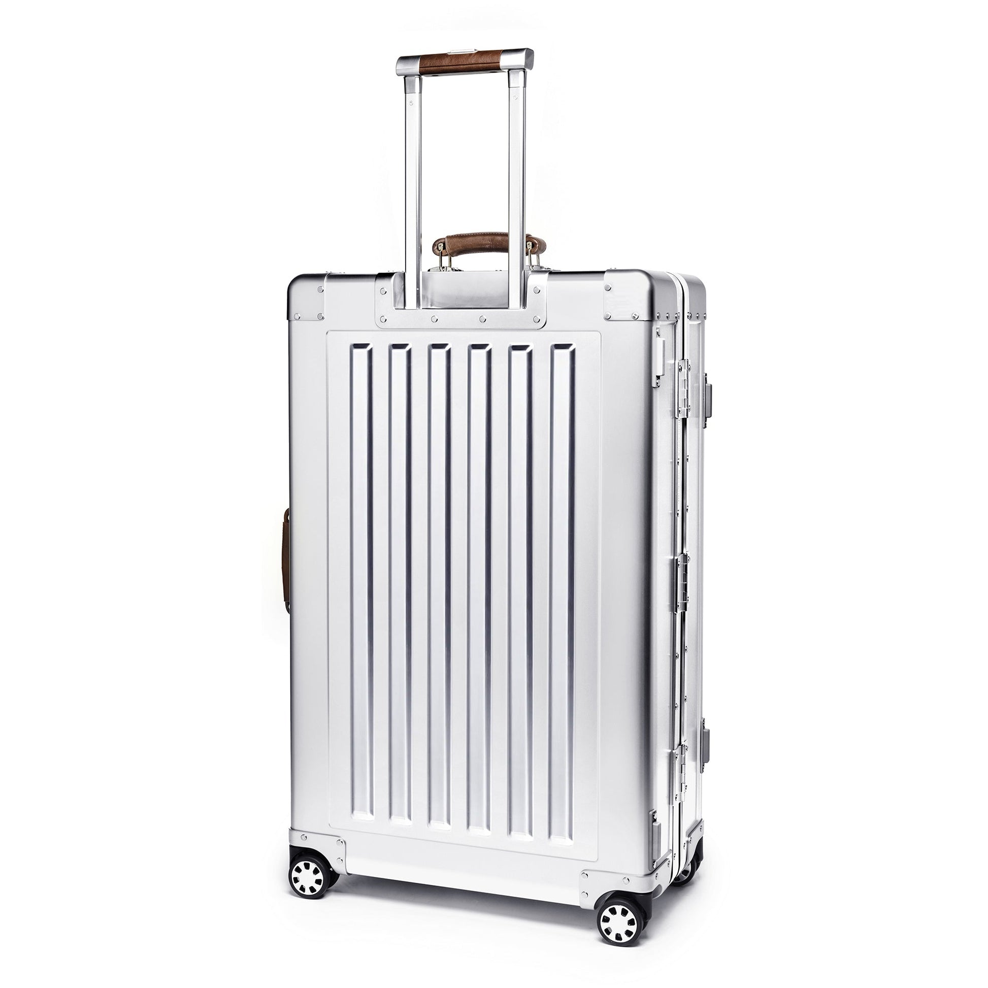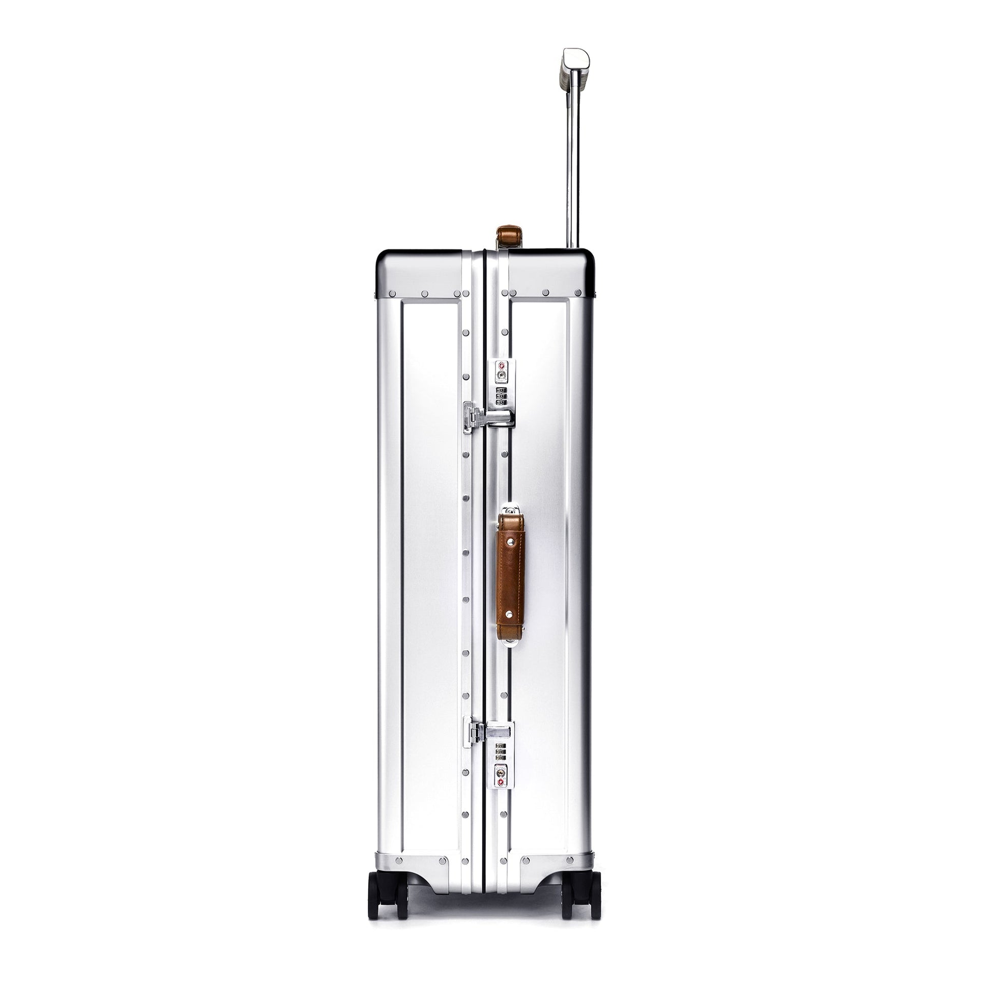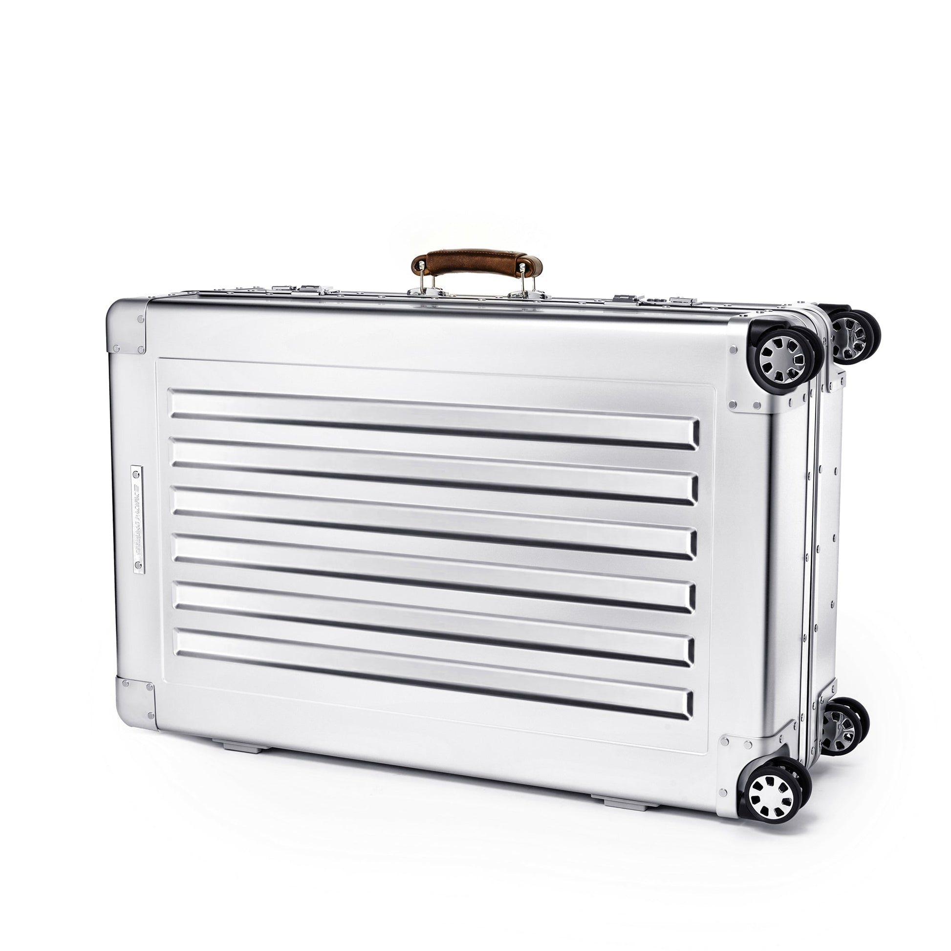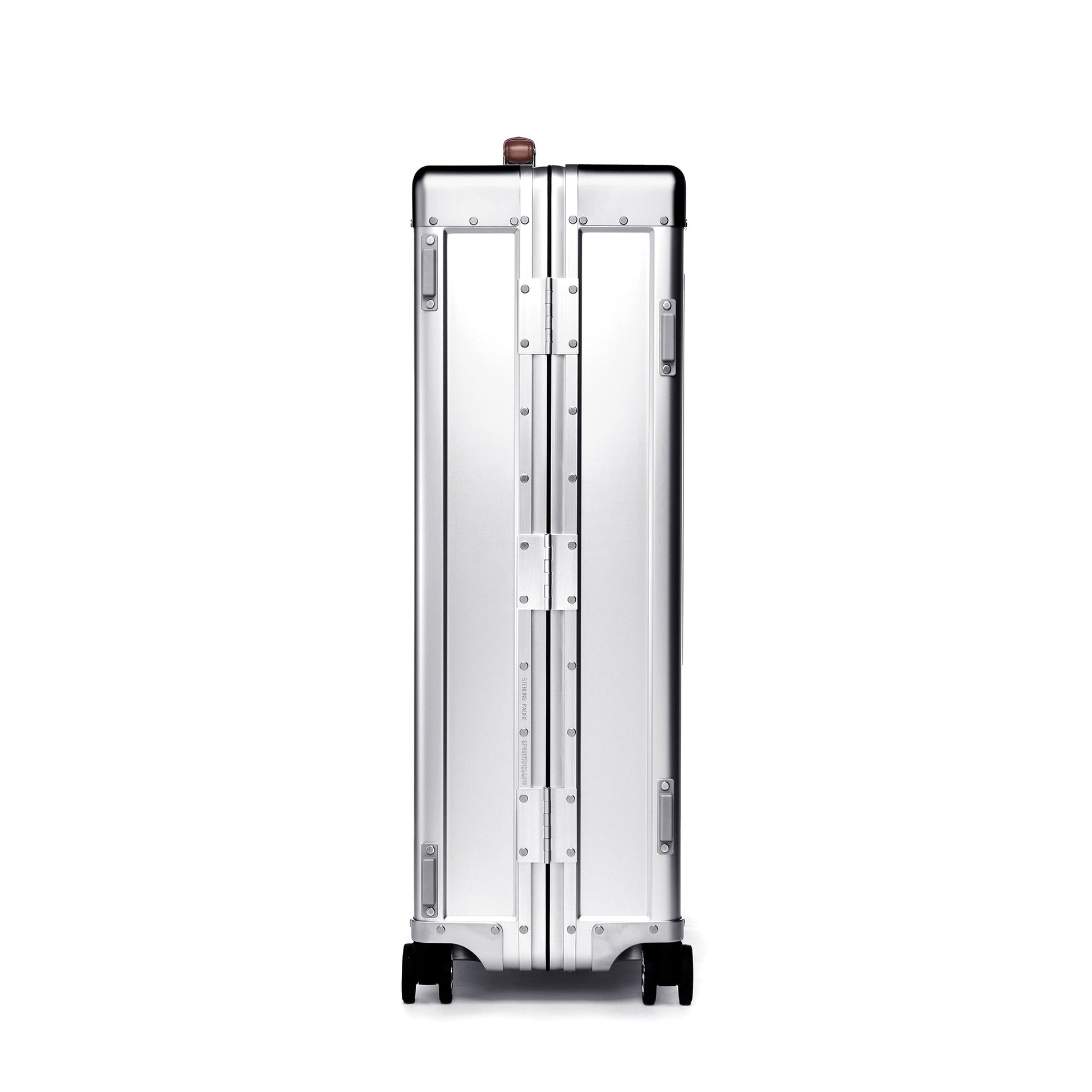 Built for a lifetime of travel, this Check-In Case from Sterling Pacific combines aviation-grade aluminum with precision engineering. Its aluminum body and reinforced corners protect against impact, while cast housings and a retractable aluminum trolley ensure strength without excess weight. Italian full-grain leather handles add a classy touch to its industrial form, and 360° wheels with metal caps keep it gliding smoothly through terminals. Finished with TSA double-latch locks and backed by a lifetime warranty, it’s a piece of luggage built for endurance, adventure, and timeless style.