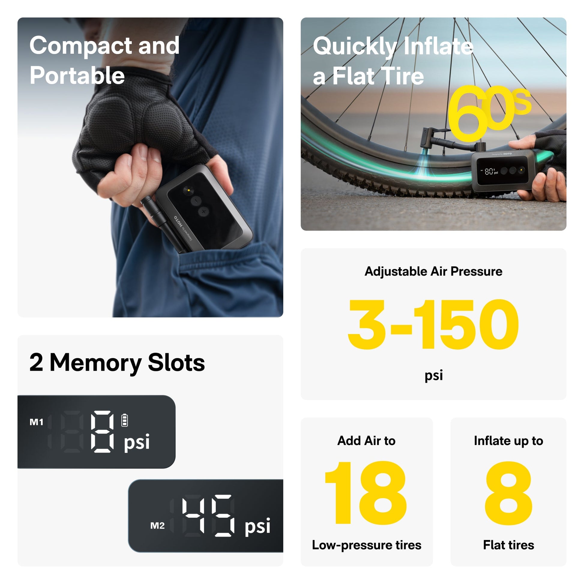 This pocket air pump inflates up to 150 PSI with quick setup, presets, and a long-lasting battery.