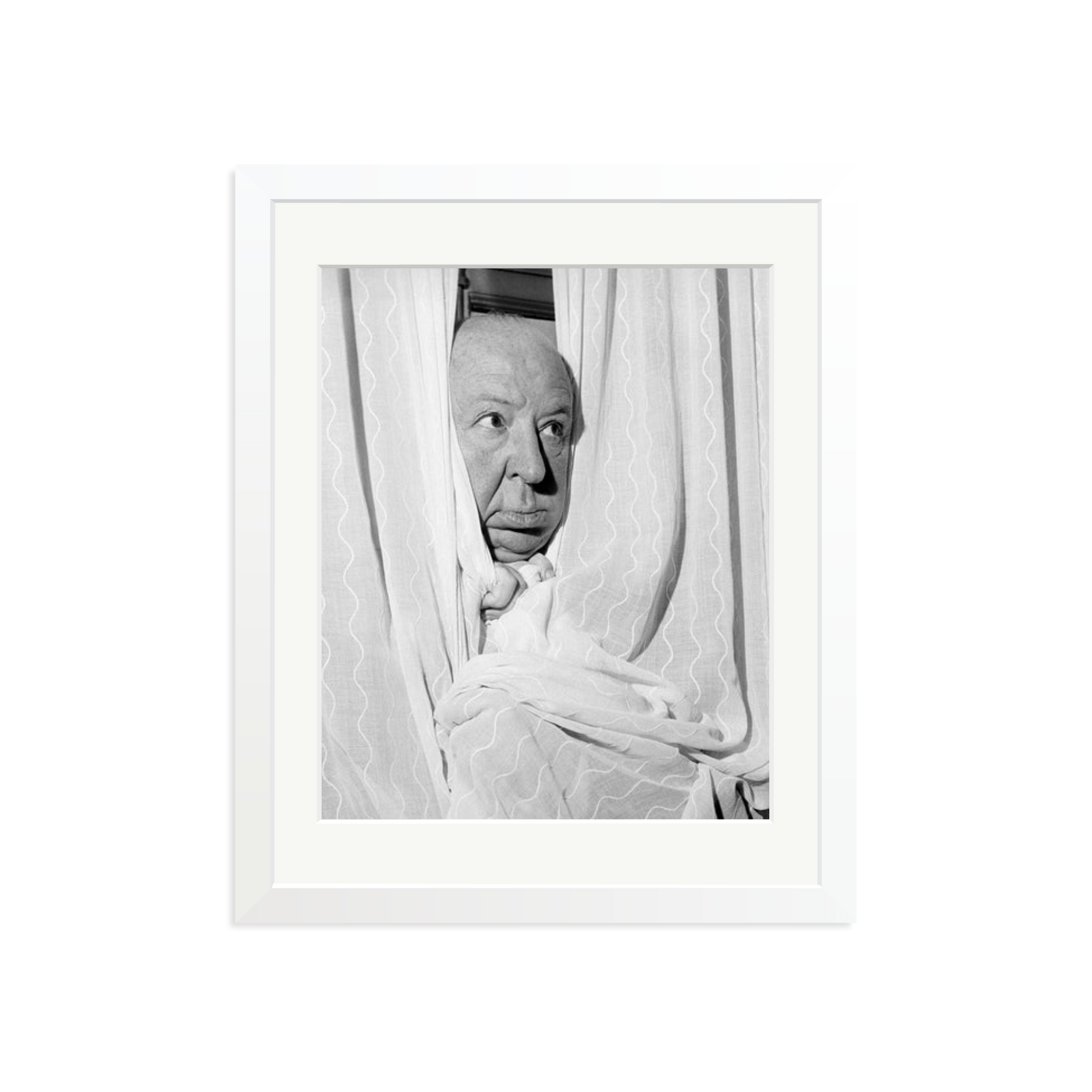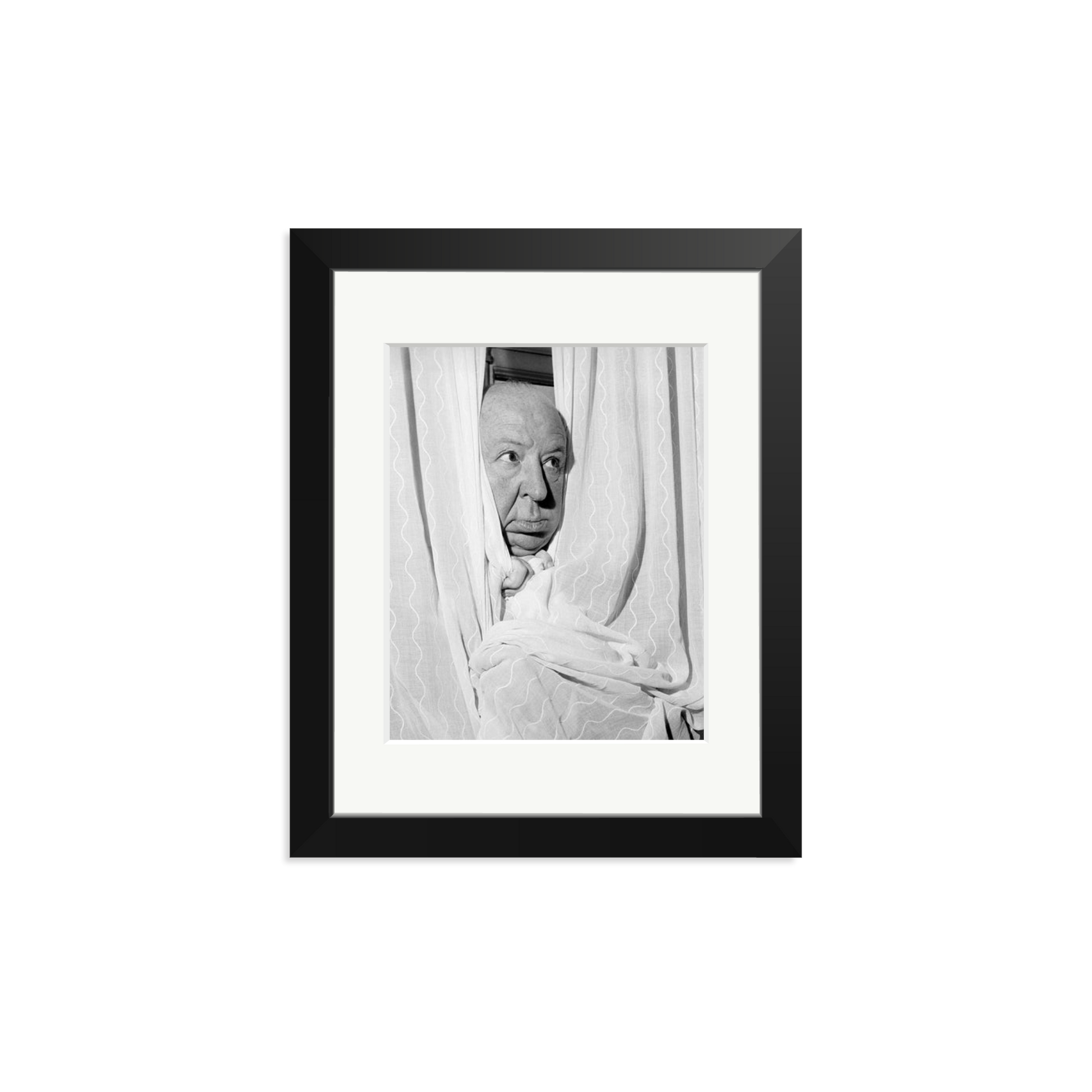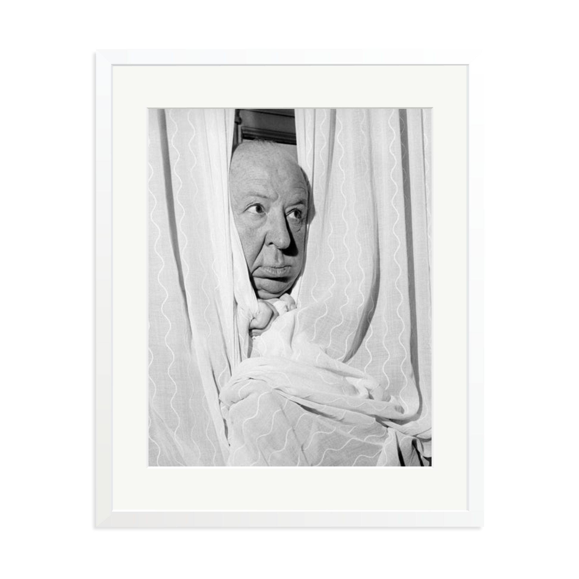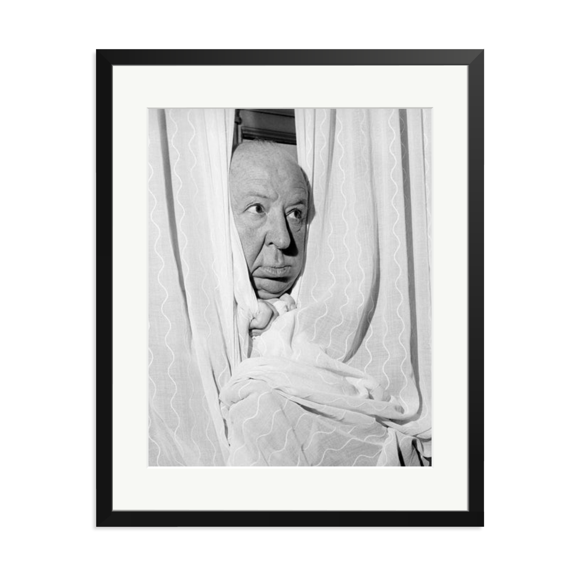 This framed print from Sonic Editions captures the legendary Alfred Hitchcock partially hidden behind curtains, radiating the suspenseful charm that made him a cinematic icon. Taken months before the release of his 50th film, Torn Curtain, this black-and-white photograph by Hal Morey blends Hitchcock's signature sense of mystery with the refined elegance of London's Claridges Hotel. Printed on premium Fuji Crystal Archive paper and framed in solid wood, it's a museum-quality portrait that arrives ready to hang.