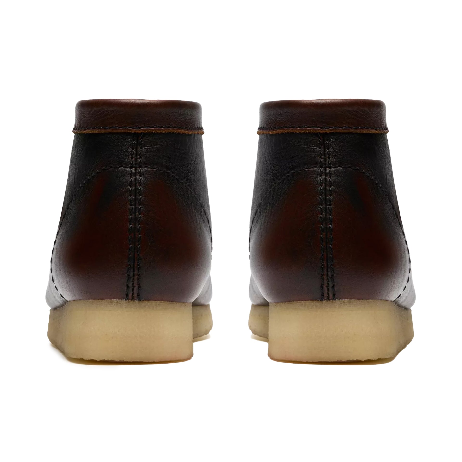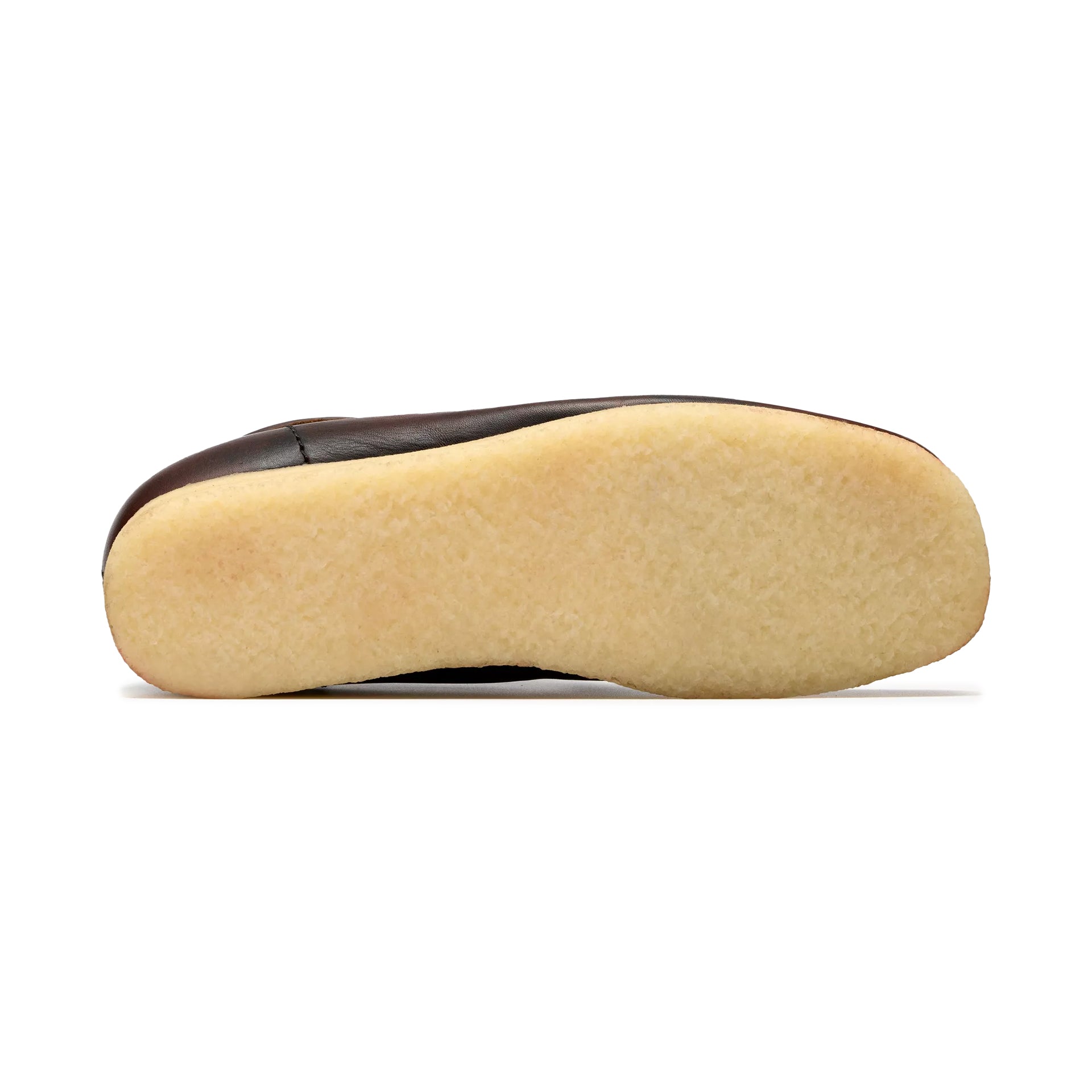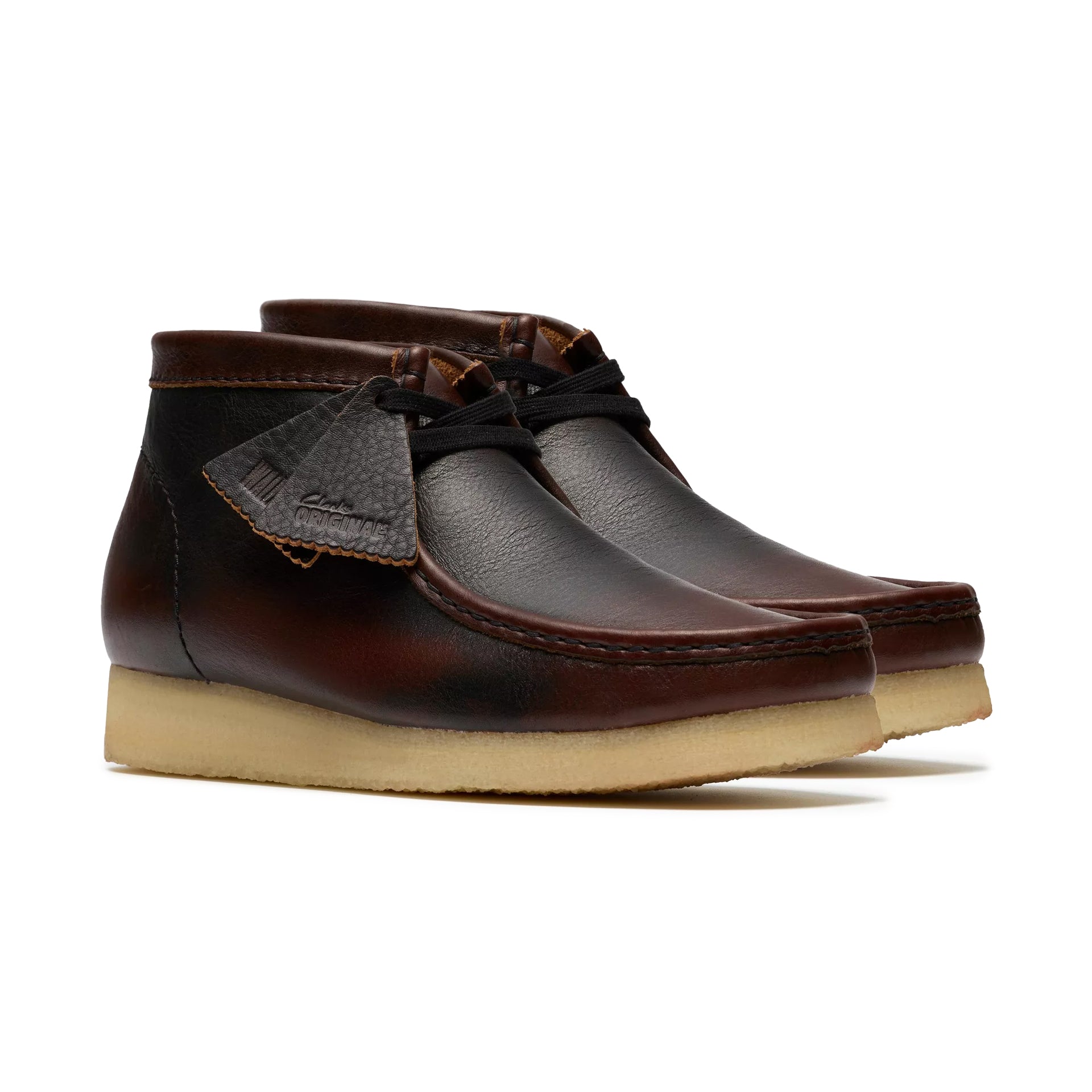 Clarks' Wallabee Boot in Dark Tan Combination reimagines the classic moccasin silhouette with a refined, seasonal leather upper that blends rich brown and black tones. Its traditional moccasin construction offers flexibility and comfort, while the iconic Clarks natural pebble crepe sole provides durable traction. The boot includes two lace options—a flat waxed lace for a polished look and a round lace for a more relaxed style—allowing for versatile wear. Additionally, the heat-embossed metallic foil Clarks Originals logo on the footbed adds a touch of refinement. While there's other colors of the iconic Wallabee boot out there, you want this one with its unique and elevated somewhat two-tone appeal.