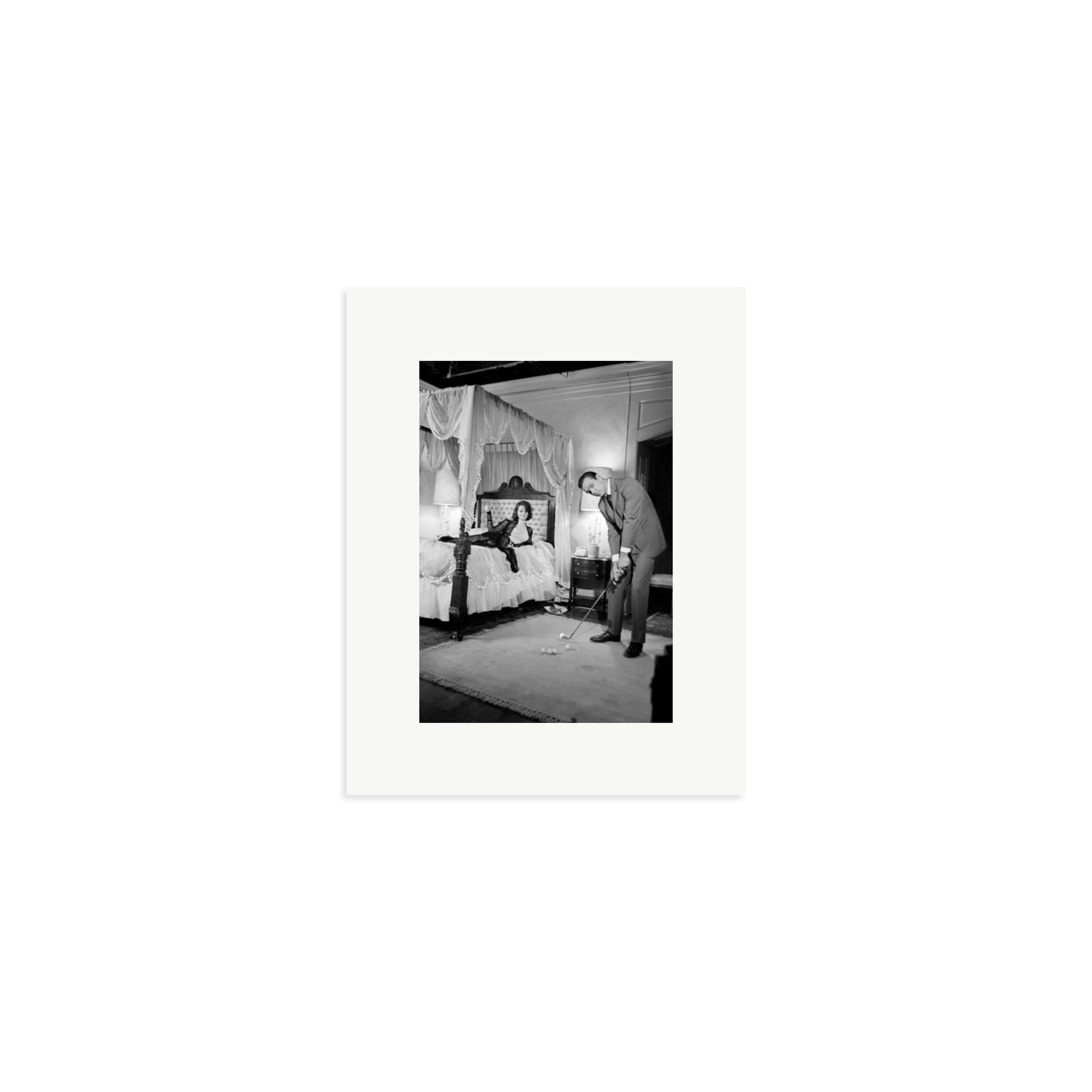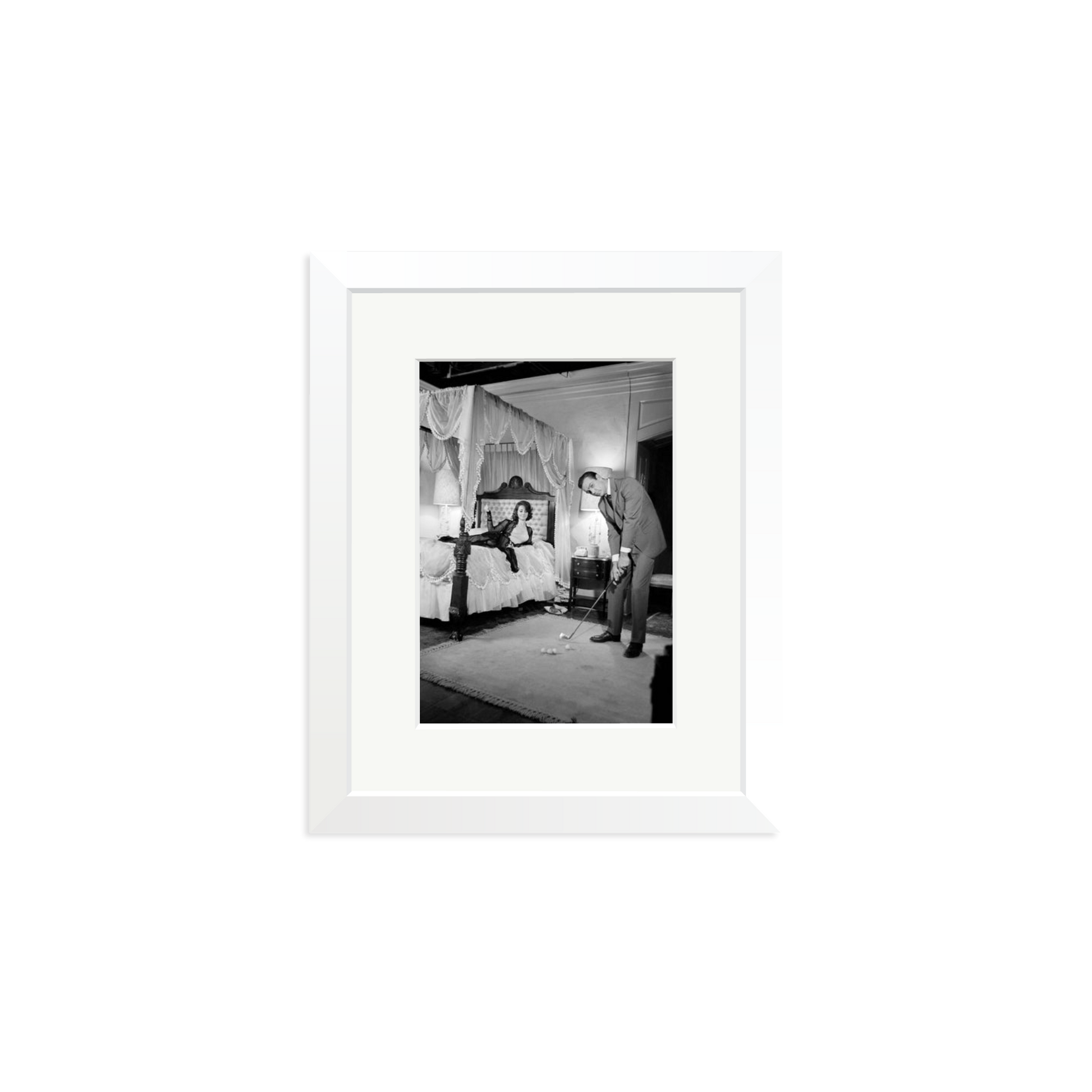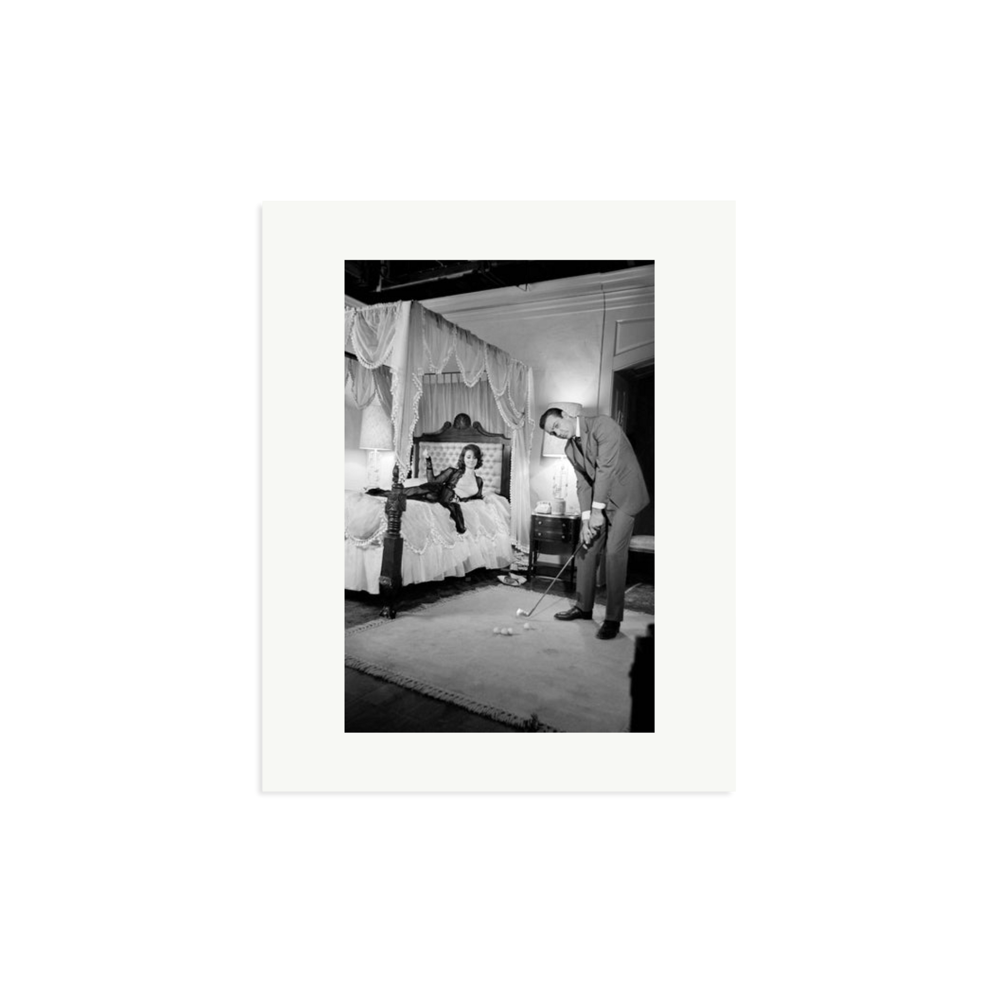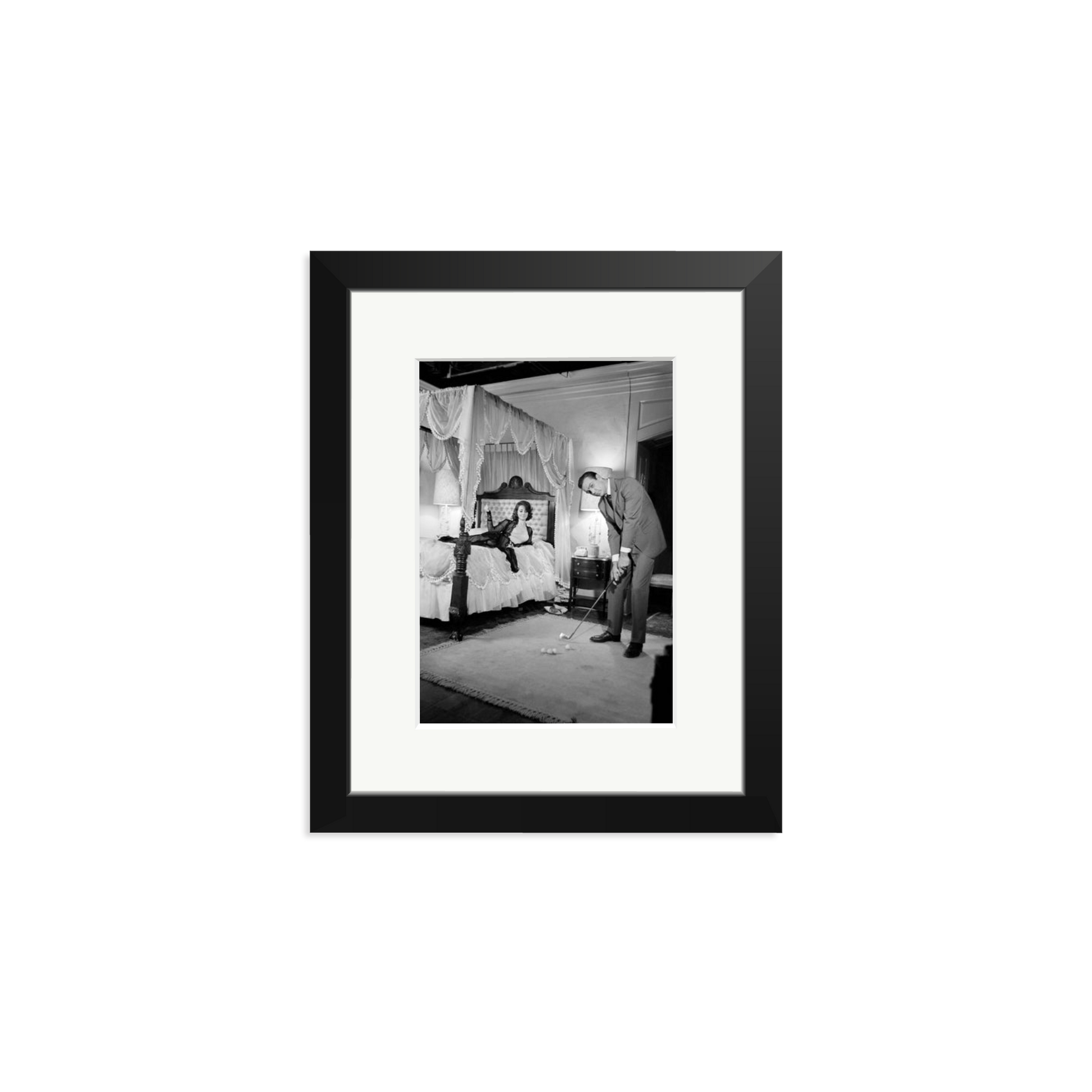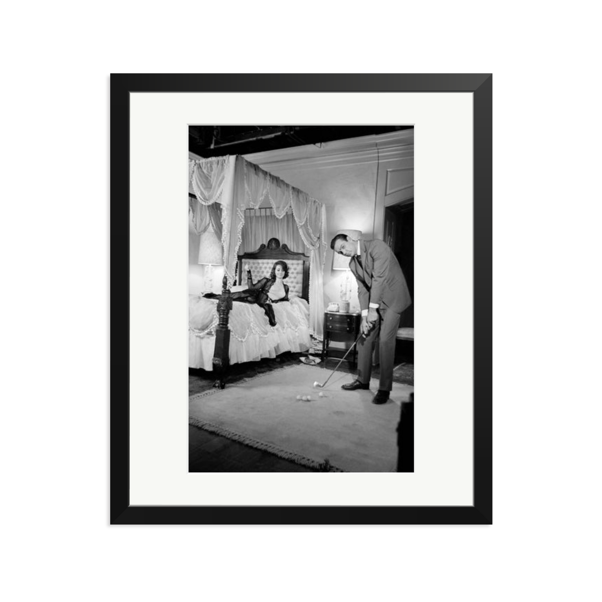 Connery hits golf balls on a rug while a woman lounges, captured in a framed archival print.