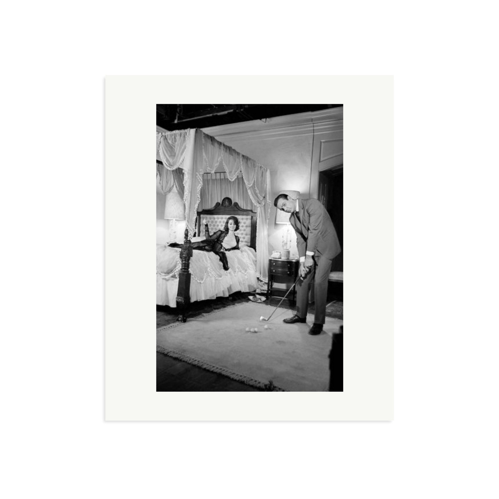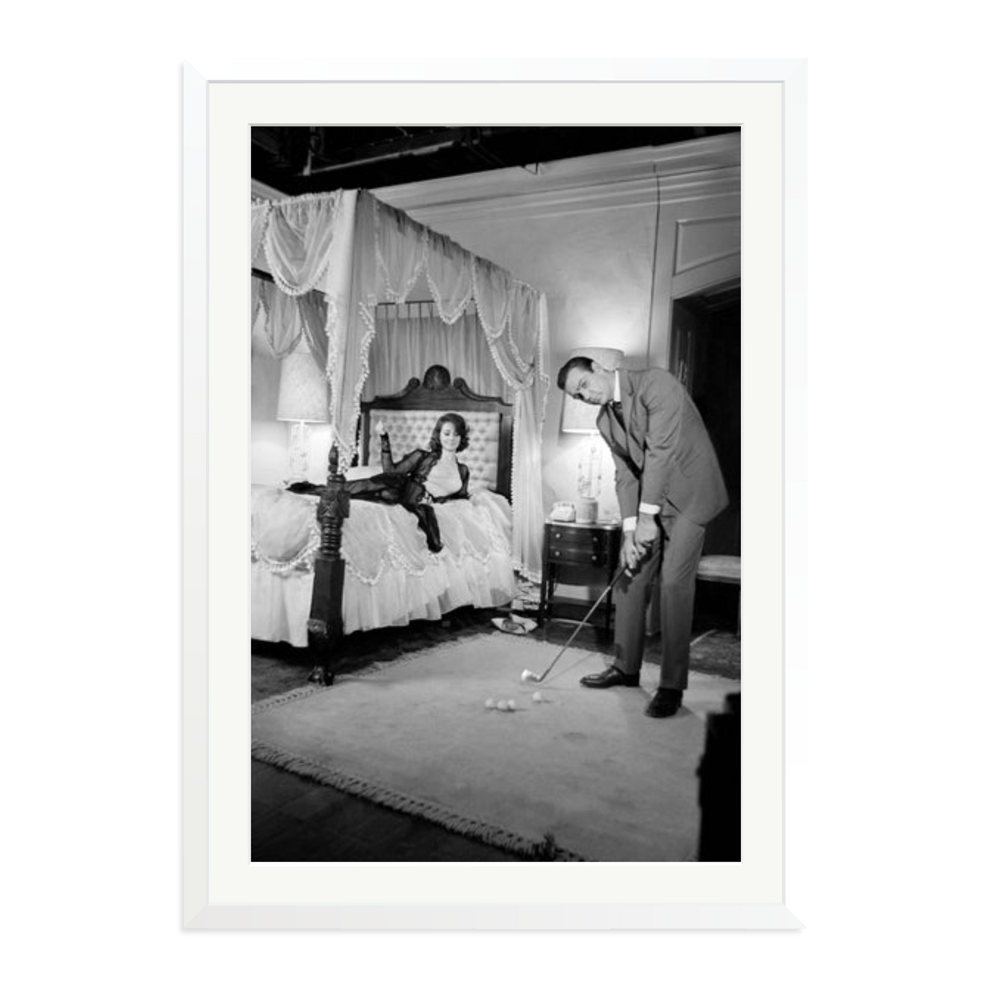 On the set of Diamonds Are Forever in 1971, Sean Connery casually hits golf balls on a rug while a woman lounges on a bed nearby, capturing a playful behind-the-scenes moment. Printed on archival Fuji Crystal Archive paper and framed in solid wood under gallery-grade Perspex, each numbered edition delivers crisp detail and rich tones, arriving ready to hang with pro hardware, turning a quirky slice of Bond history into wall-ready art.
