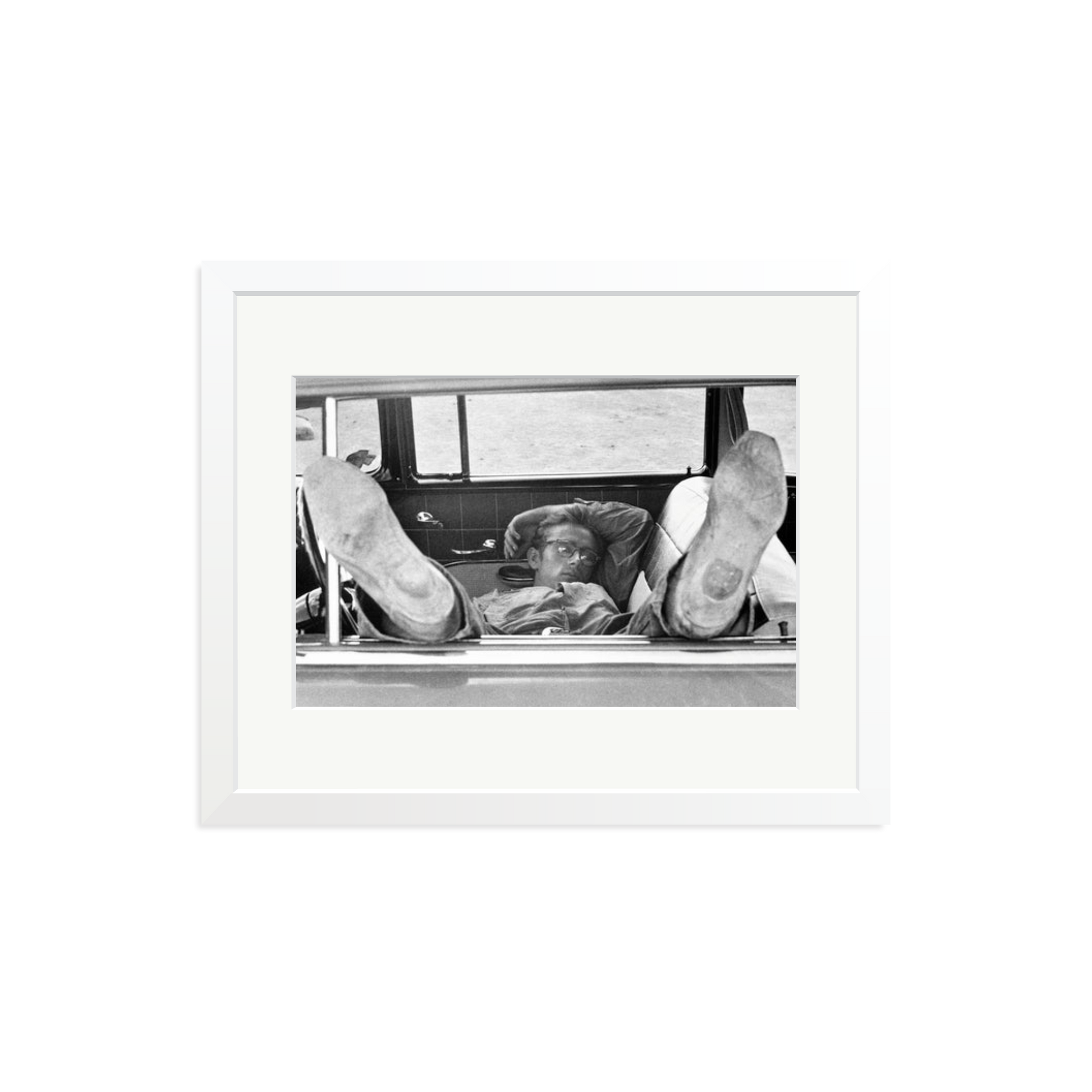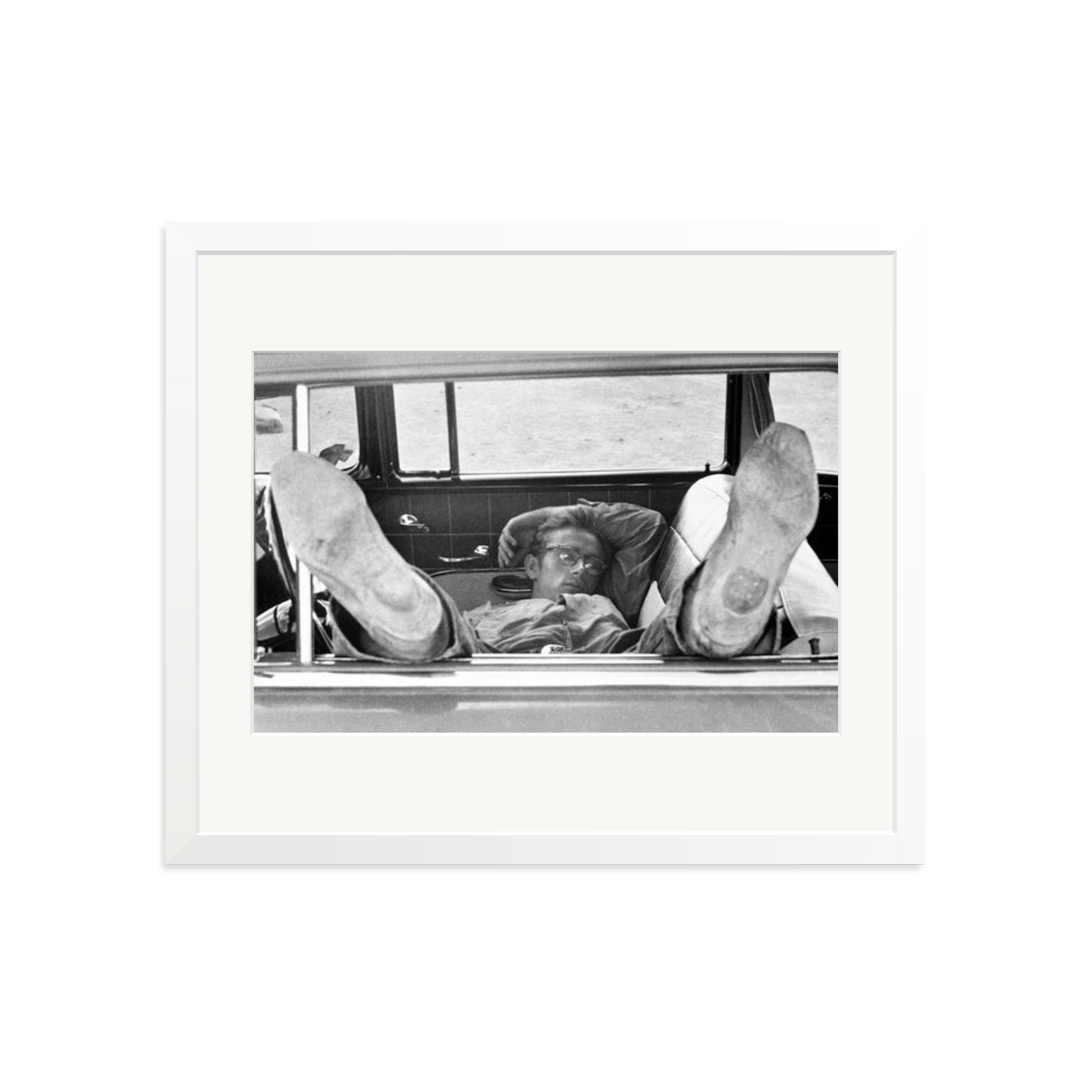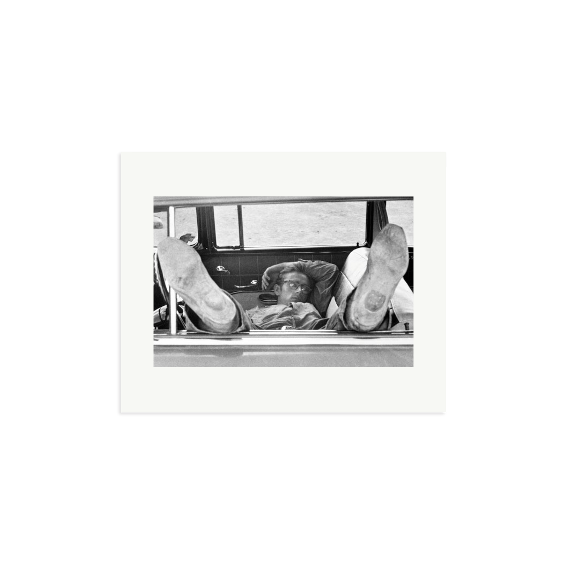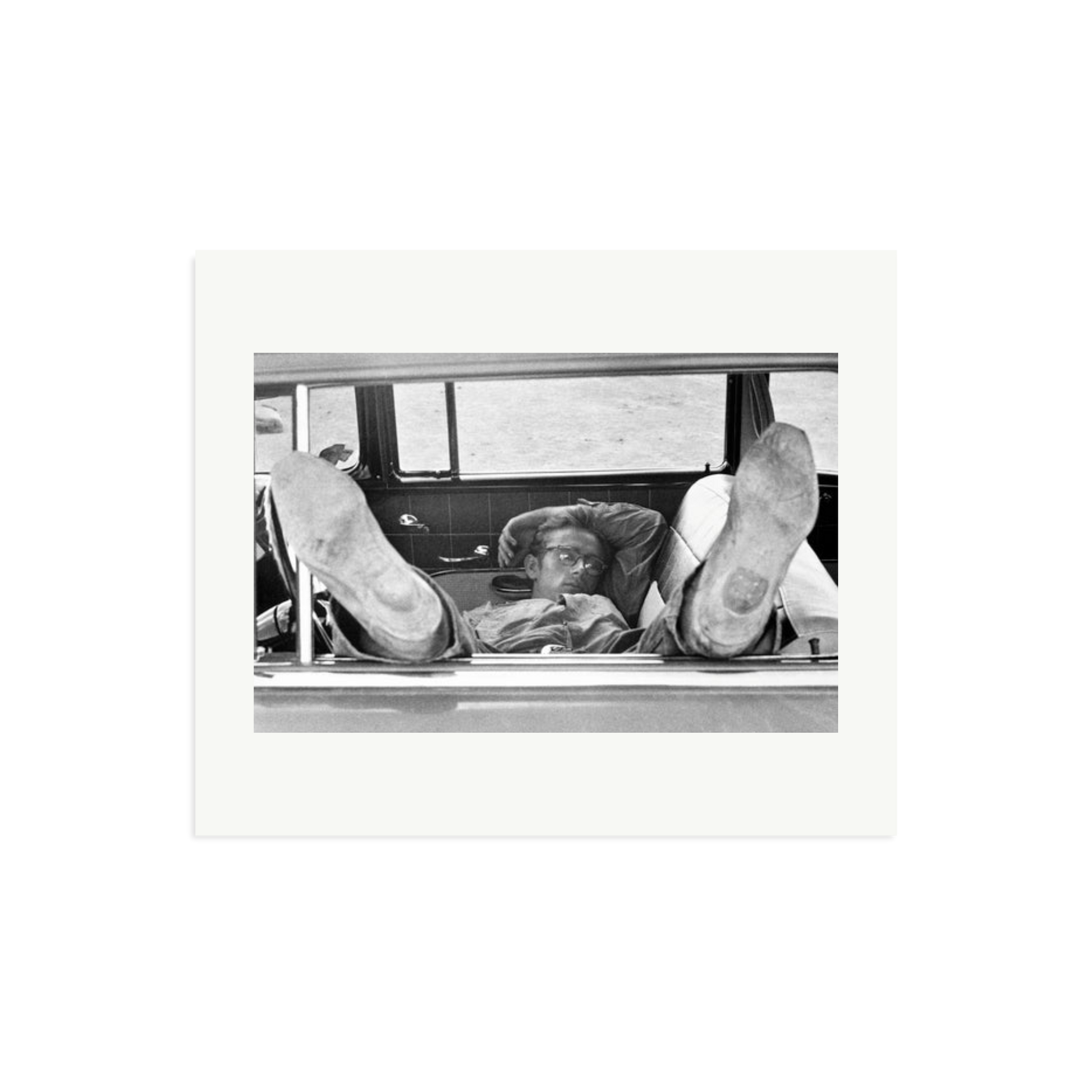 James Dean made only three films before dying in a car crash at 24, and Giant was the last. Filmed on location in Marfa, Texas in the summer of 1955, Dean plays Jett Rink, a brooding Texas ranch hand who strikes oil and loses himself in the process. He never saw the finished film. He was killed less than two weeks after wrapping, and Giant was released posthumously to critical acclaim, earning Dean his second Academy Award nomination. Photographer Richard C. Miller caught him here between takes, slouched behind the wheel with the kind of effortless cool that made him impossible to look away from. The image is printed on archival Fuji Crystal Archive paper, with the story of the photograph stamped on the reverse.