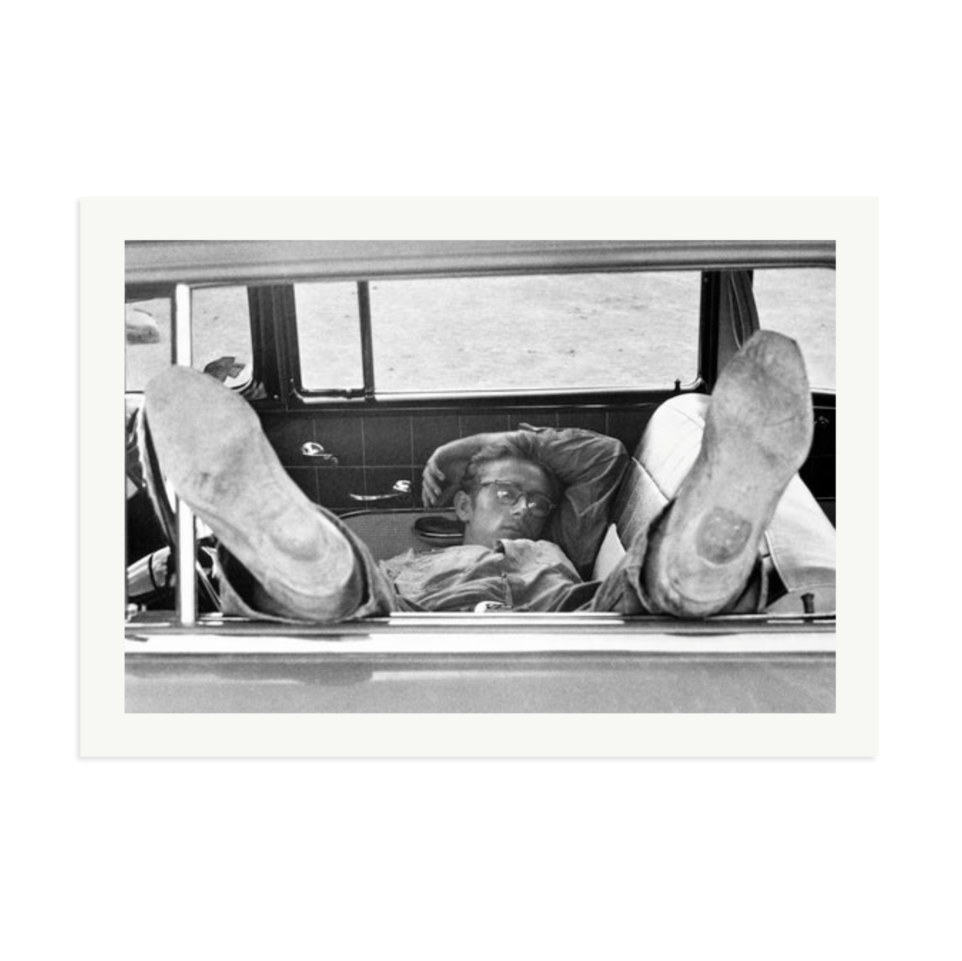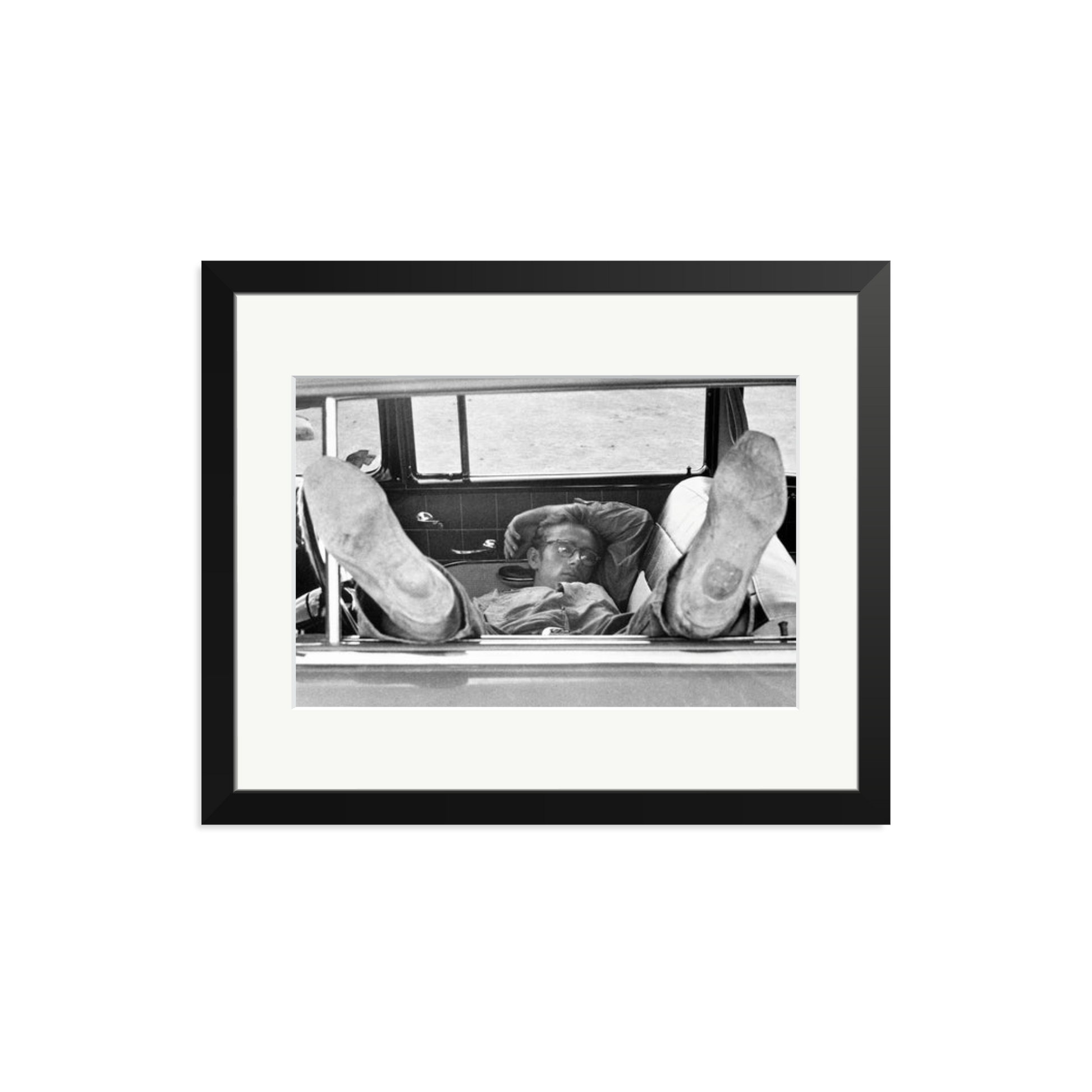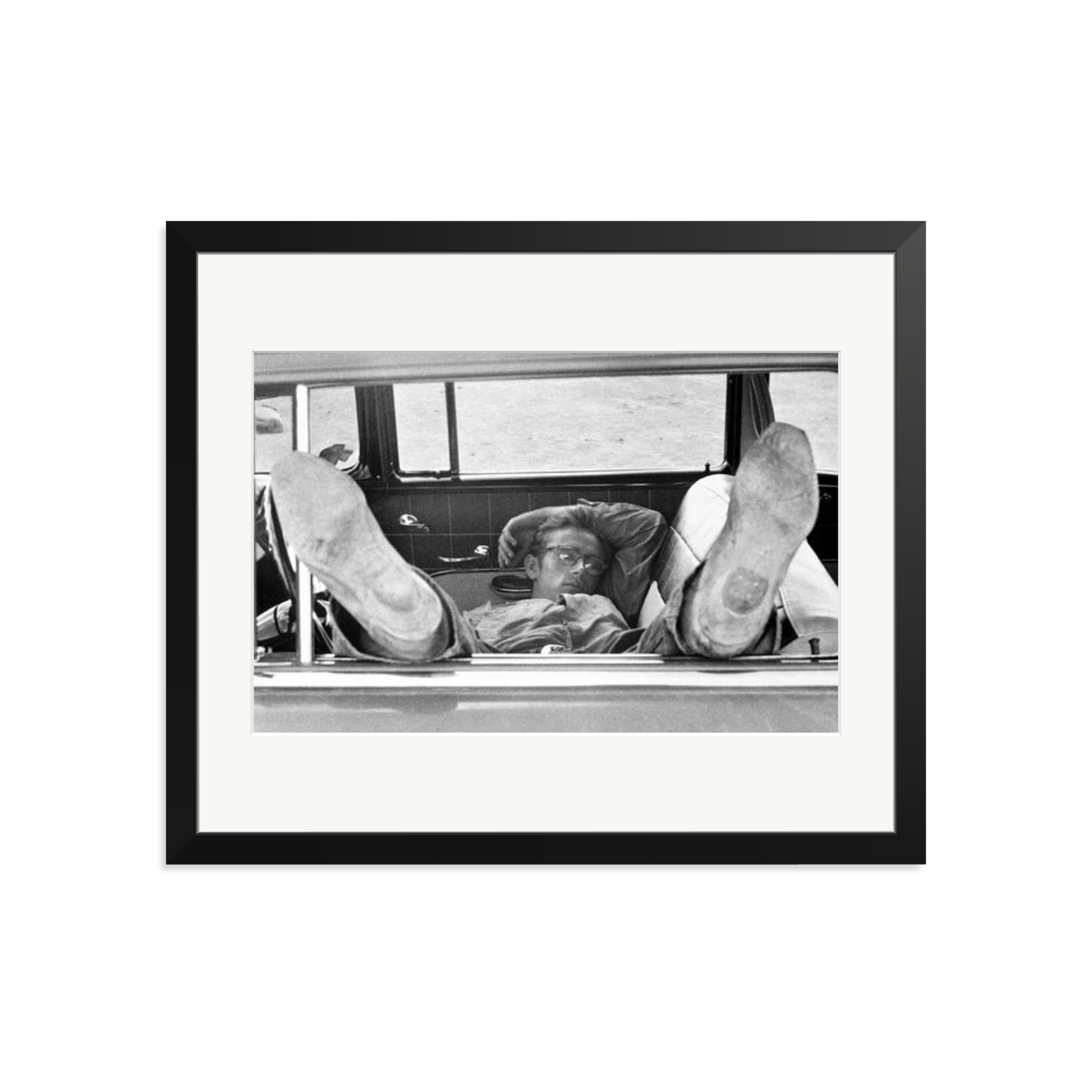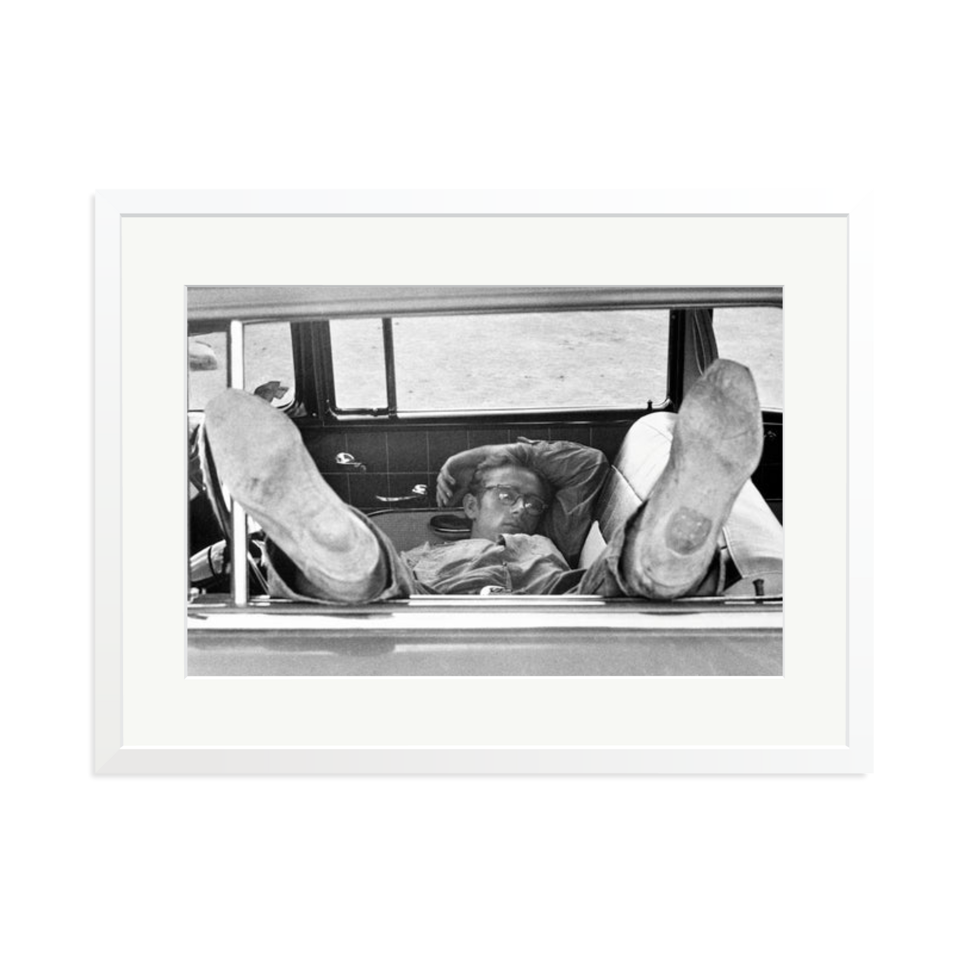 James Dean made only three films before dying in a car crash at 24, and Giant was the last. Filmed on location in Marfa, Texas in the summer of 1955, Dean plays Jett Rink, a brooding Texas ranch hand who strikes oil and loses himself in the process. He never saw the finished film. He was killed less than two weeks after wrapping, and Giant was released posthumously to critical acclaim, earning Dean his second Academy Award nomination. Photographer Richard C. Miller caught him here between takes, slouched behind the wheel with the kind of effortless cool that made him impossible to look away from. The image is printed on archival Fuji Crystal Archive paper, with the story of the photograph stamped on the reverse.