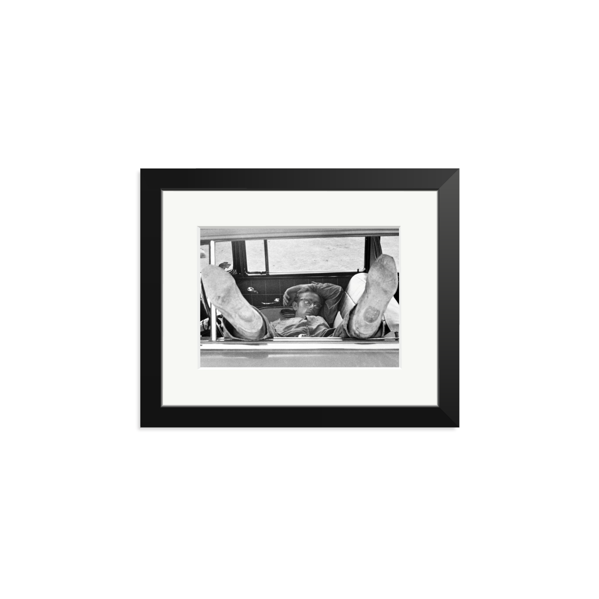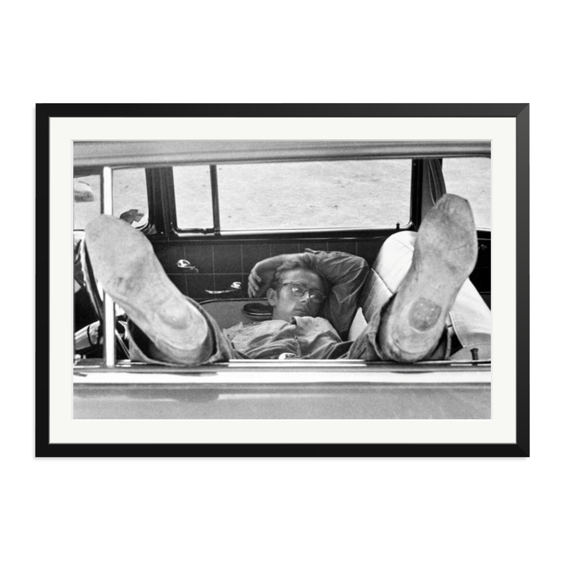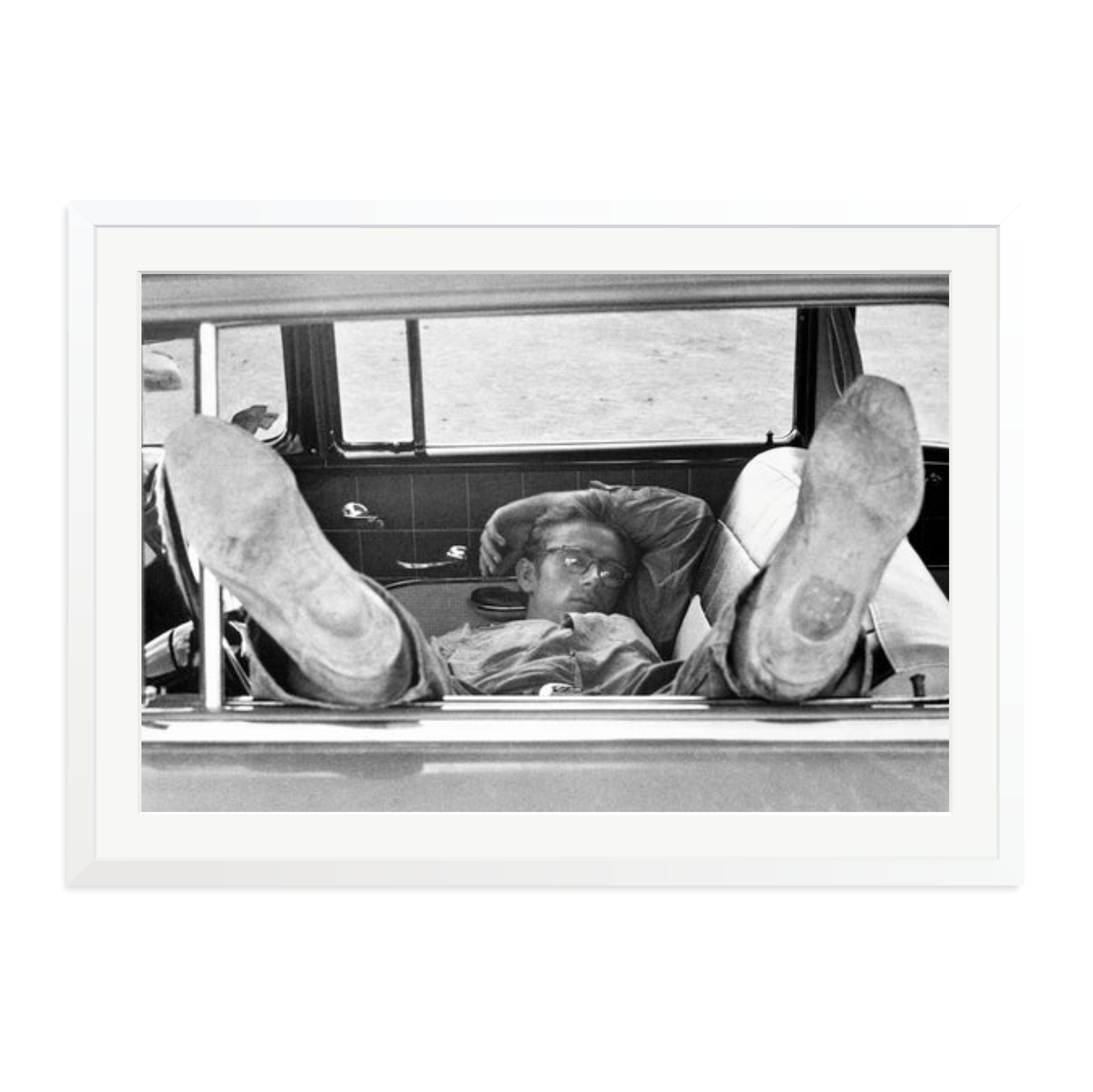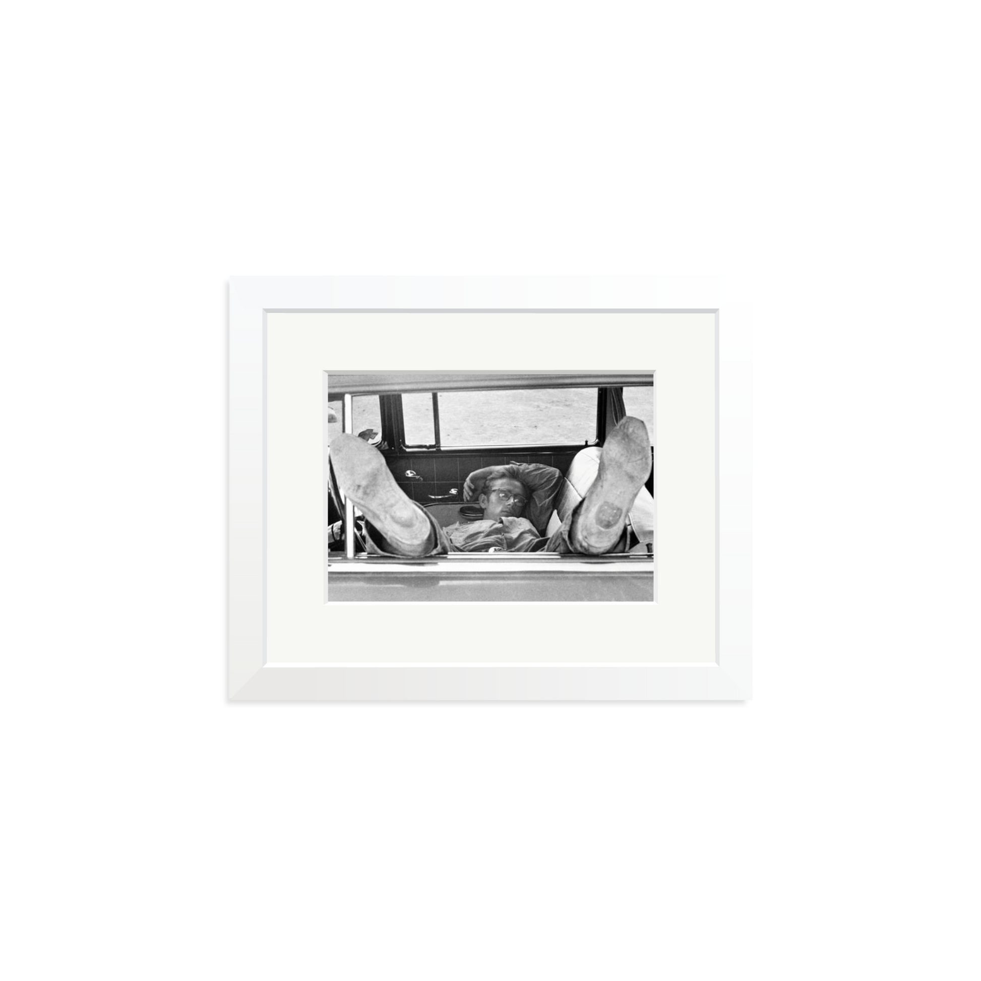 James Dean made only three films before dying in a car crash at 24, and Giant was the last. Filmed on location in Marfa, Texas in the summer of 1955, Dean plays Jett Rink, a brooding Texas ranch hand who strikes oil and loses himself in the process. He never saw the finished film. He was killed less than two weeks after wrapping, and Giant was released posthumously to critical acclaim, earning Dean his second Academy Award nomination. Photographer Richard C. Miller caught him here between takes, slouched behind the wheel with the kind of effortless cool that made him impossible to look away from. The image is printed on archival Fuji Crystal Archive paper, with the story of the photograph stamped on the reverse.