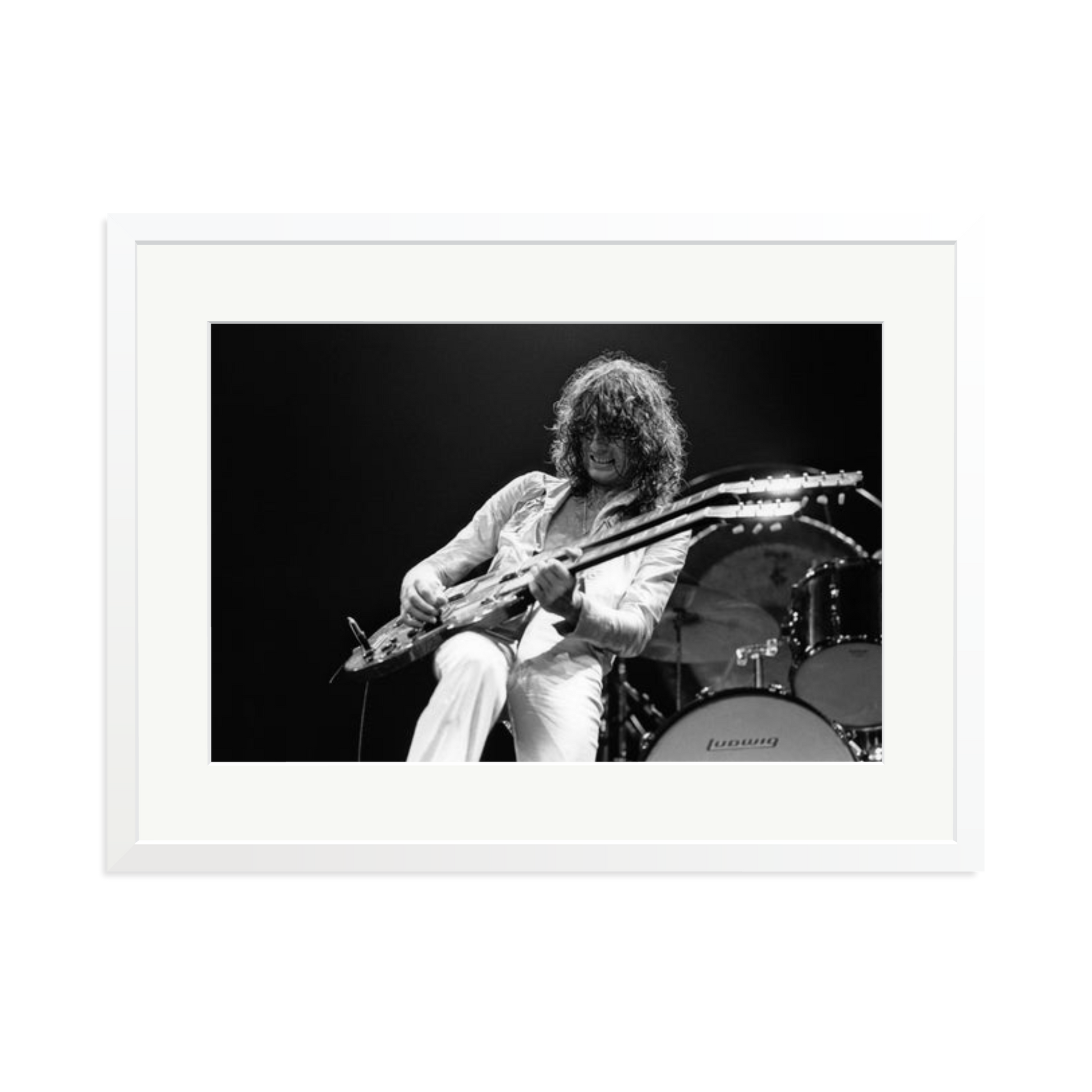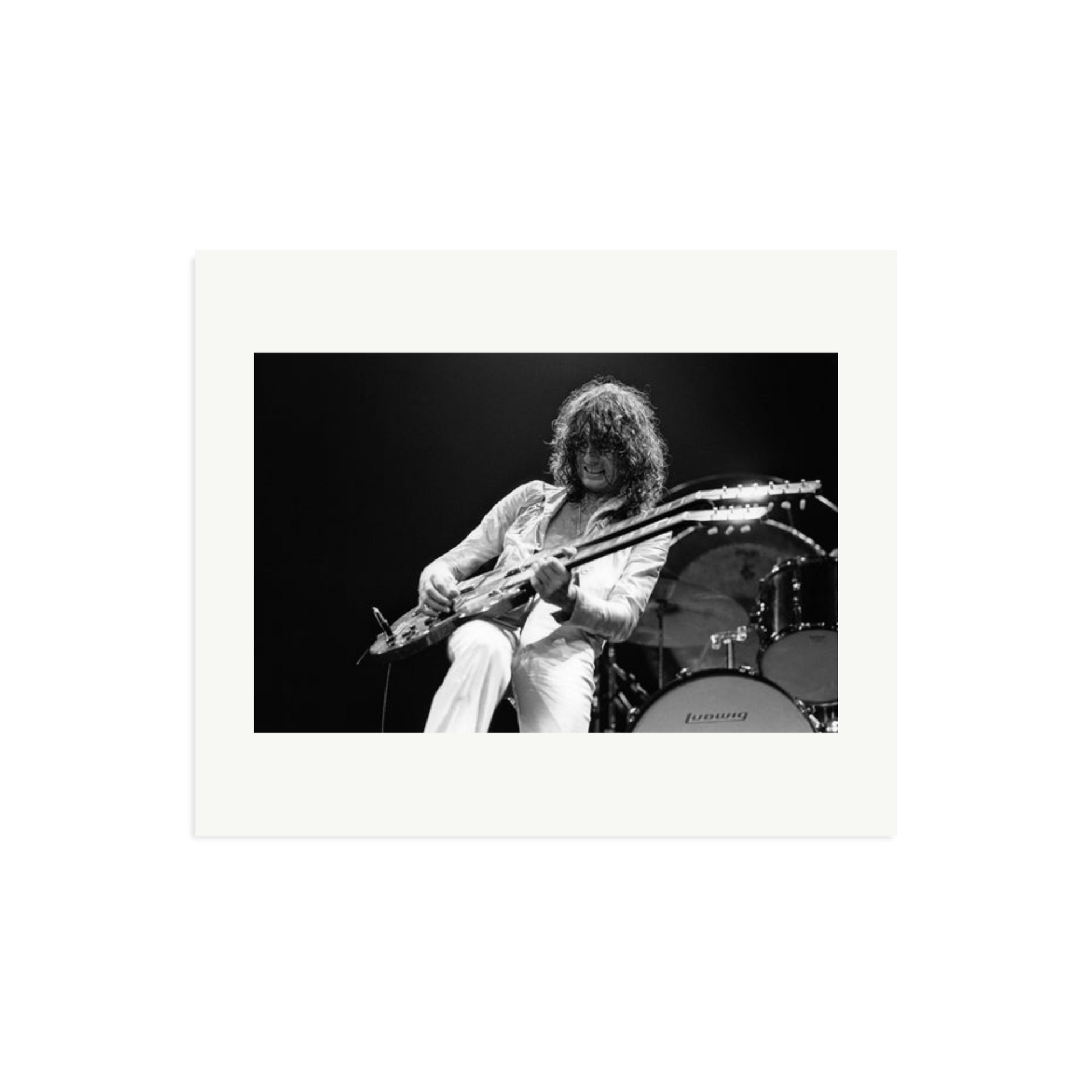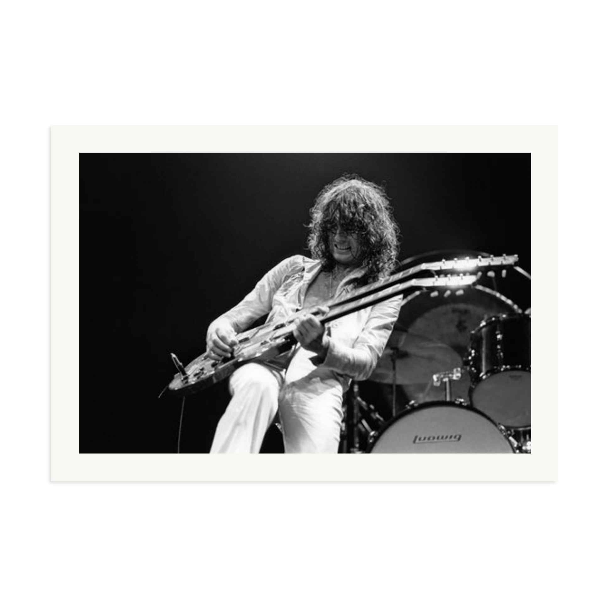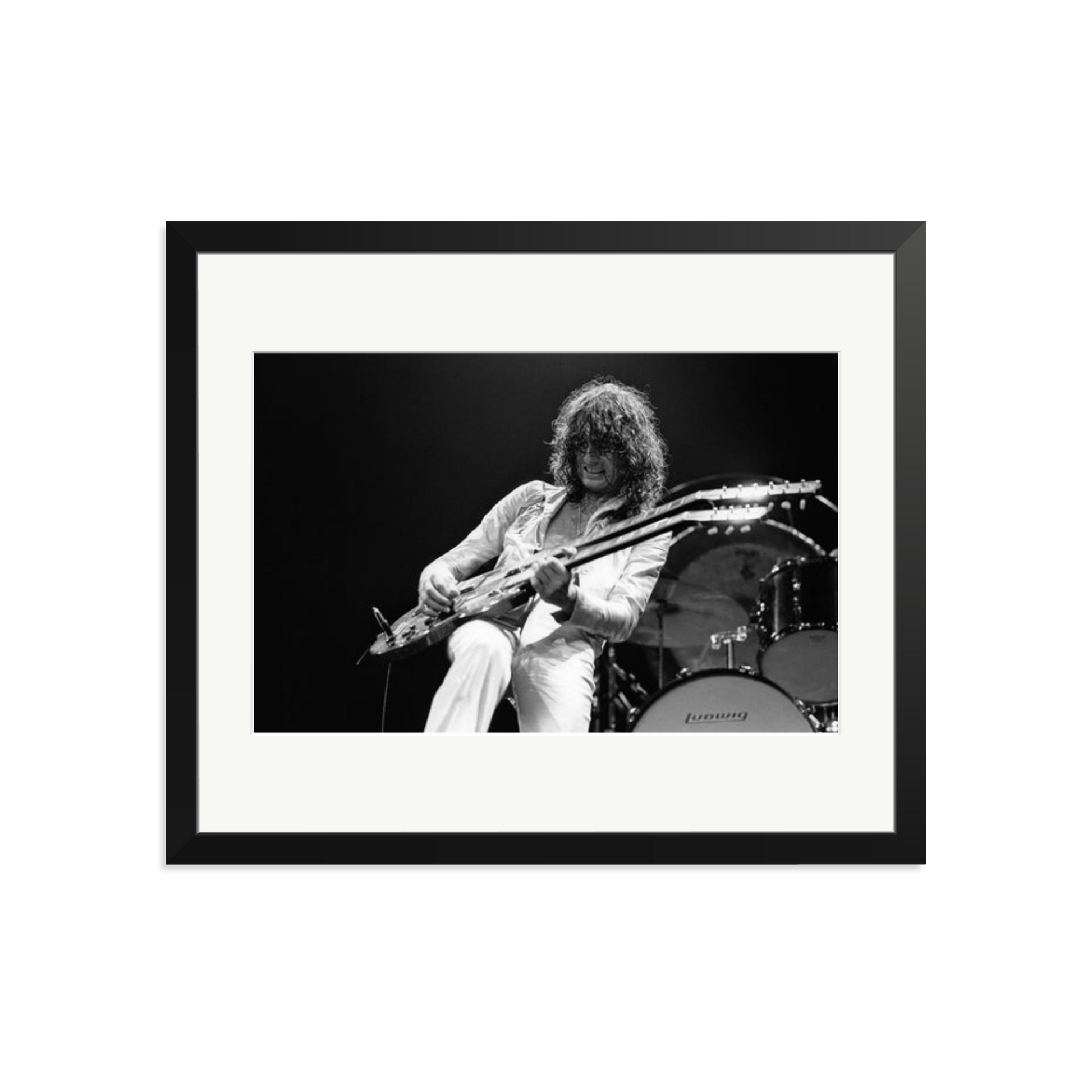 This striking photograph captures Jimmy Page on stage in 1977, a full-throttle moment of rock history. Limited to 495 prints, each piece is produced on archival Fuji Crystal Archive paper, framed in solid wood, and delivered ready to hang. It is a high-voltage visual you can own and display.