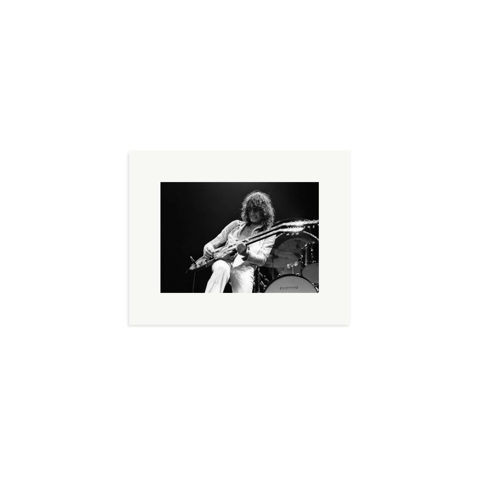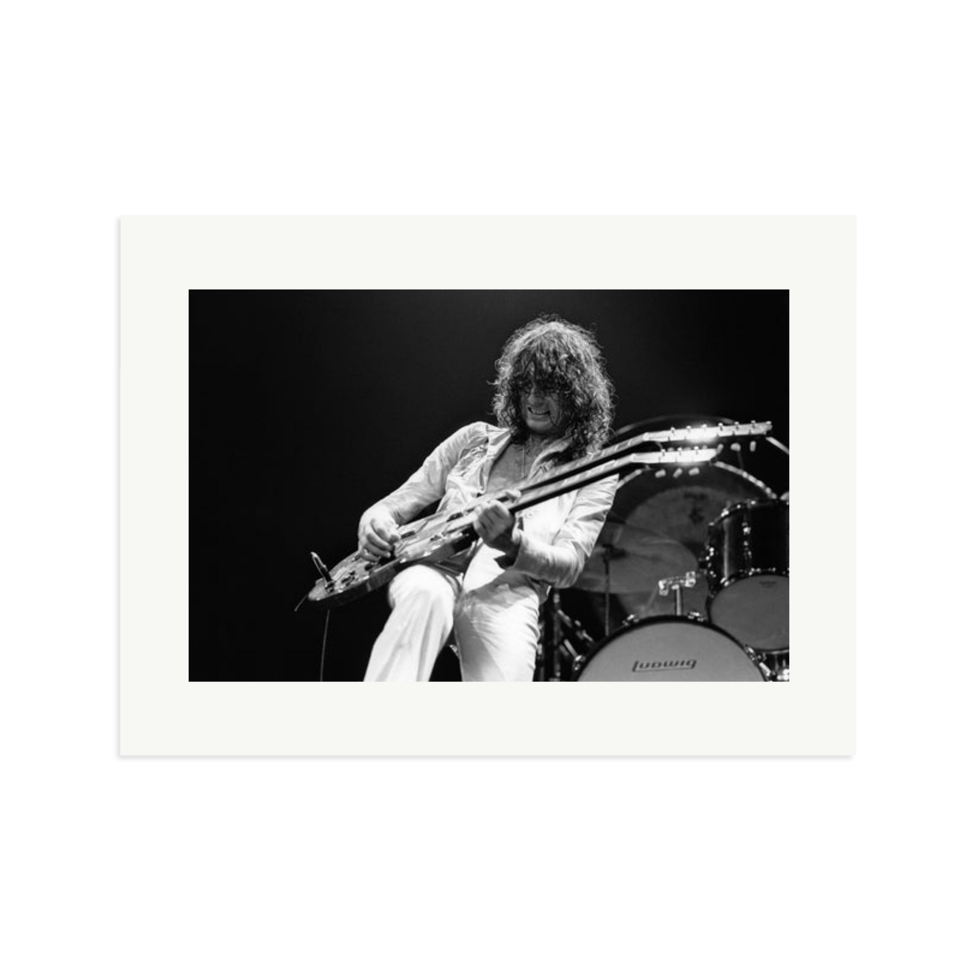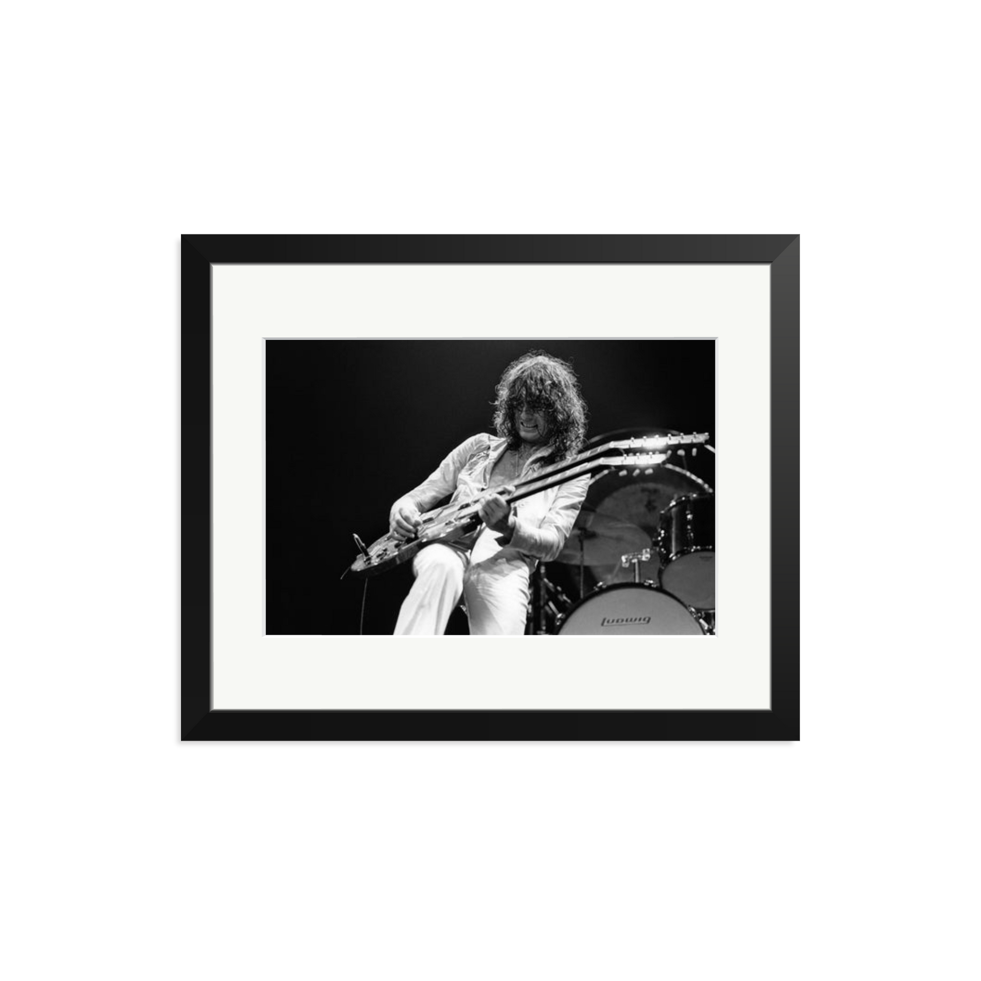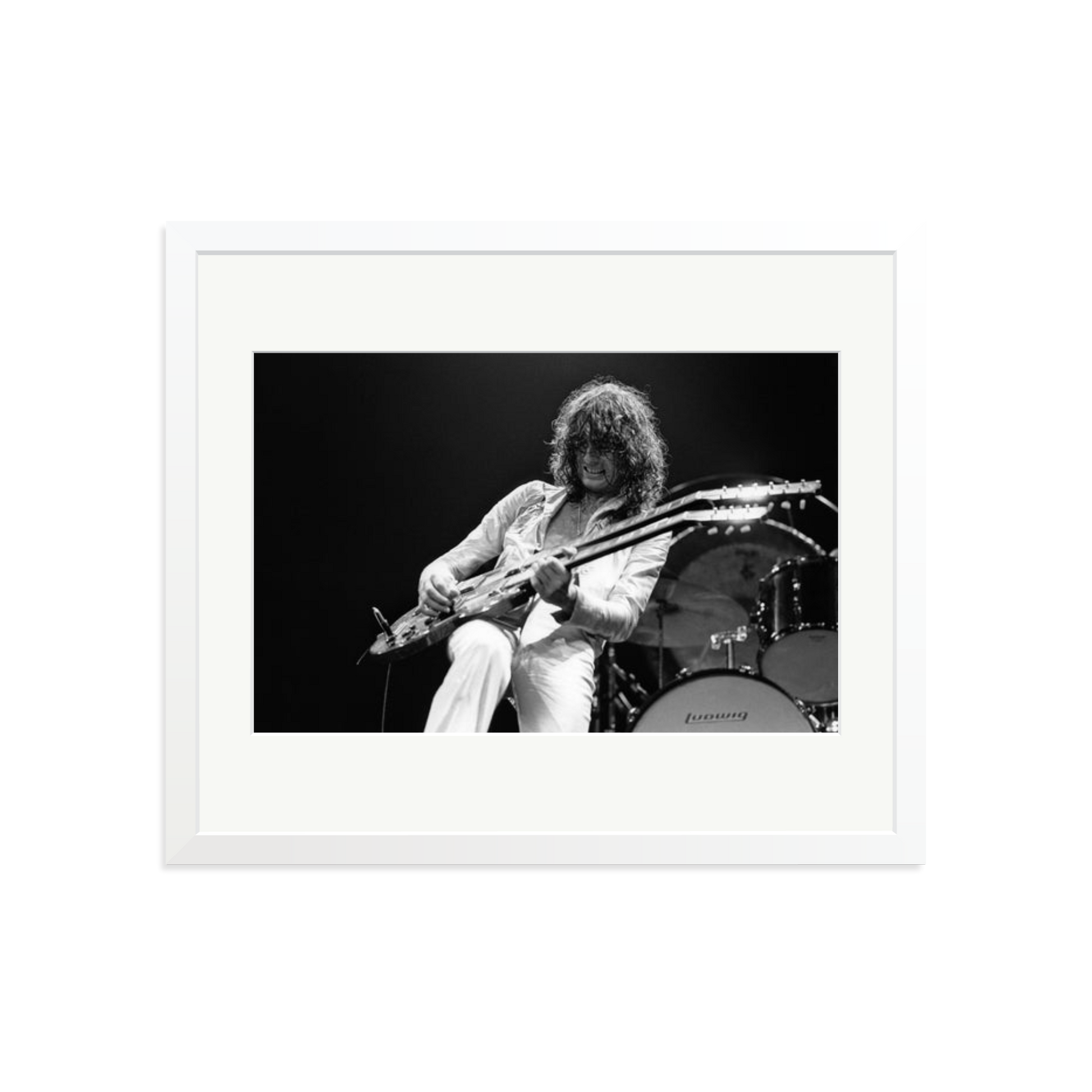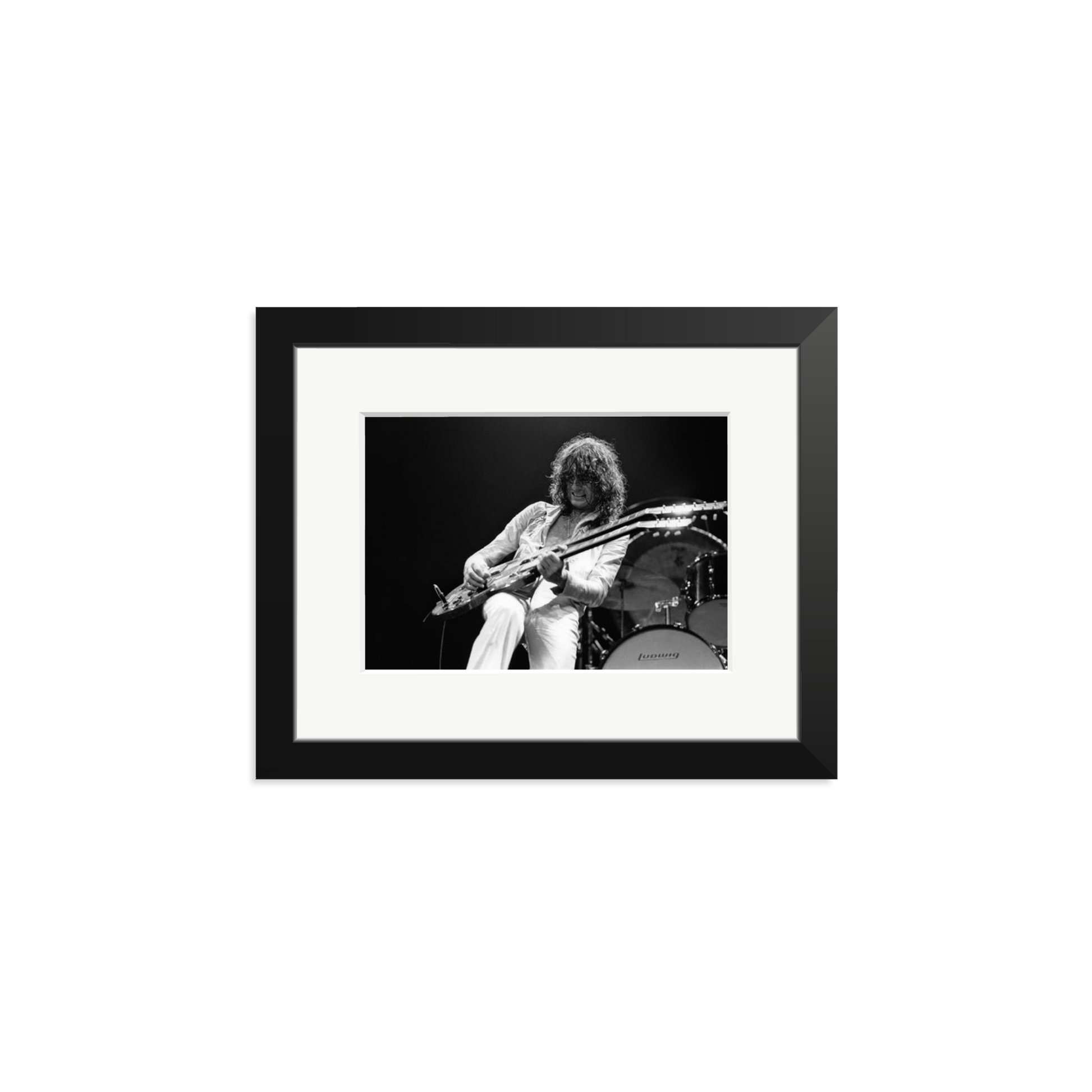 This striking photograph captures Jimmy Page on stage in 1977, a full-throttle moment of rock history. Limited to 495 prints, each piece is produced on archival Fuji Crystal Archive paper, framed in solid wood, and delivered ready to hang. It is a high-voltage visual you can own and display.