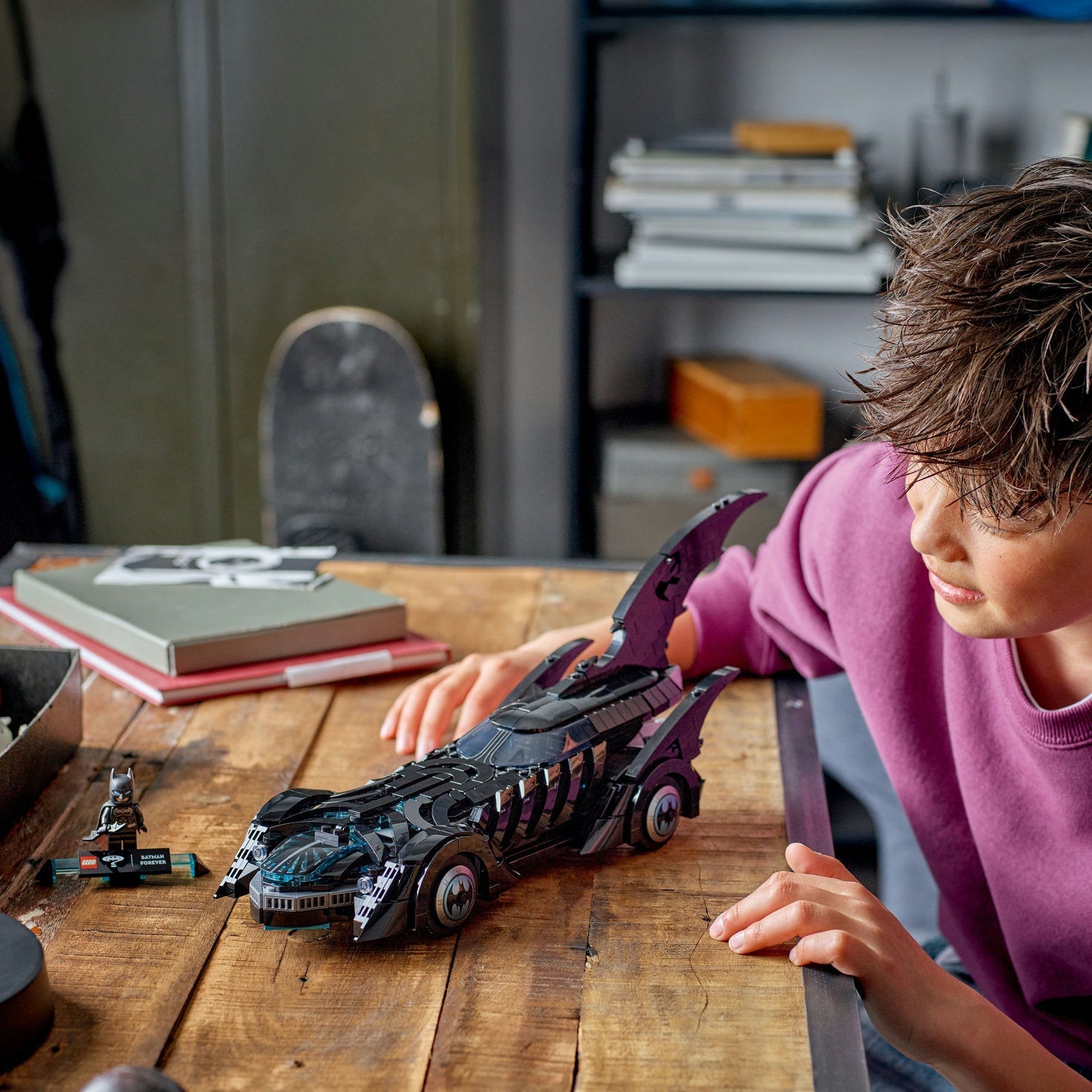 Gotham's most flamboyant ride gets the LEGO treatment with the Batman Forever Batmobile — a 909-piece homage to the wild, neon-lit design from Joel Schumacher's 1995 film. The model captures every outrageous curve and vent of Val Kilmer's on-screen cruiser, from the exposed ribbed fins to the elongated hood and rear flame jet. Measuring over 16 inches long, it's built for display, complete with a stand, nameplate, and a suited-up Batman minifigure. Inside, a twin-seat cockpit hides intricate console detailing beneath a removable canopy, while the jet-black bodywork gleams under transparent blue accents that glow like Gotham at midnight. More sculpture than toy, it's a collector's centerpiece that bridges two eras — the excess of '90s Batman and the precision of modern LEGO engineering.