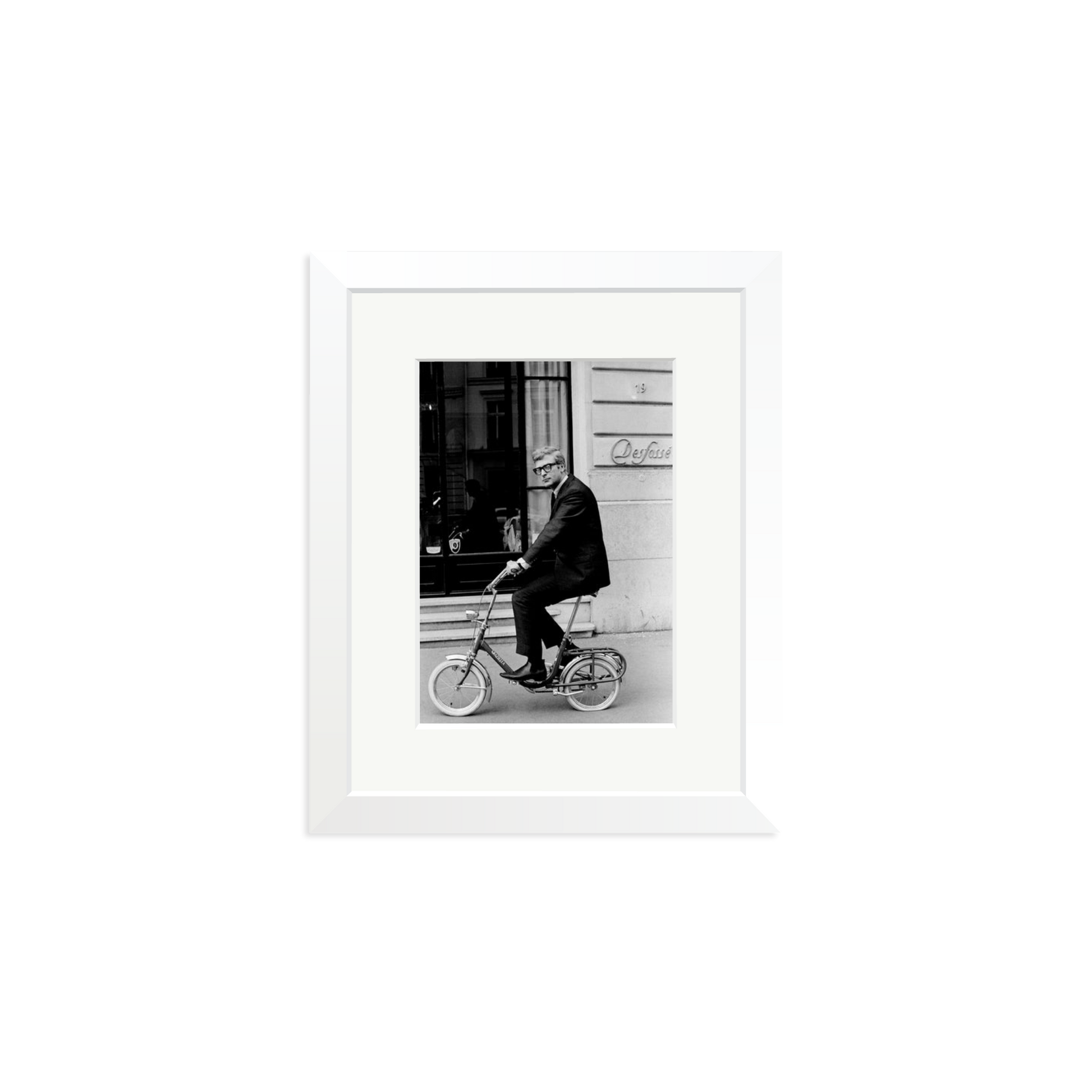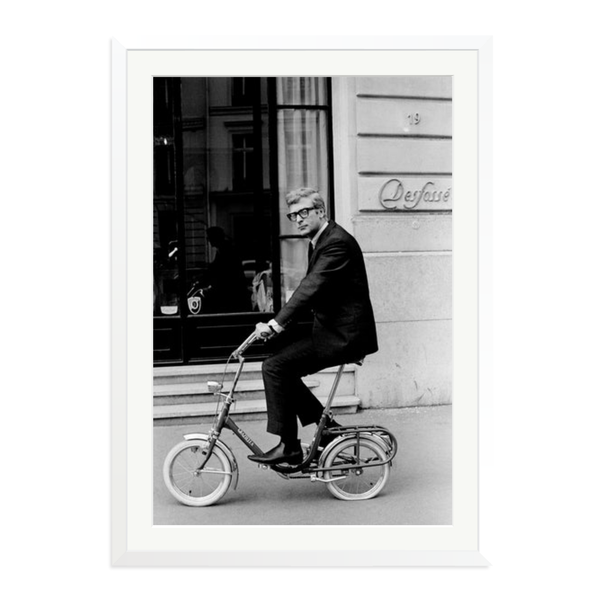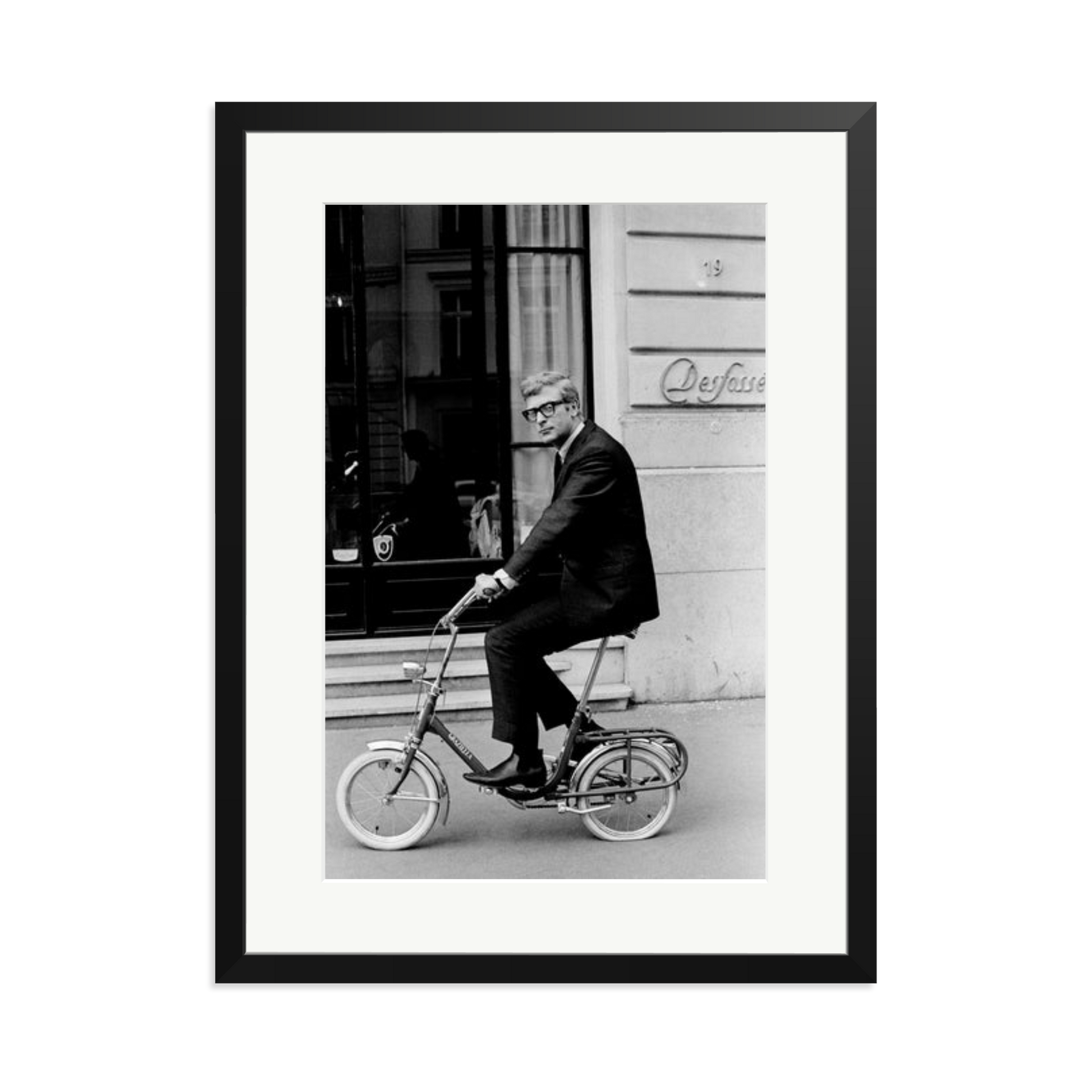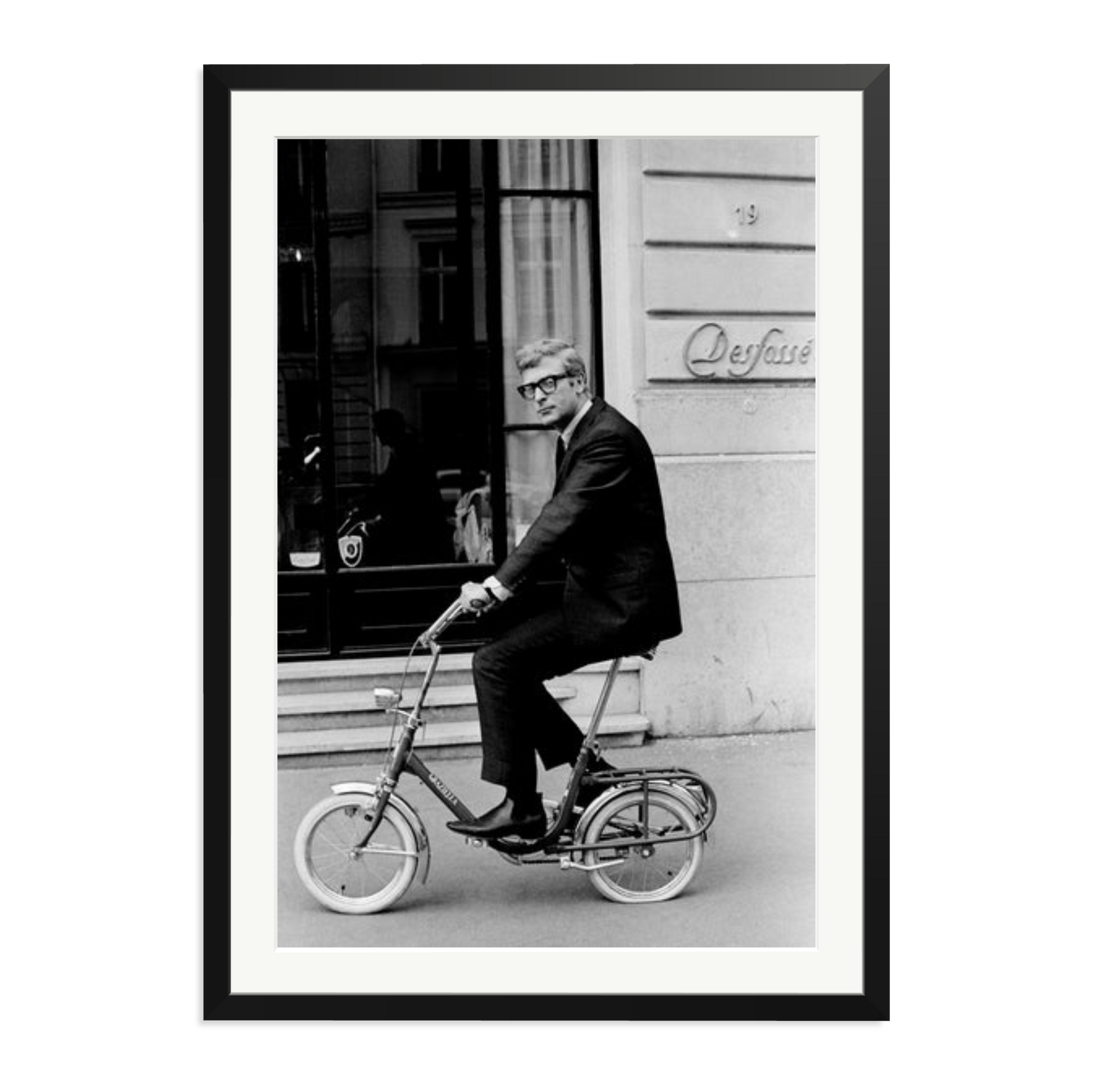 Michael Caine pedals a folding bike in 1966 Paris, captured in a framed archival print.