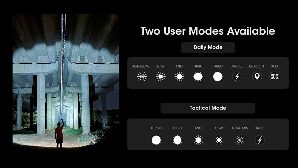 A compact duty light with serious output, this rechargeable flashlight pushes 3,300 lumens and a beam that reaches over 550 yards. Multiple brightness levels and strobe, beacon, and SOS modes cover everything from daily use to emergency situations, with separate Tactical and Daily settings for quick access. An onboard sensor automatically reduces brightness at close range to cut glare and heat, while power comes from a 5300mAh battery with USB-C charging and extended runtimes. The aluminum body is hard-anodized, IP68-rated, and built to take a beating.