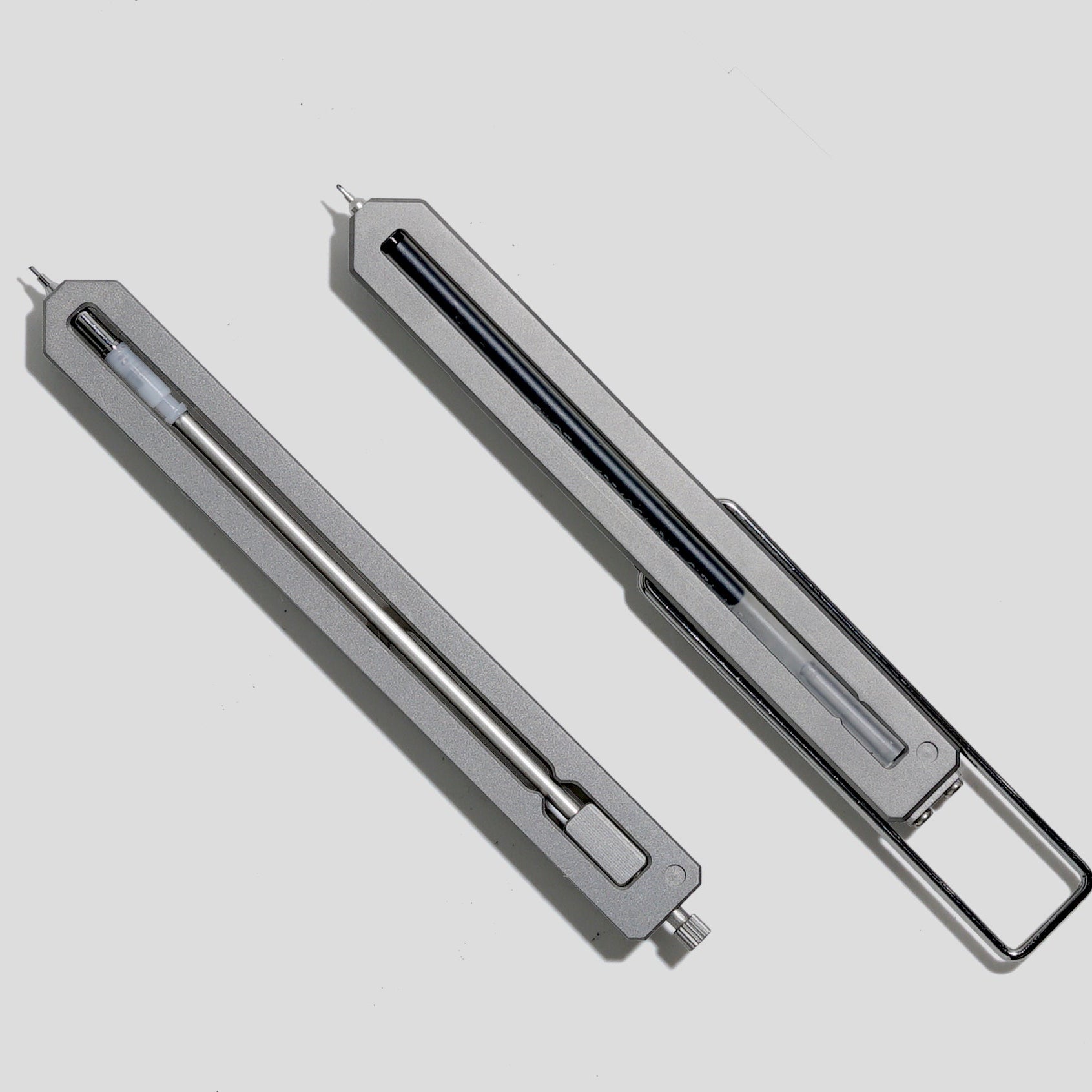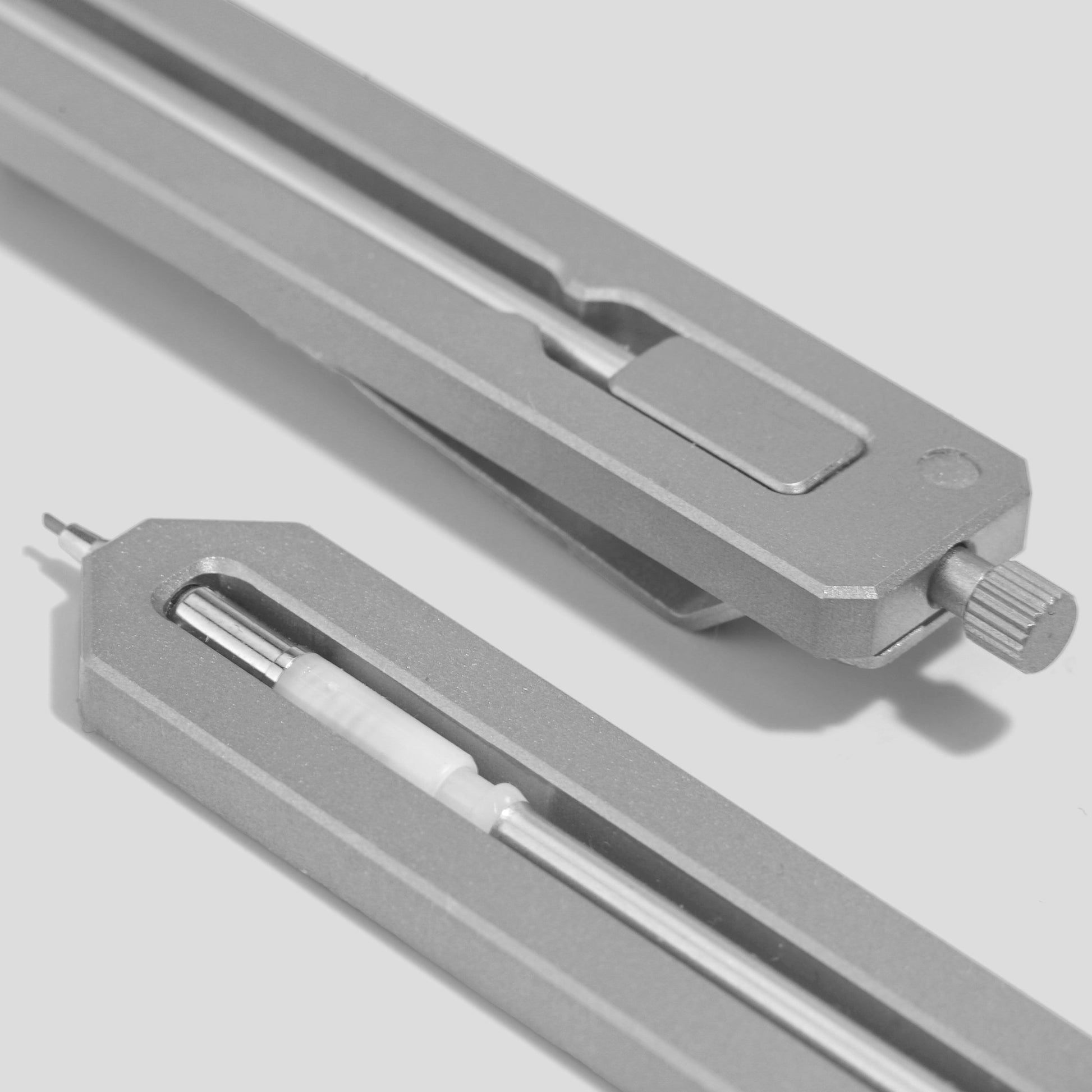 Machined from titanium, the Pencil Type-C is a mechanical bookmark pencil built to slip into a pocket or notebook. It uses a modified Pilot Hi-Tec-C Coleto 0.5mm mechanism housed in precision-cut metal, secured with a knurled knock and nut assembly. Push to advance the lead, unscrew to reload. Designed for the quiet rhythm of writing and sketching, it brings back the tactile ease of a real pencil in a form that lasts forever.