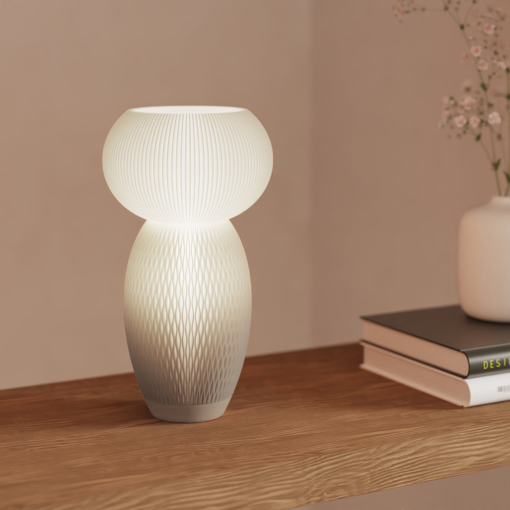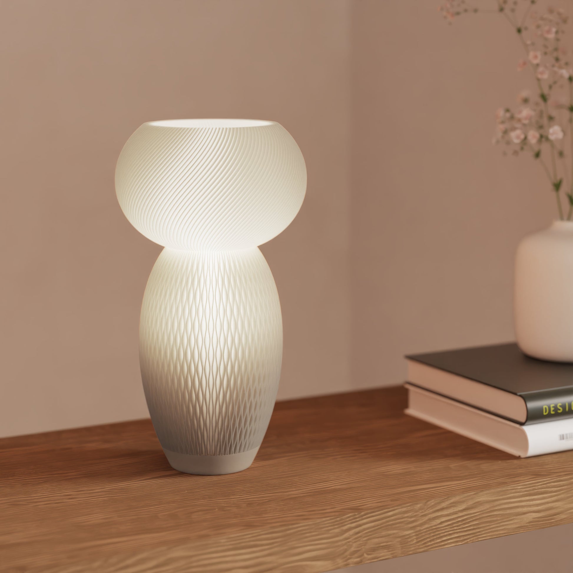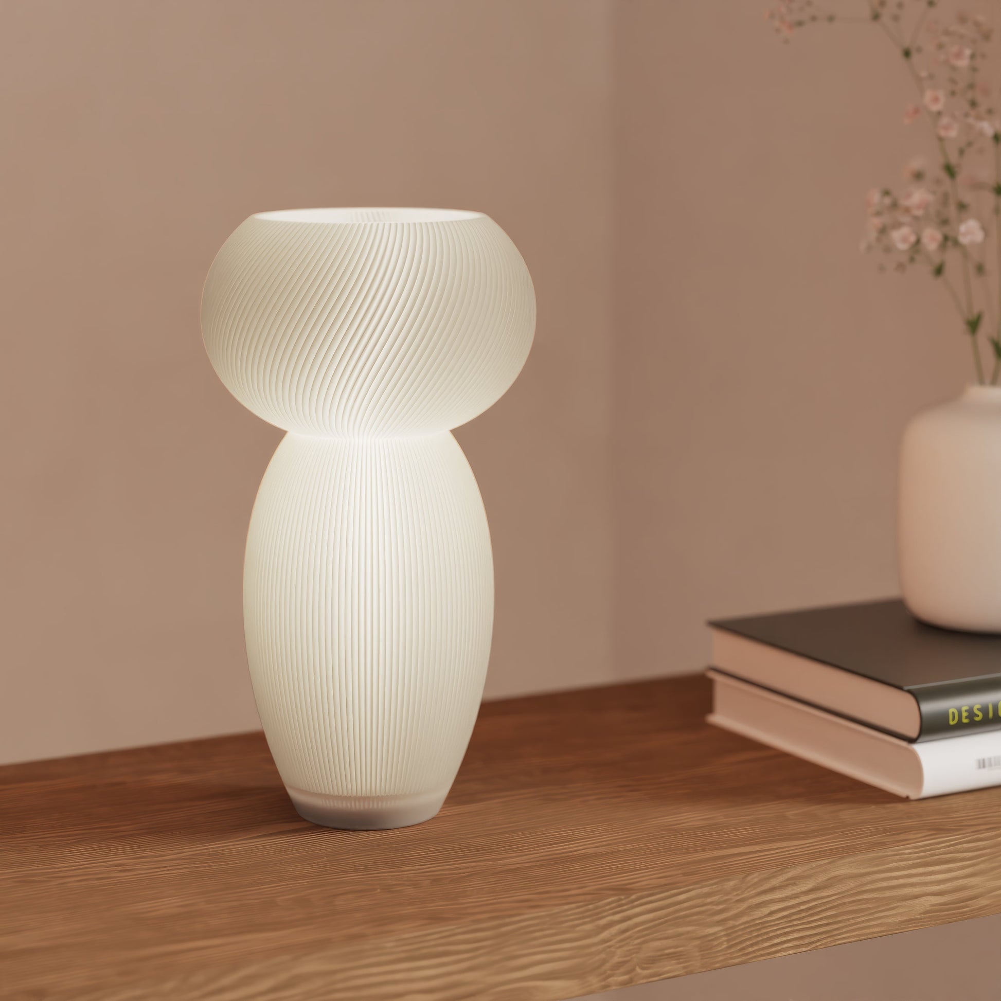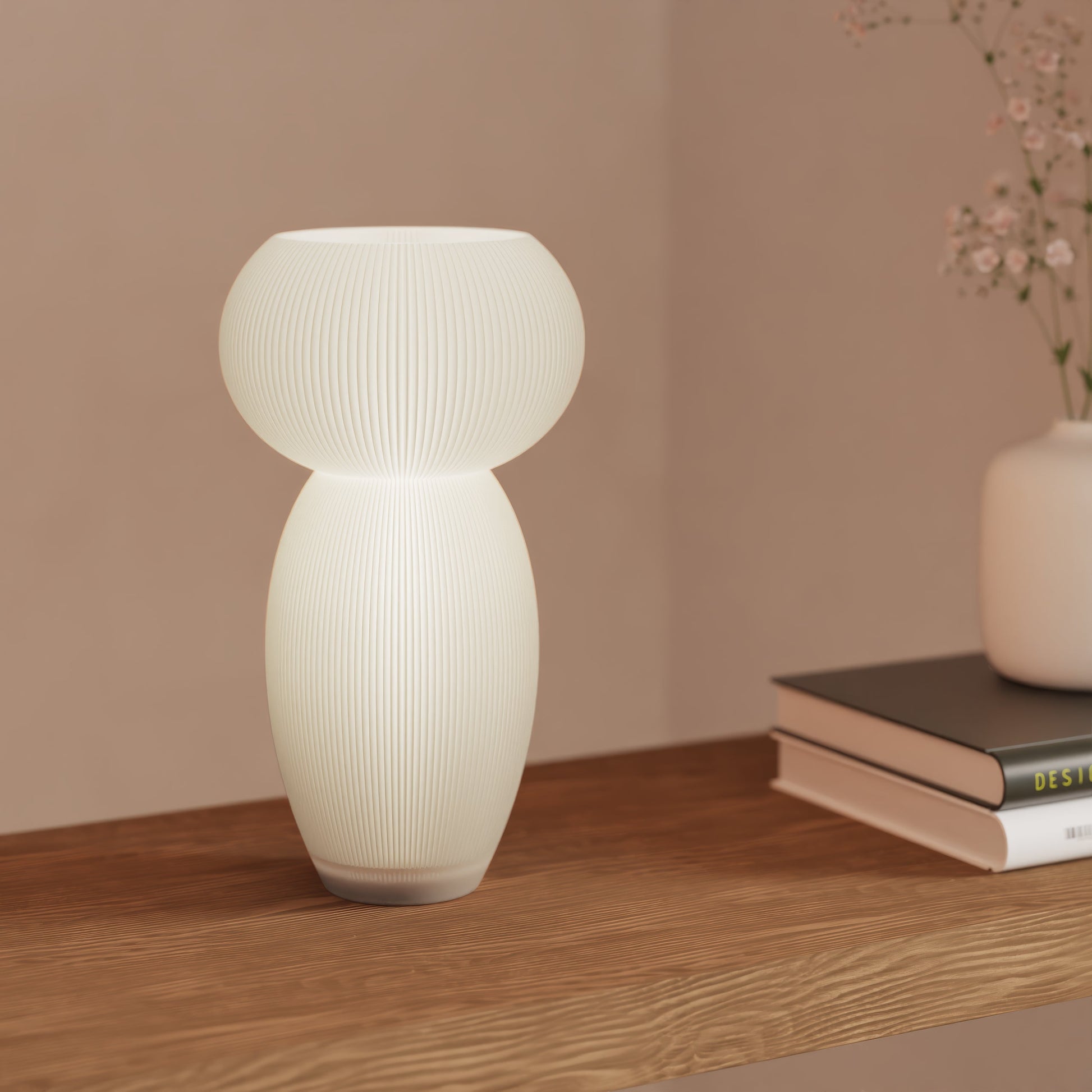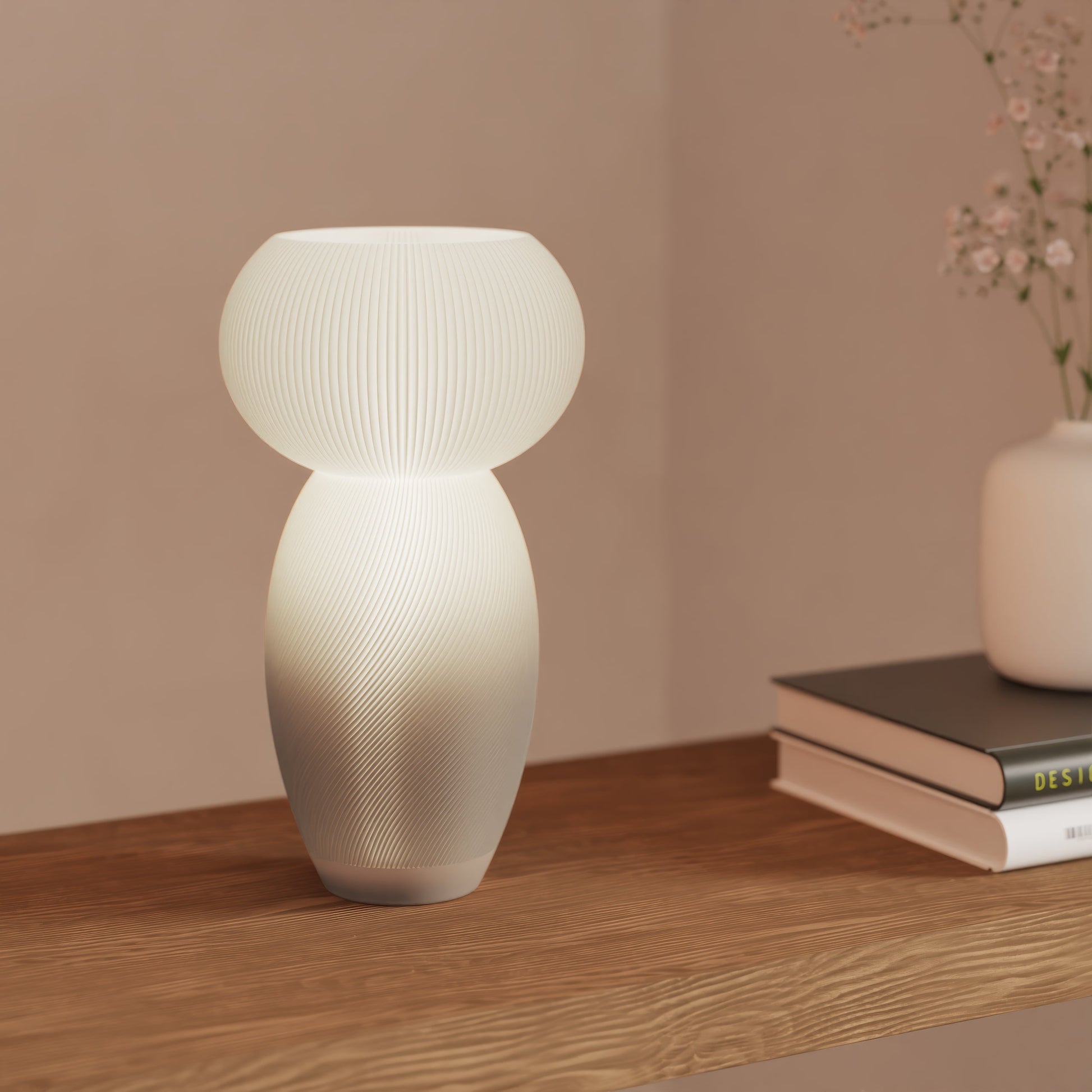 This sculptural light adds warmth and depth with smooth curves and a soft caramel glow.