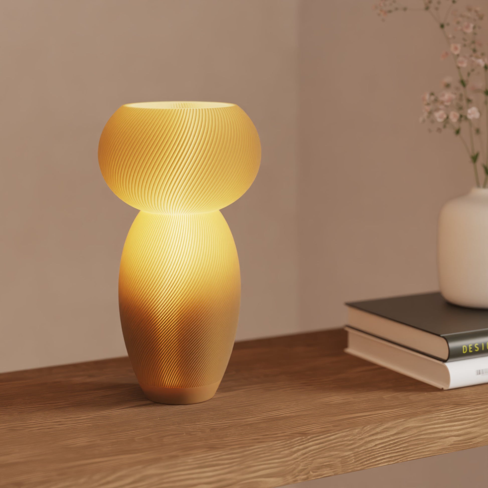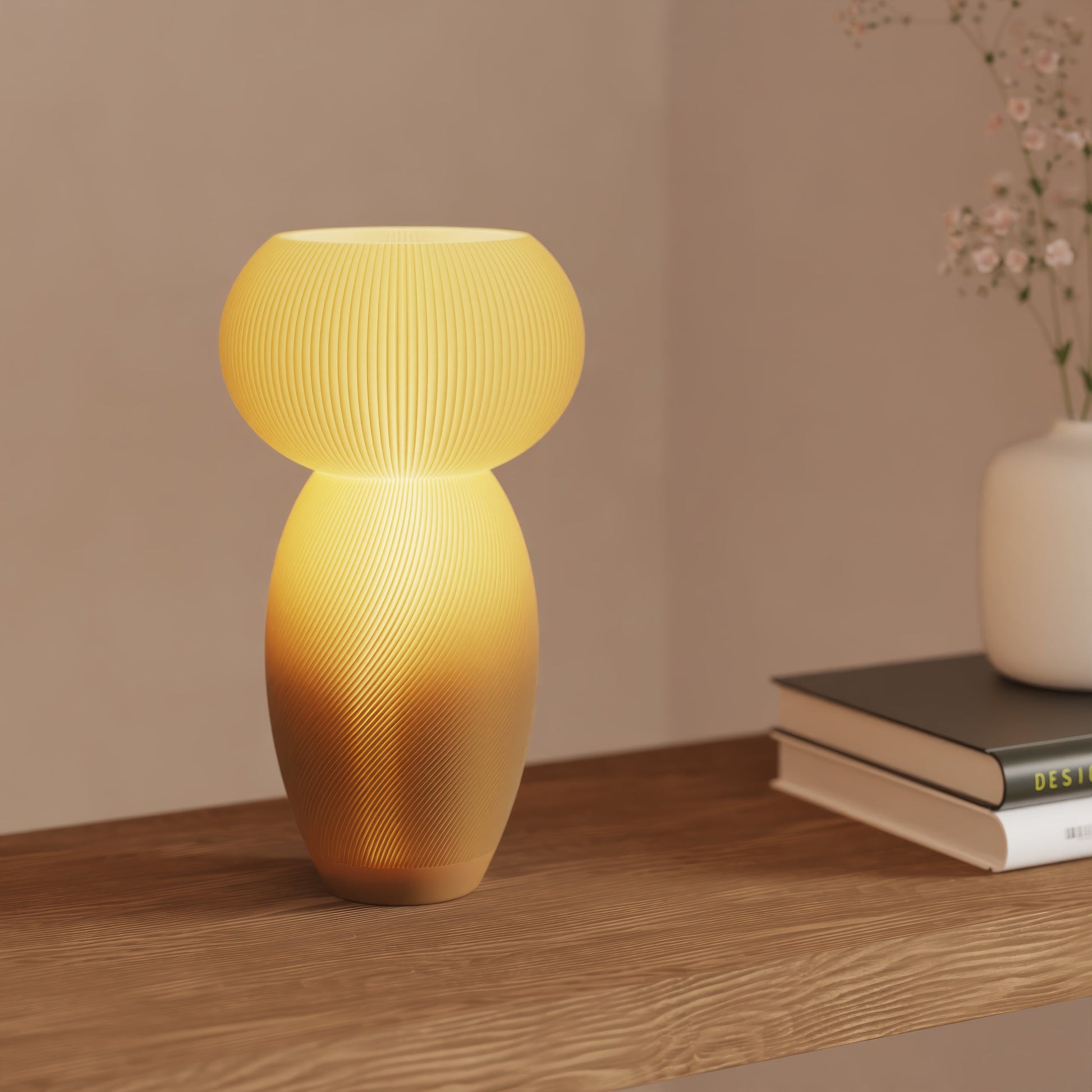 This sculptural light adds warmth and depth with smooth curves and a soft caramel glow.