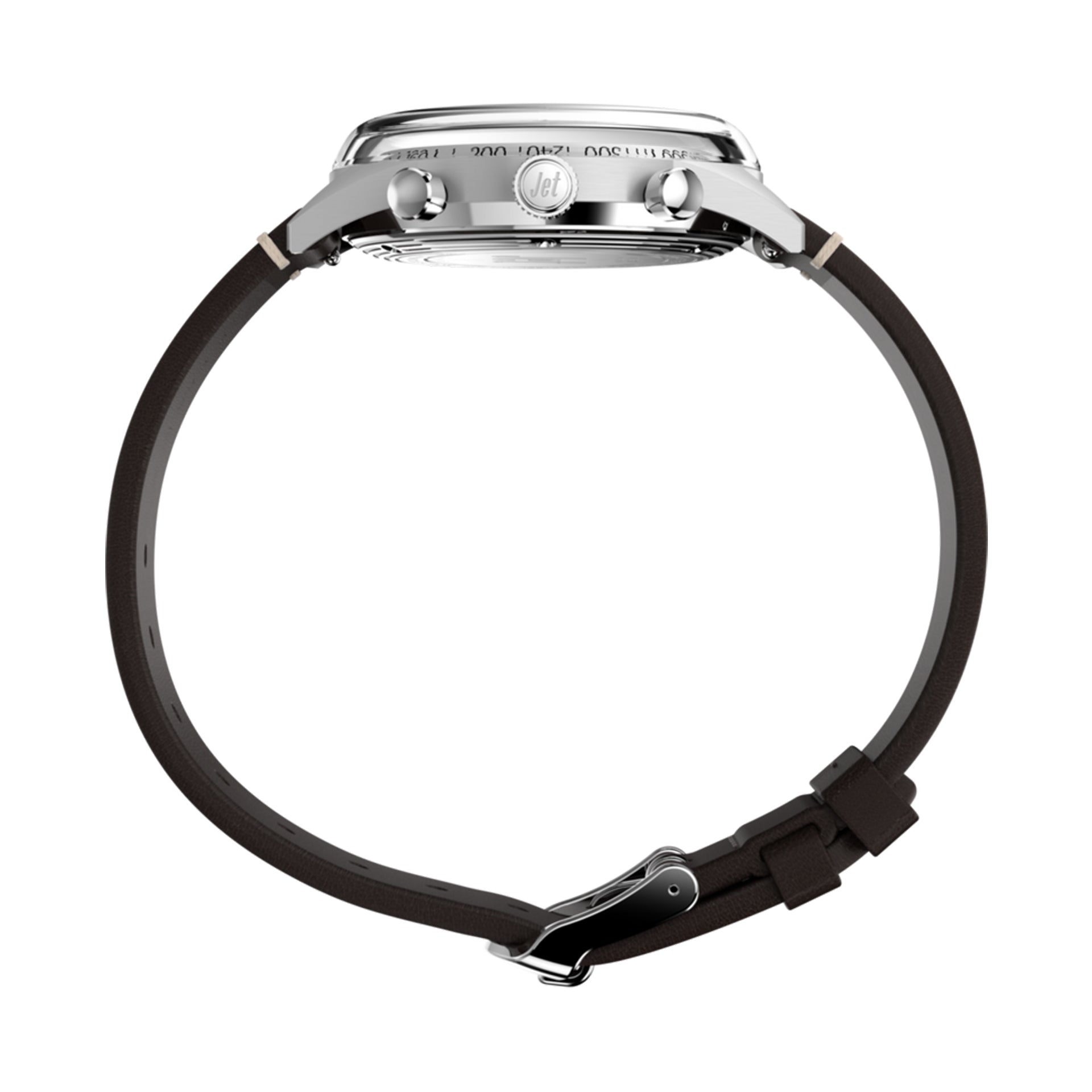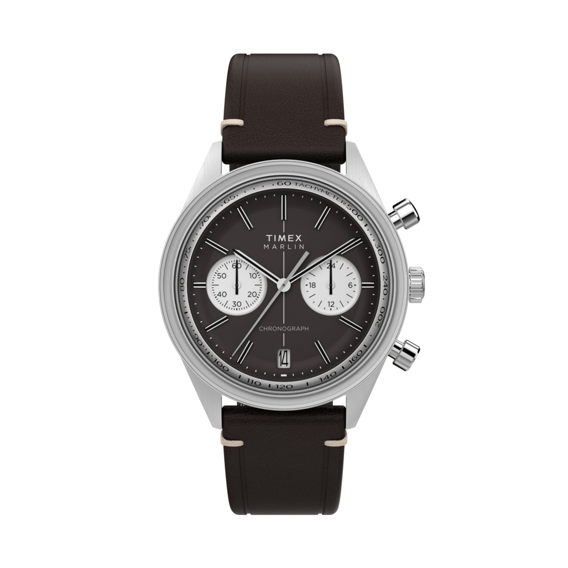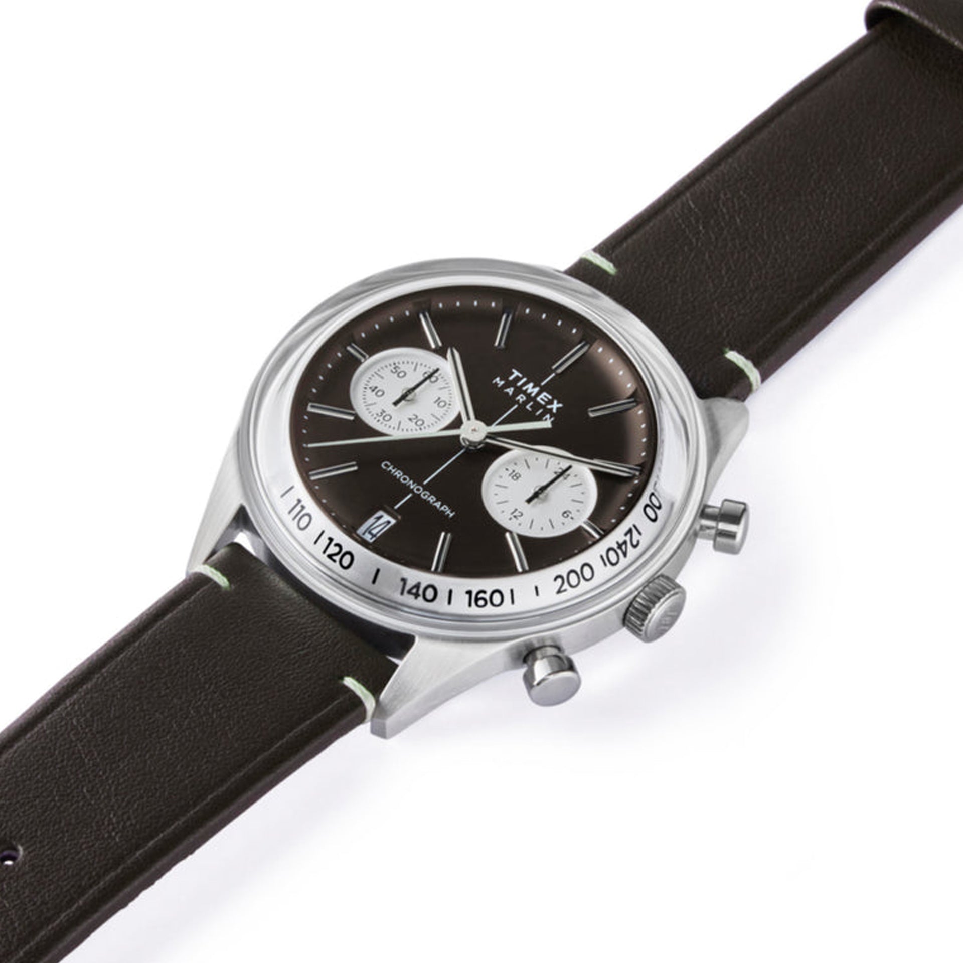 A futuristic silhouette pulled straight from the optimism of the Jet Age, the Timex Marlin Jet Chronograph reimagines mid-century modernism for the wrist. Its domed Hesalite crystal stretches edge to edge, creating a seamless lens over the grooved tachymeter bezel and retro dial beneath—available in either a crisp panda silver or deep obsidian brown. A 40mm stainless steel case houses a reliable quartz chronograph movement, pairing function with the kind of sculptural form that defined the ‘60s space race. Finished with your choice of a polished steel bracelet or a sustainably tanned leather strap, it’s a timepiece that looks as sharp at altitude as it does on the ground.